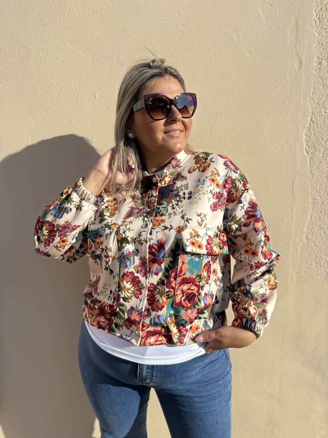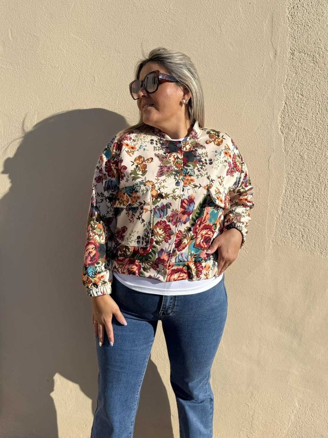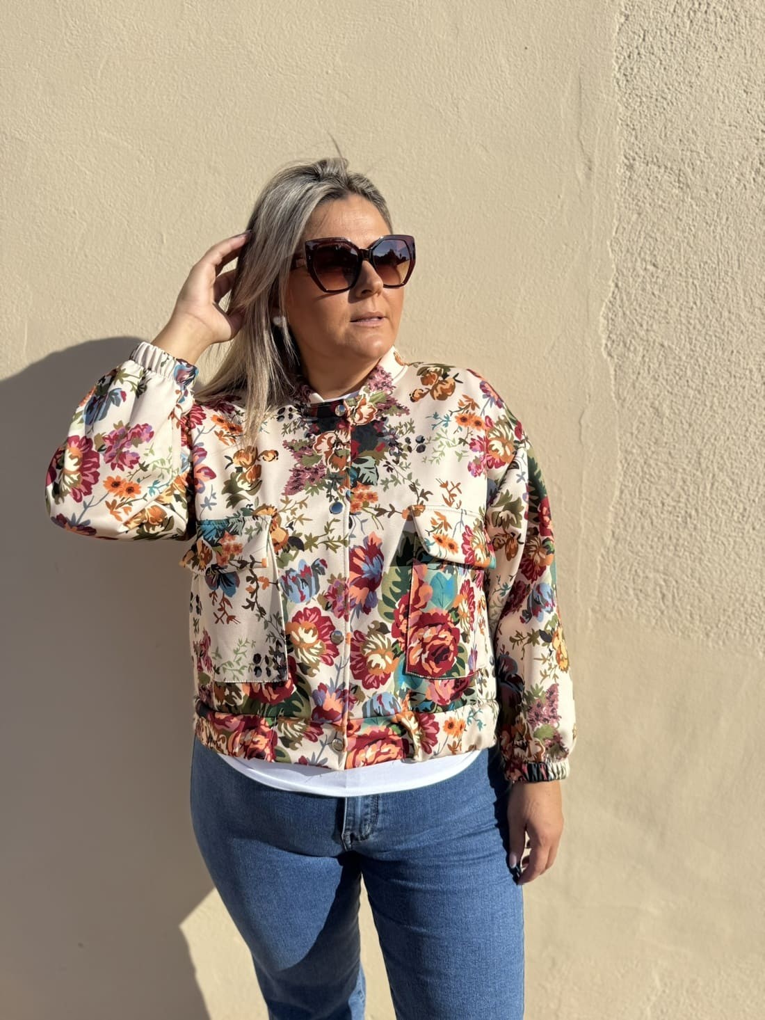 Bomber de manga larga y cuello redondo a la caja con cierre de botones en la parte delantera. Tiene dos bolsillos cuadrados en la parte delantera.