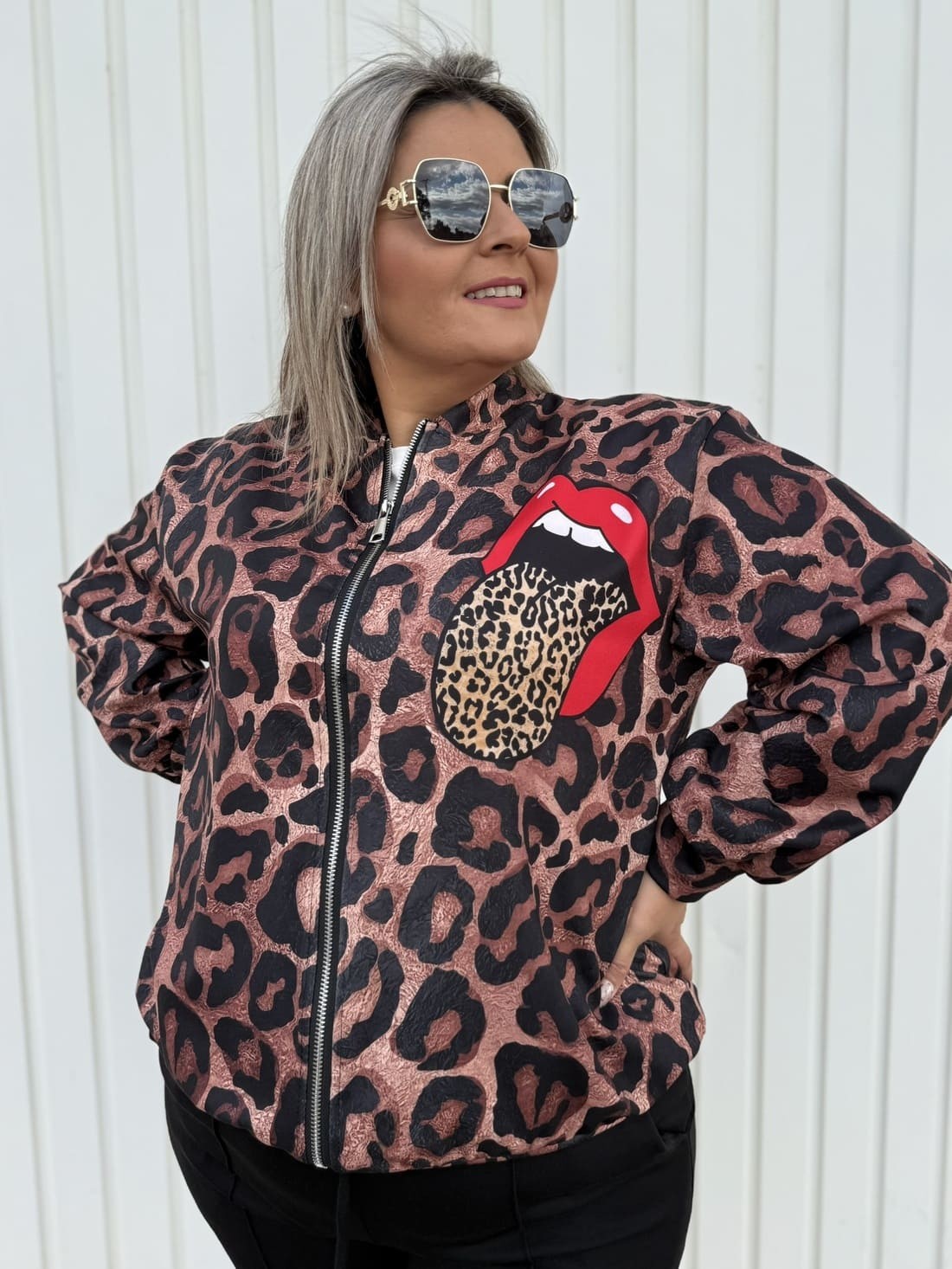 Es estampada de leopardo con detalle de dibujos de boca por la parte delantera y una grande en la parte de atrás.