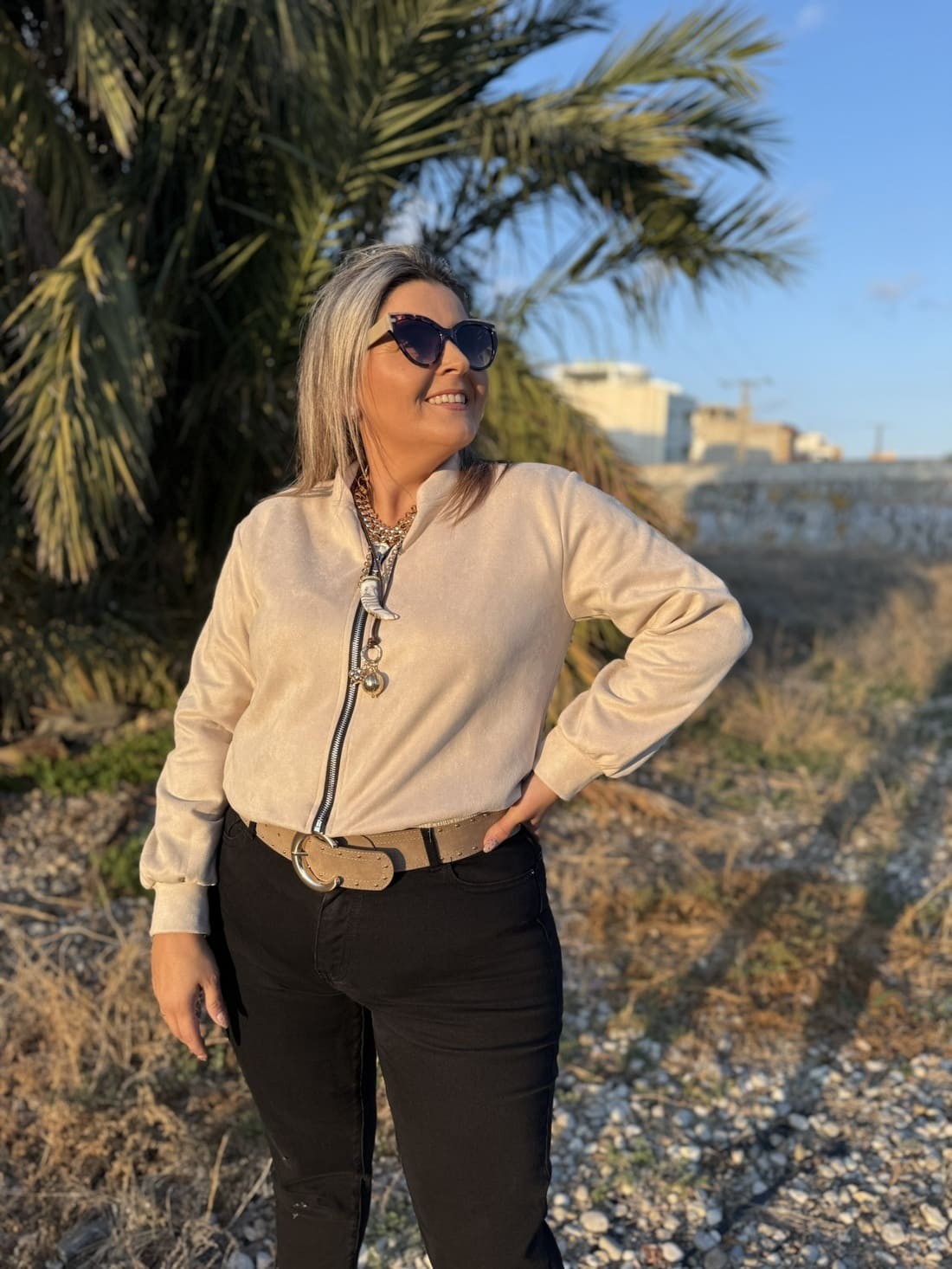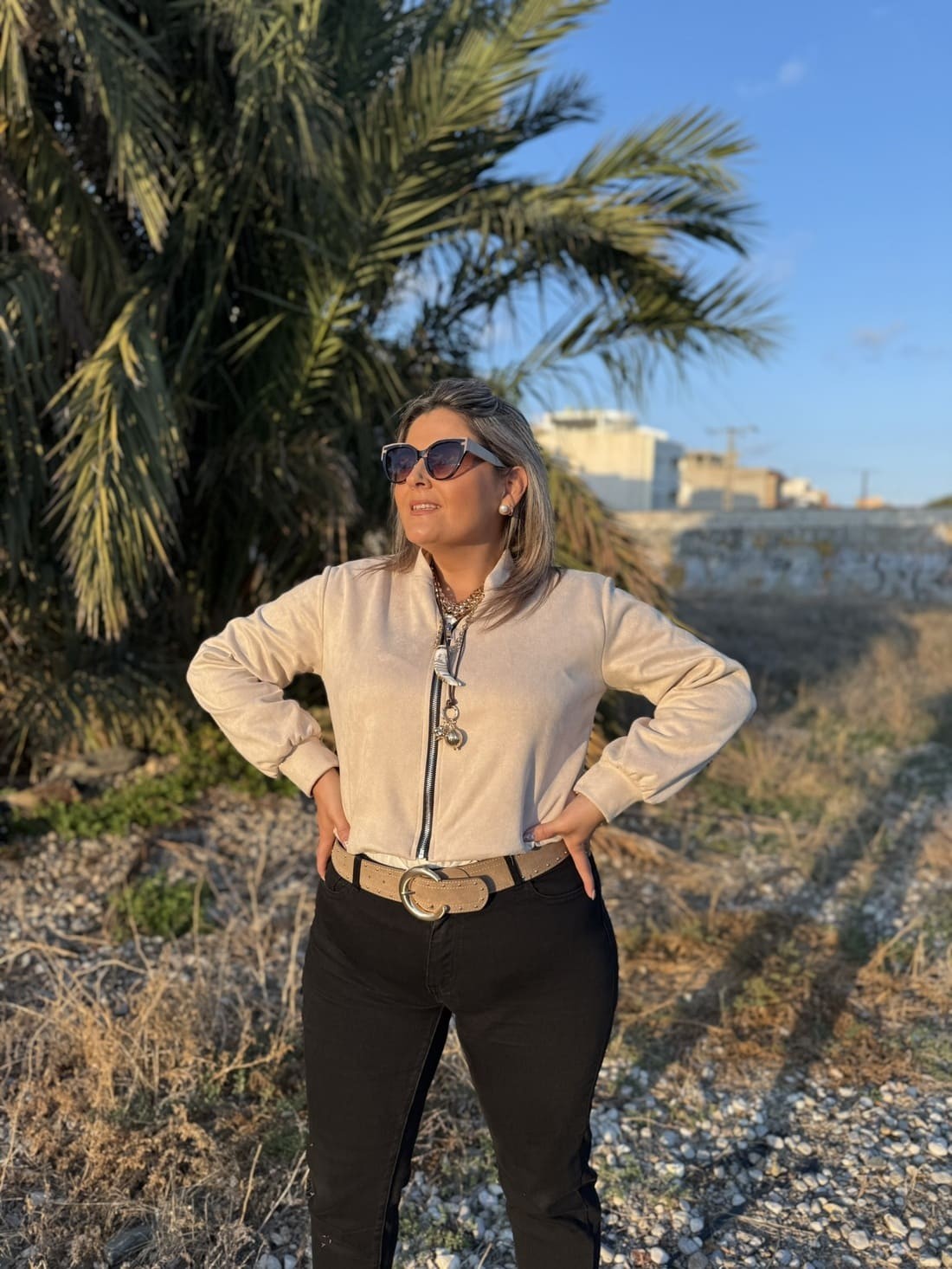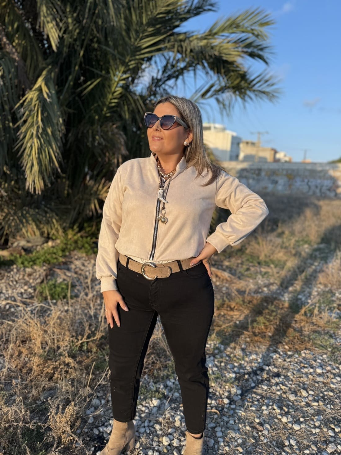 Es una chaqueta de ante de color liso con cierre de cremallera delantero. No tiene bolsillos.