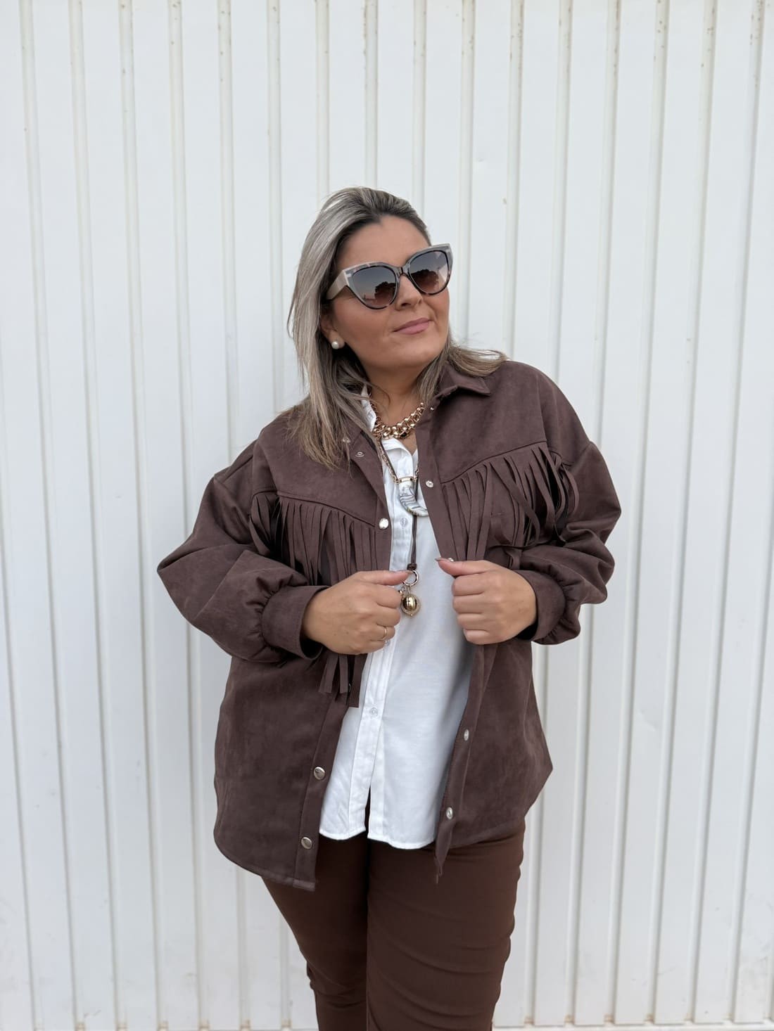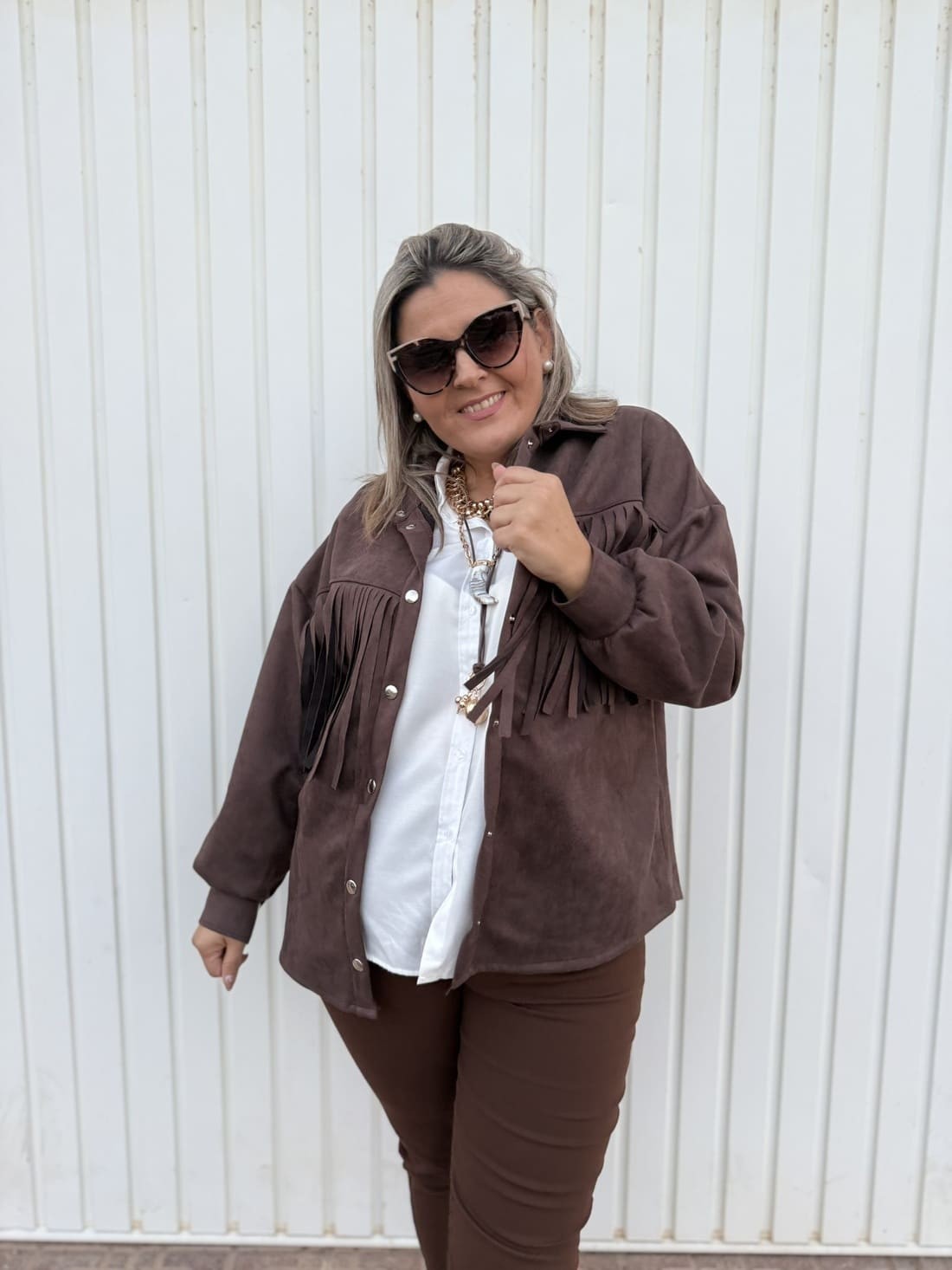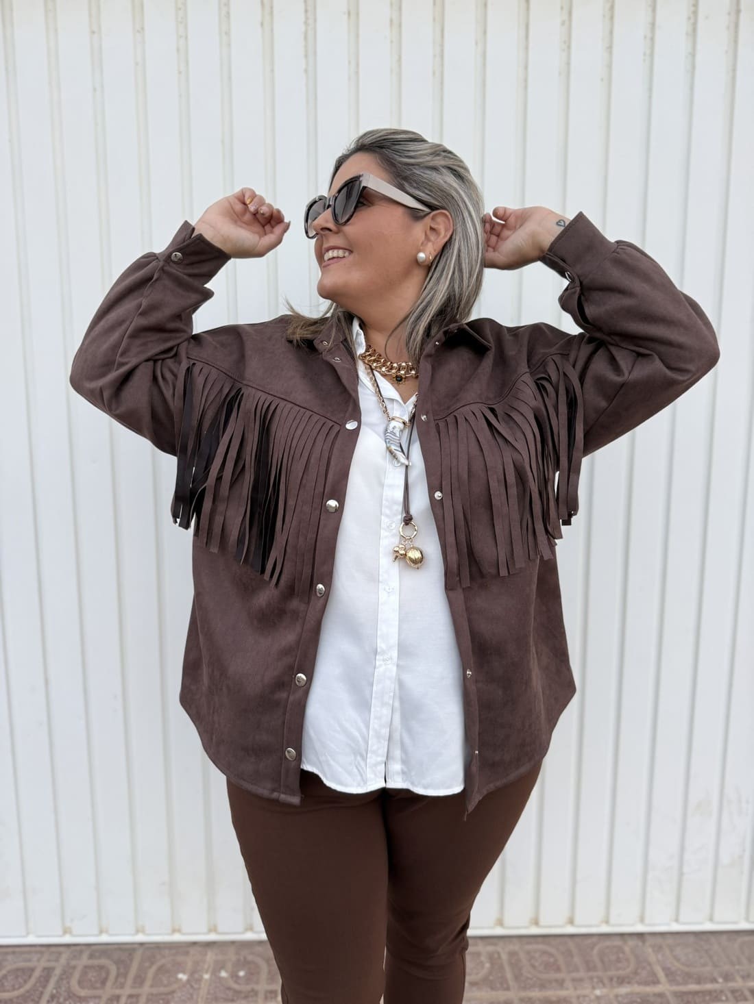 Sobre camisa de antelina de manga larga y cuello camisero con detalle de flecos en la parte del pecho del mismo género y color.