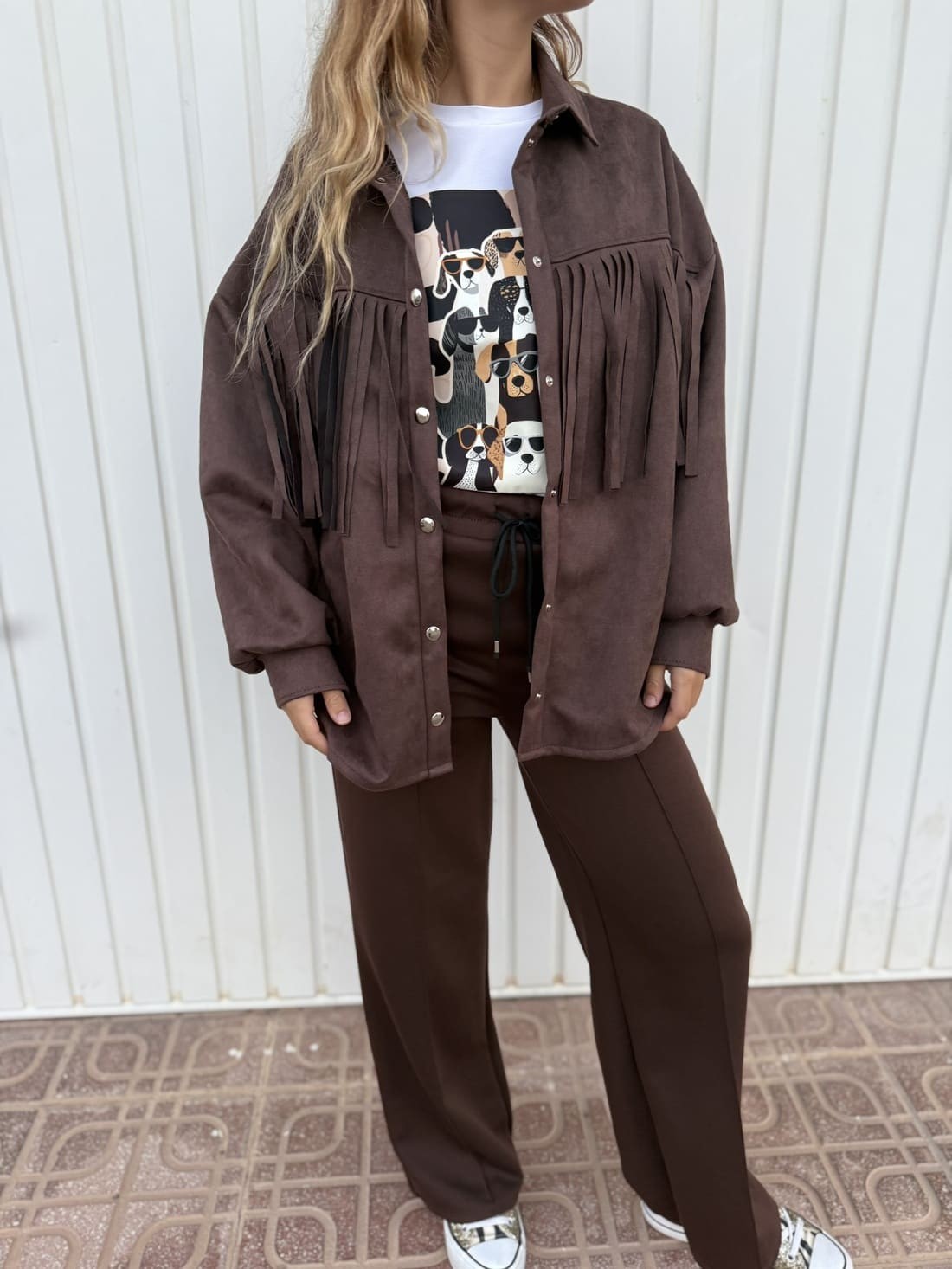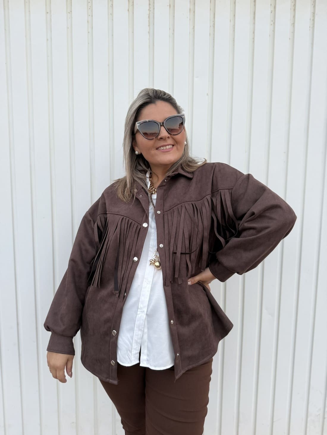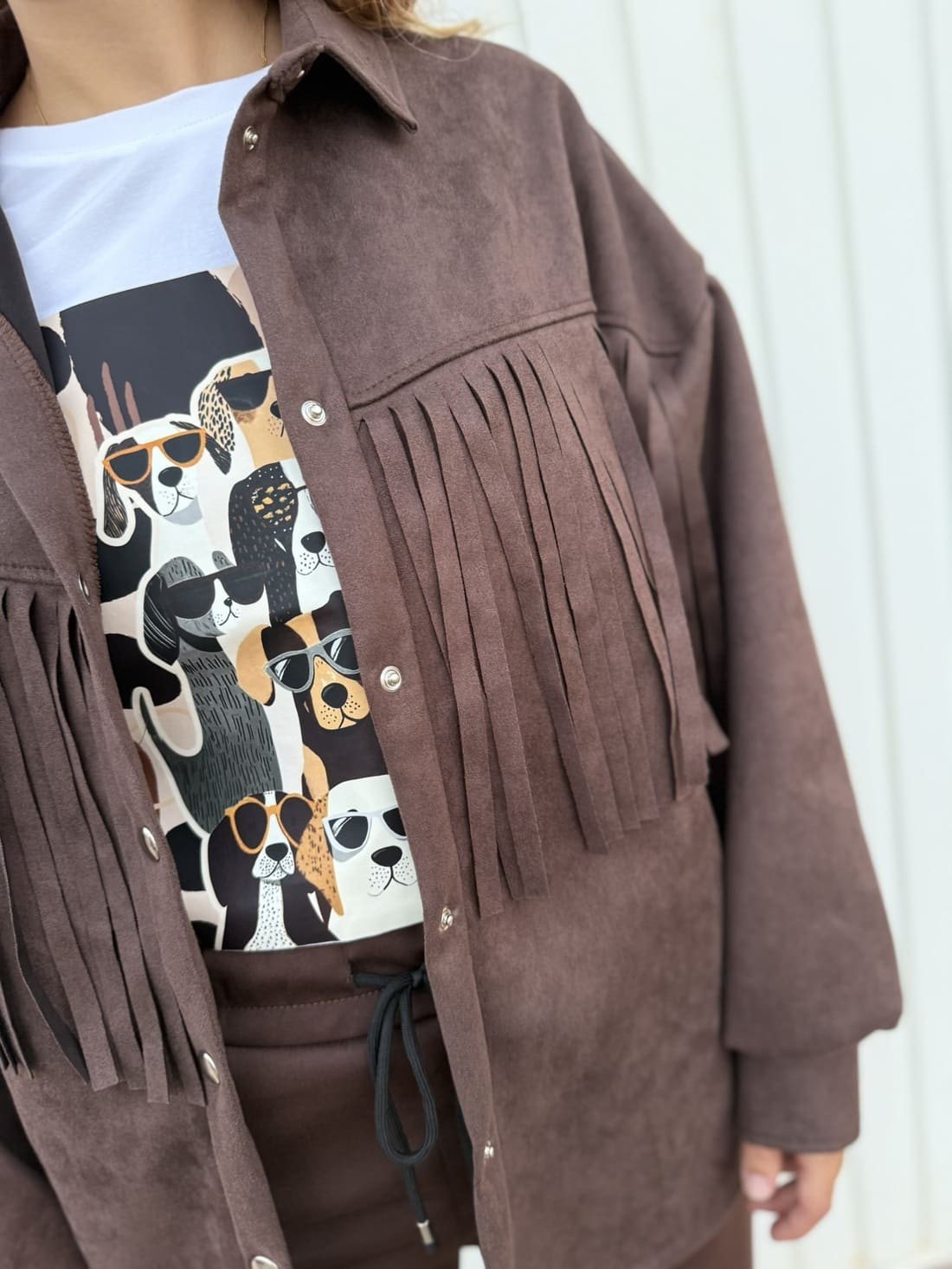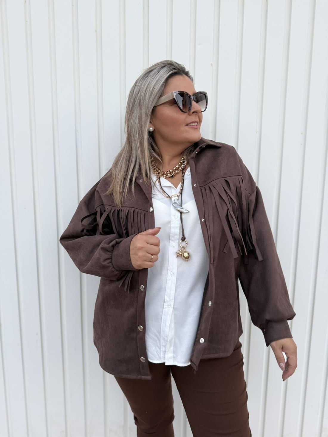 Sobre camisa de antelina de manga larga y cuello camisero con detalle de flecos en la parte del pecho del mismo género y color.