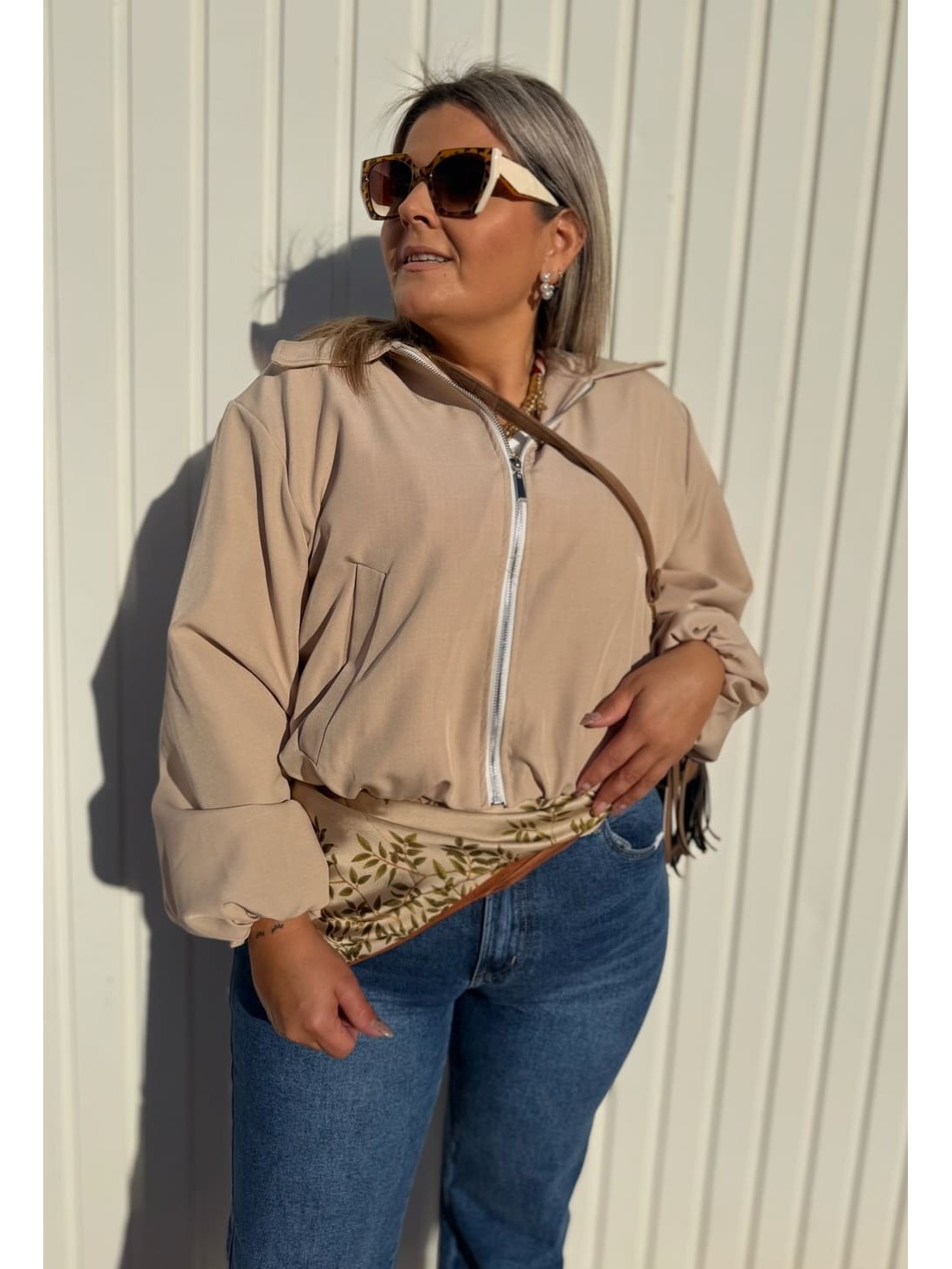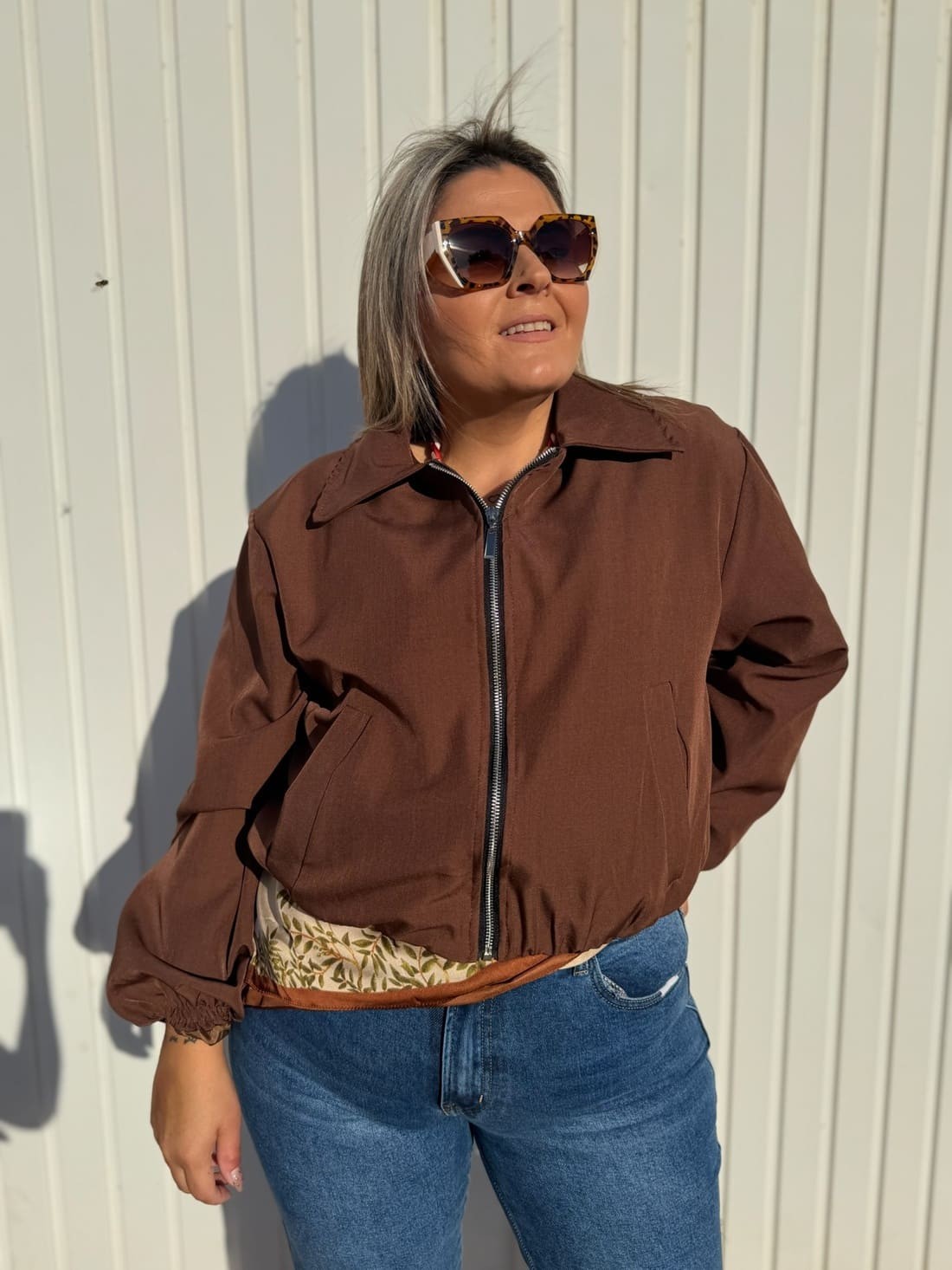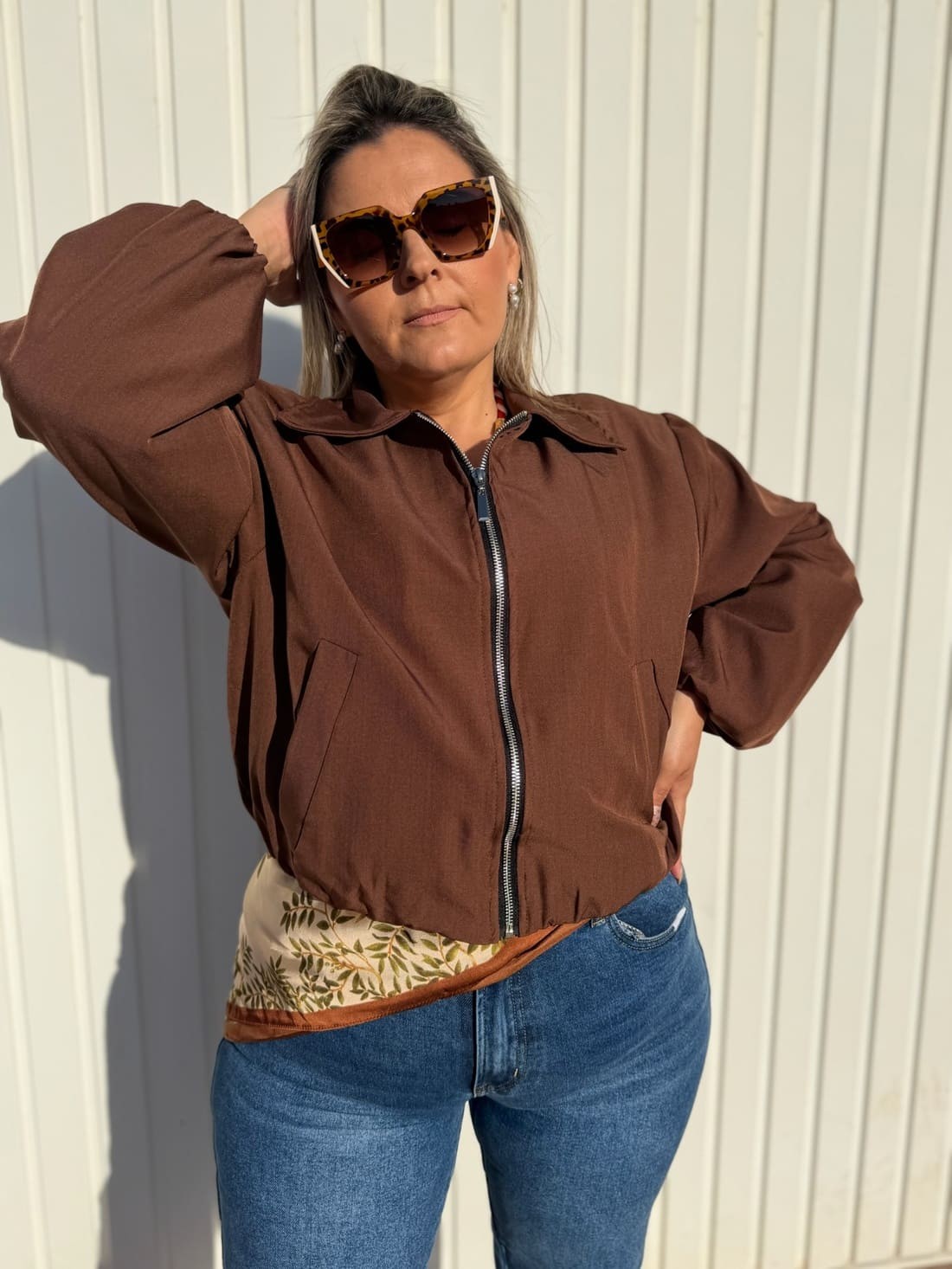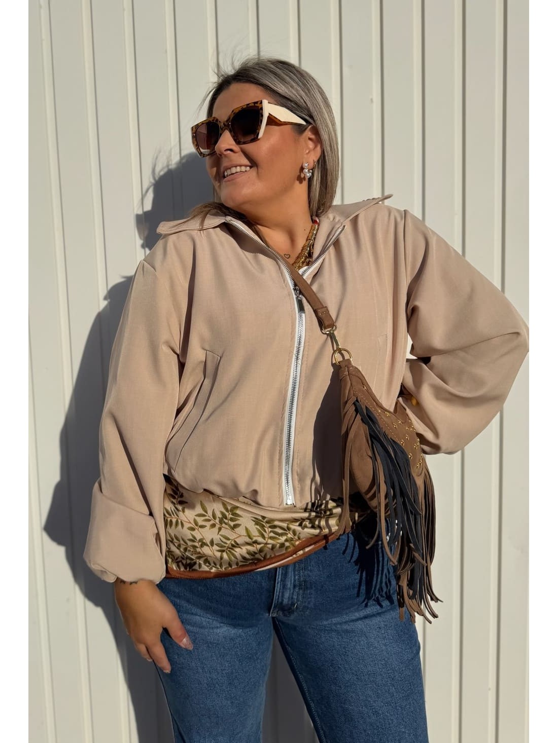 Bomber de manga murciélago larga de cuello con solapa y cierre de cremallera delantera. Lleva forro.