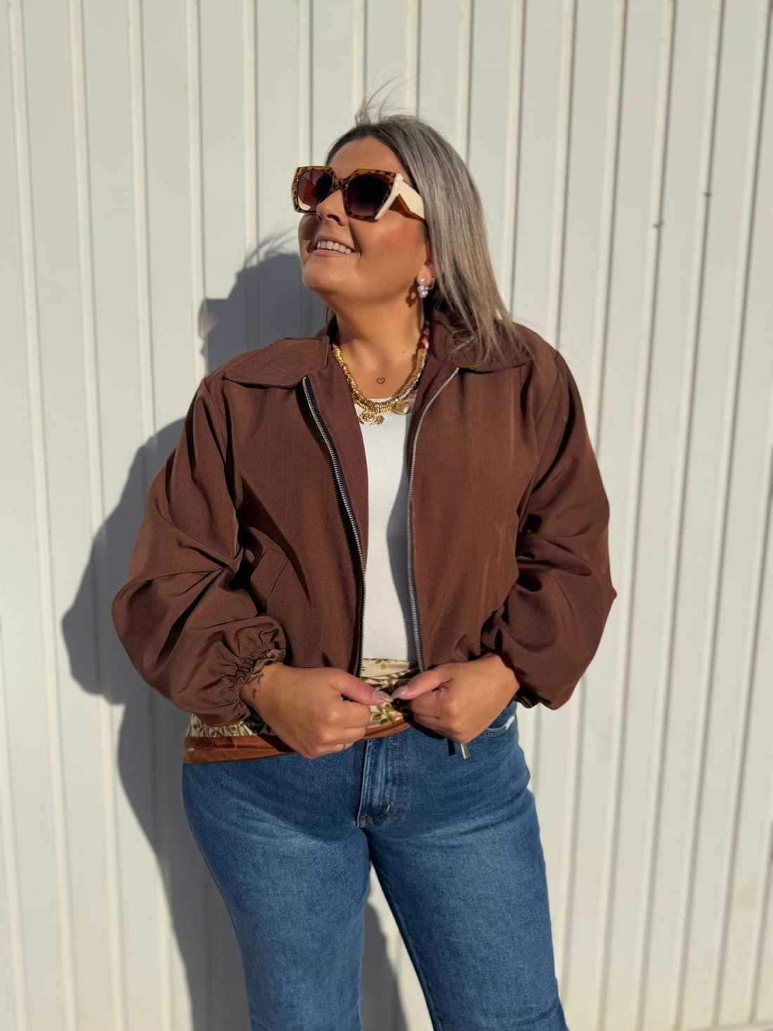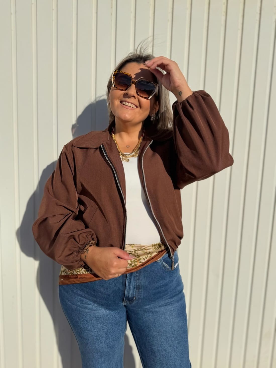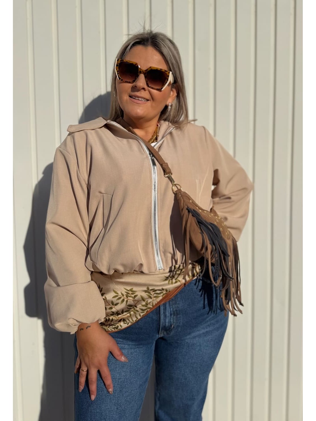 Bomber de manga murciélago larga de cuello con solapa y cierre de cremallera delantera. Lleva forro.