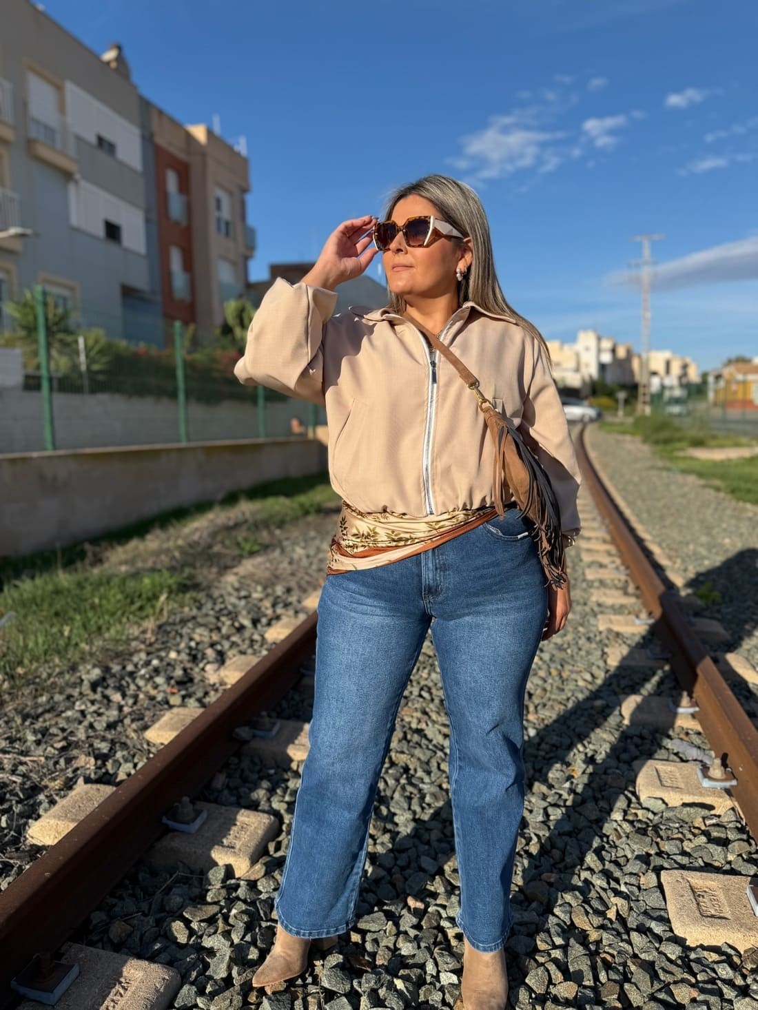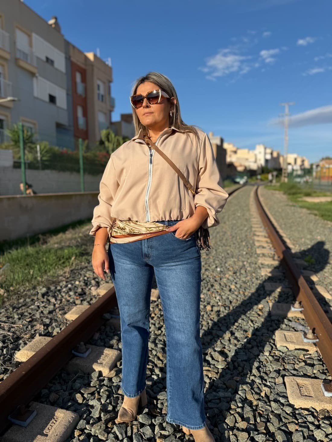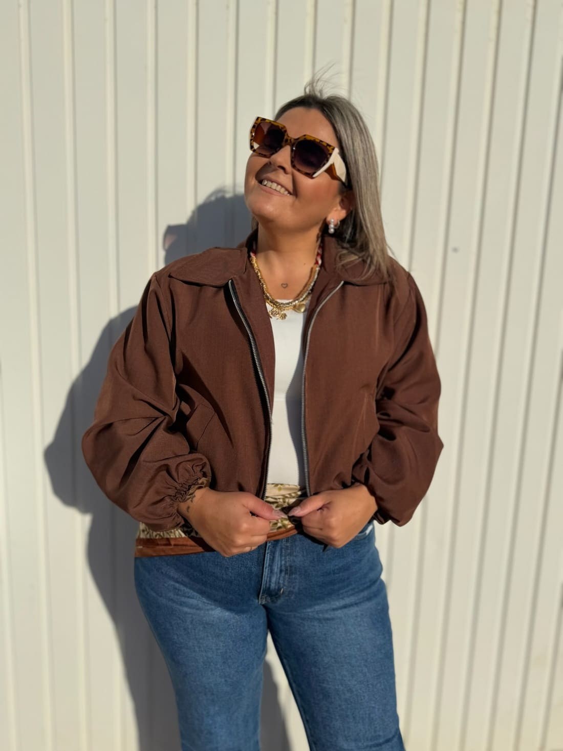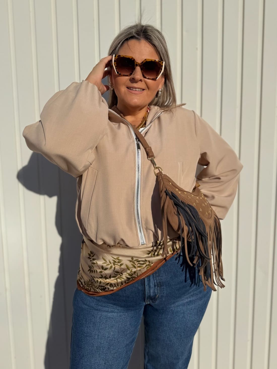 Bomber de manga murciélago larga de cuello con solapa y cierre de cremallera delantera. Lleva forro.