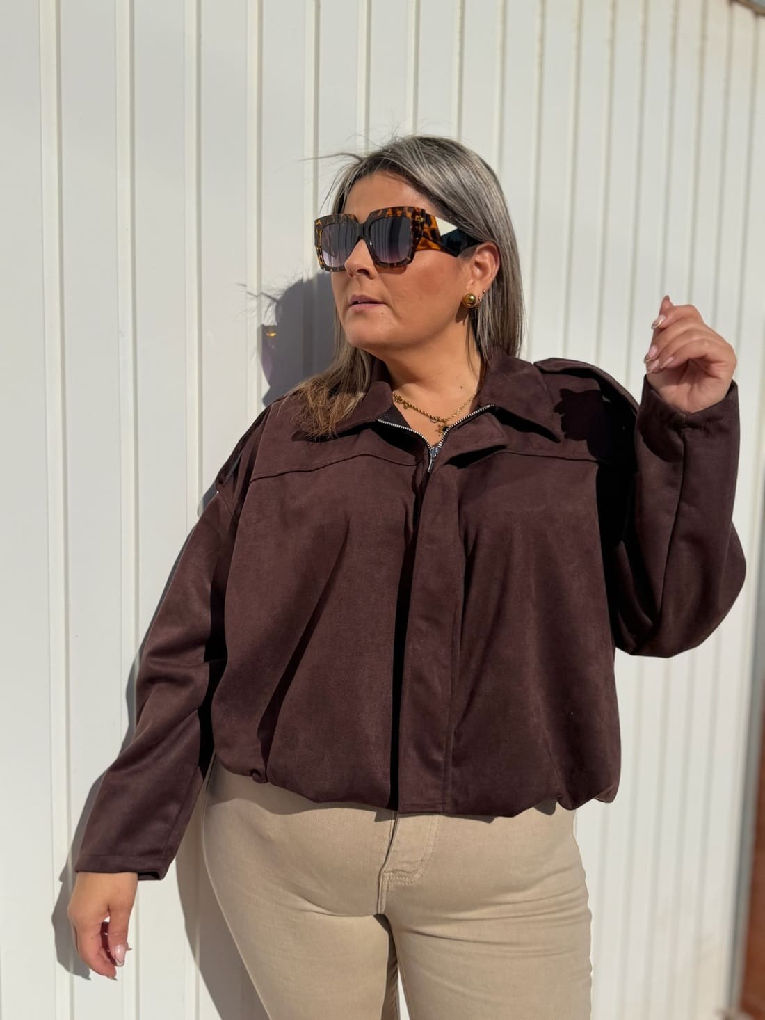 Bomber bombacha de manga larga y cuello camisero. Es de color liso y lleva dos bolsillos en diagonal en la parte delantera.