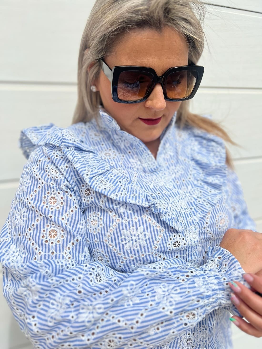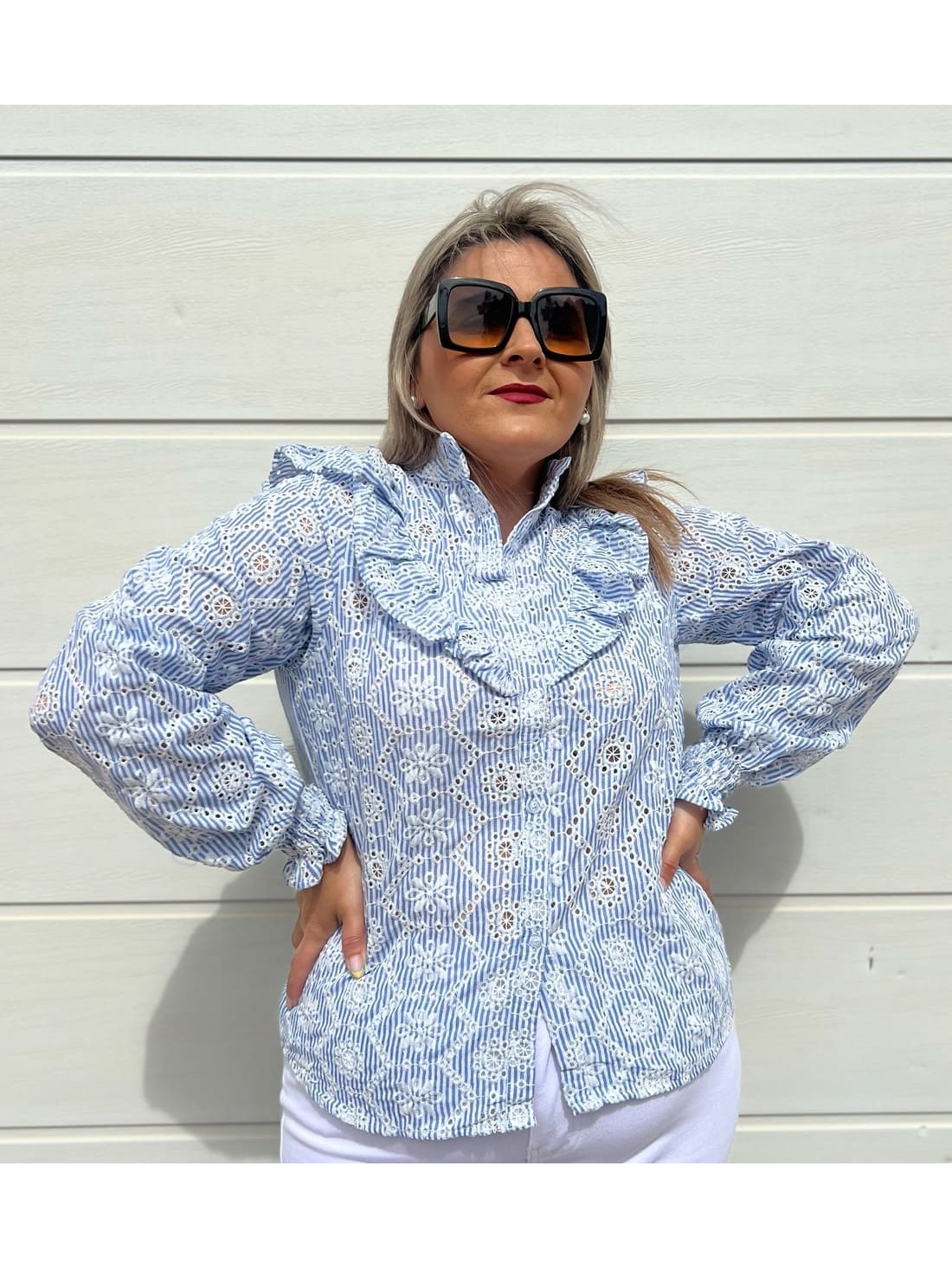Es una camisa súper bonita con detalles de dibujos bordados y calados por toda la prenda.