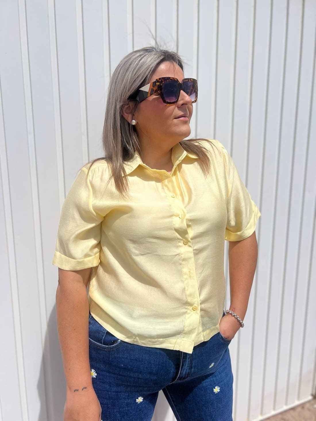 Camisa de manga corta de cuello camisero y botones en la parte delantera desde el cuello hasta el final de esta.