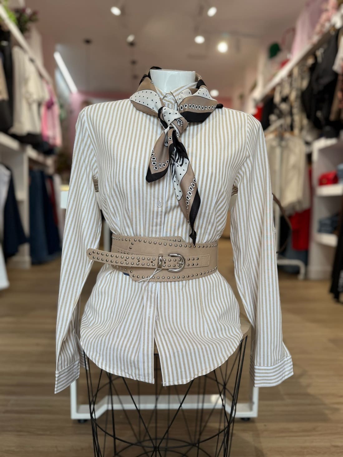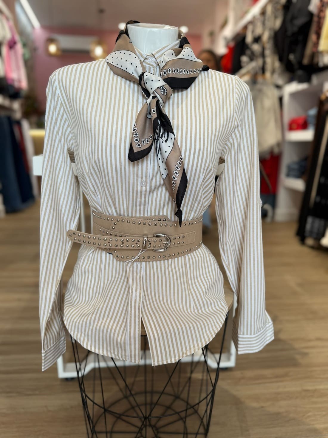 Es una camisa de rayas verticales finas en dos colores. Es entallada, no queda suelta como el otro modelo de Camisa Boteli.