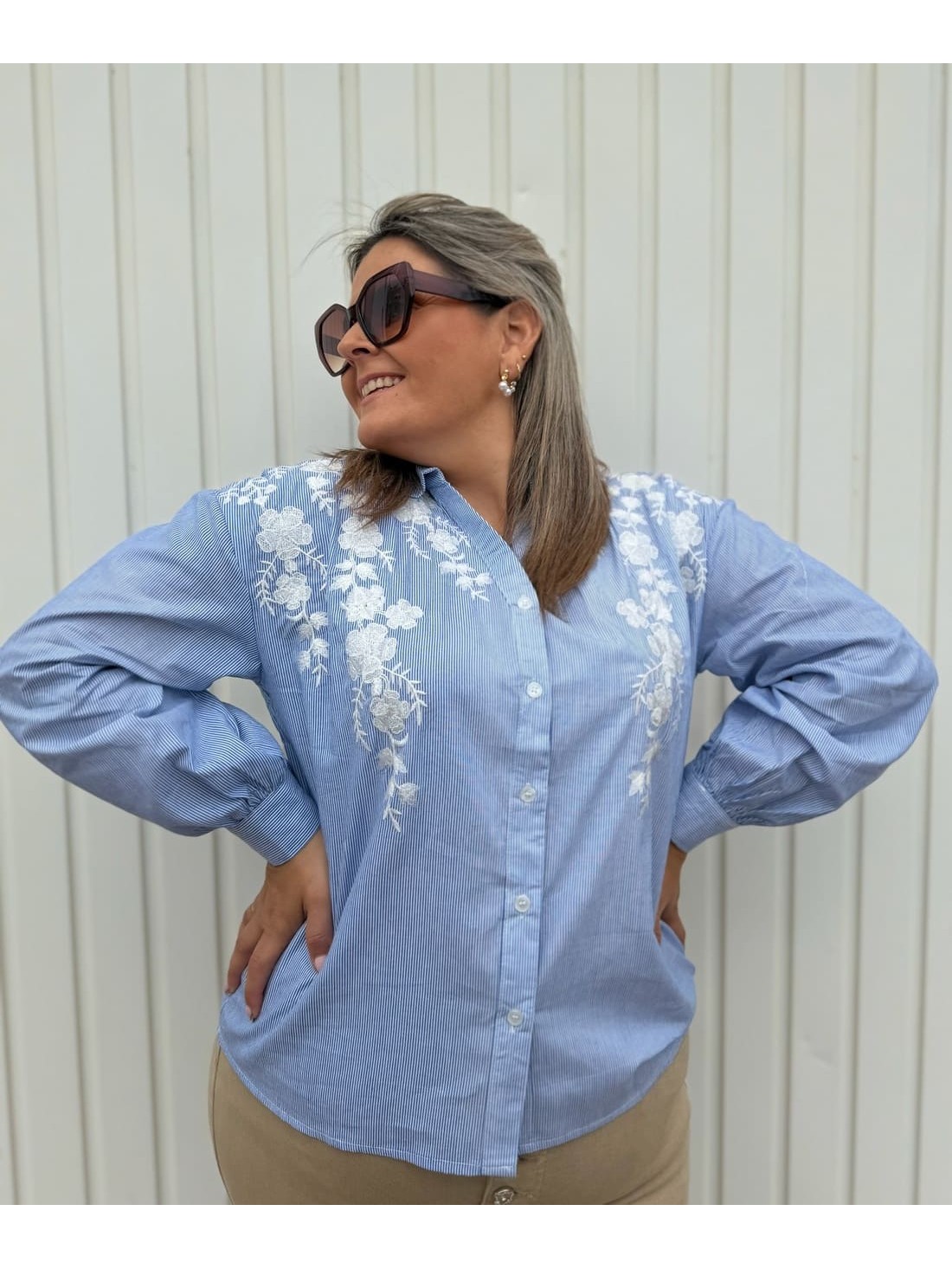 Es una camisa de rayas verticales finas en dos colores. Tiene detalle de dibujos de flores bordados en la parte delantera del pecho.