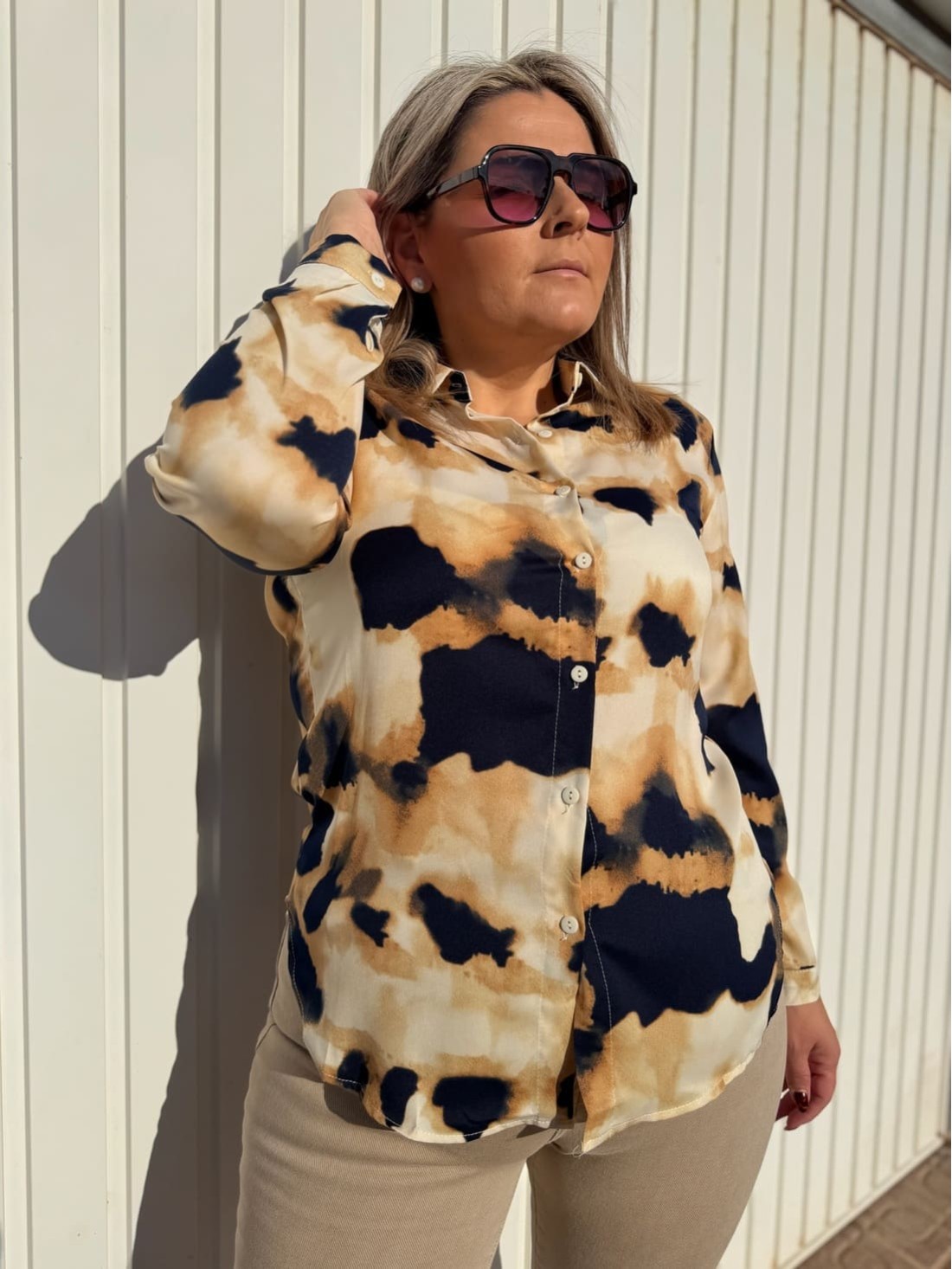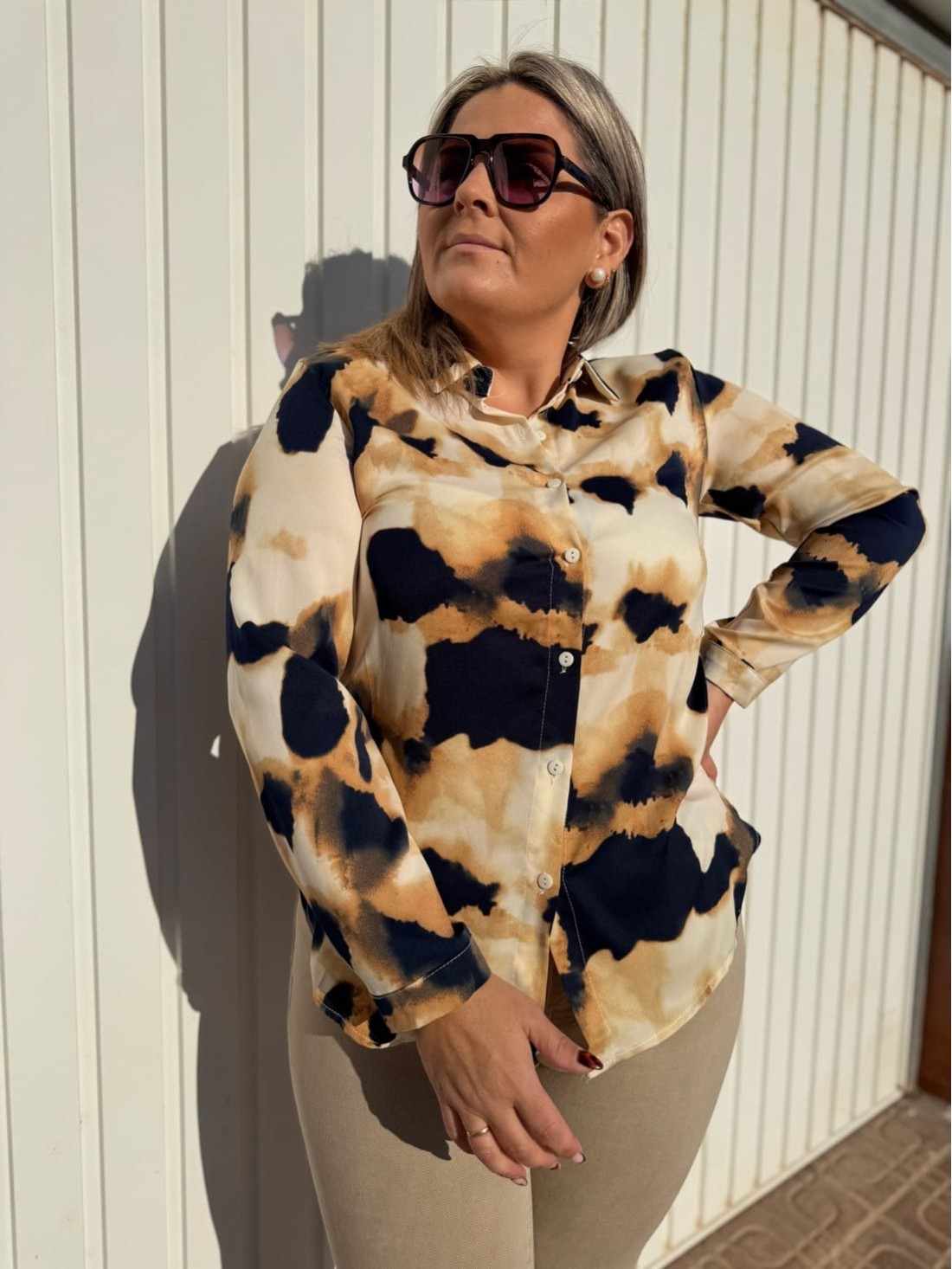 Es estampada de manchas en colores azul marino, beige y camel. Tiene botones en la parte delantera y en los puños.