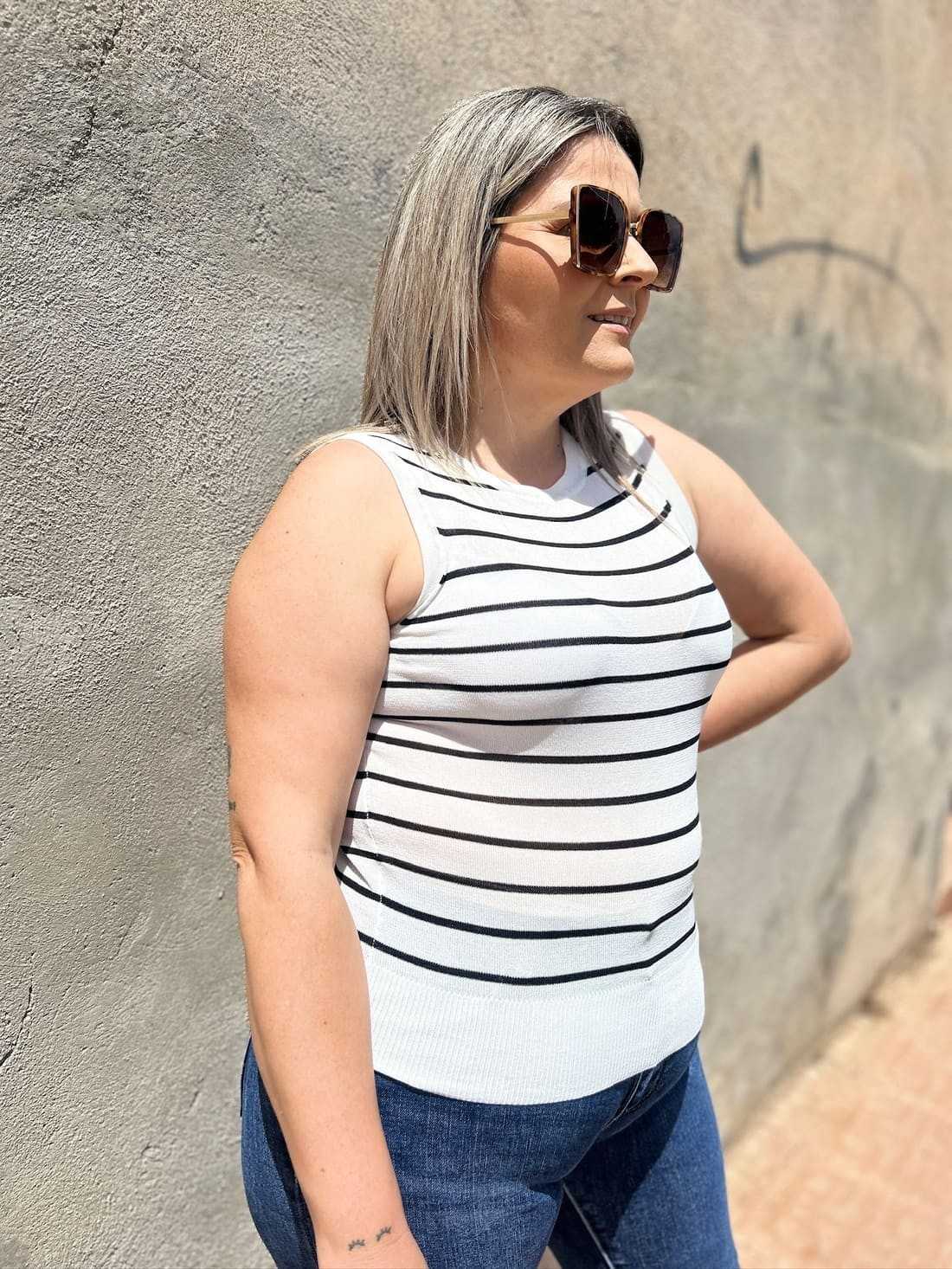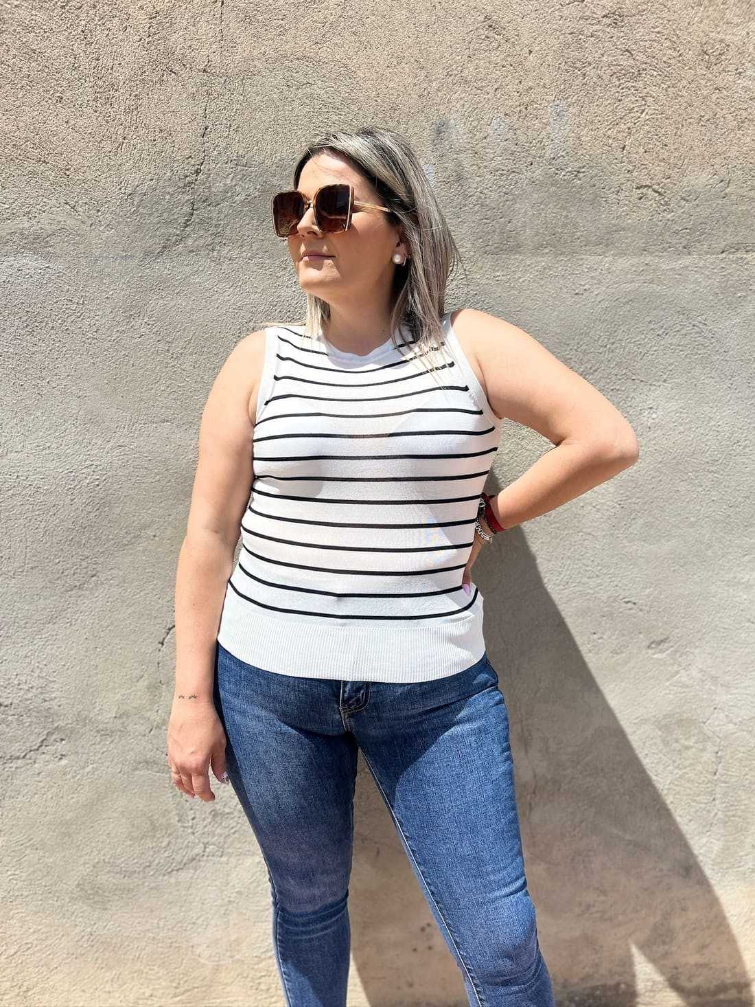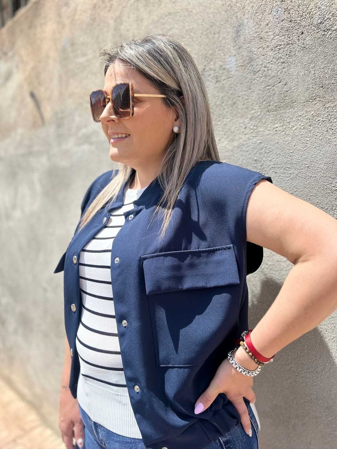 Es un chaleco de rayas azul marino sobre un fondo blanco, al ser de punto estira. Tiene el bajo más engomado.