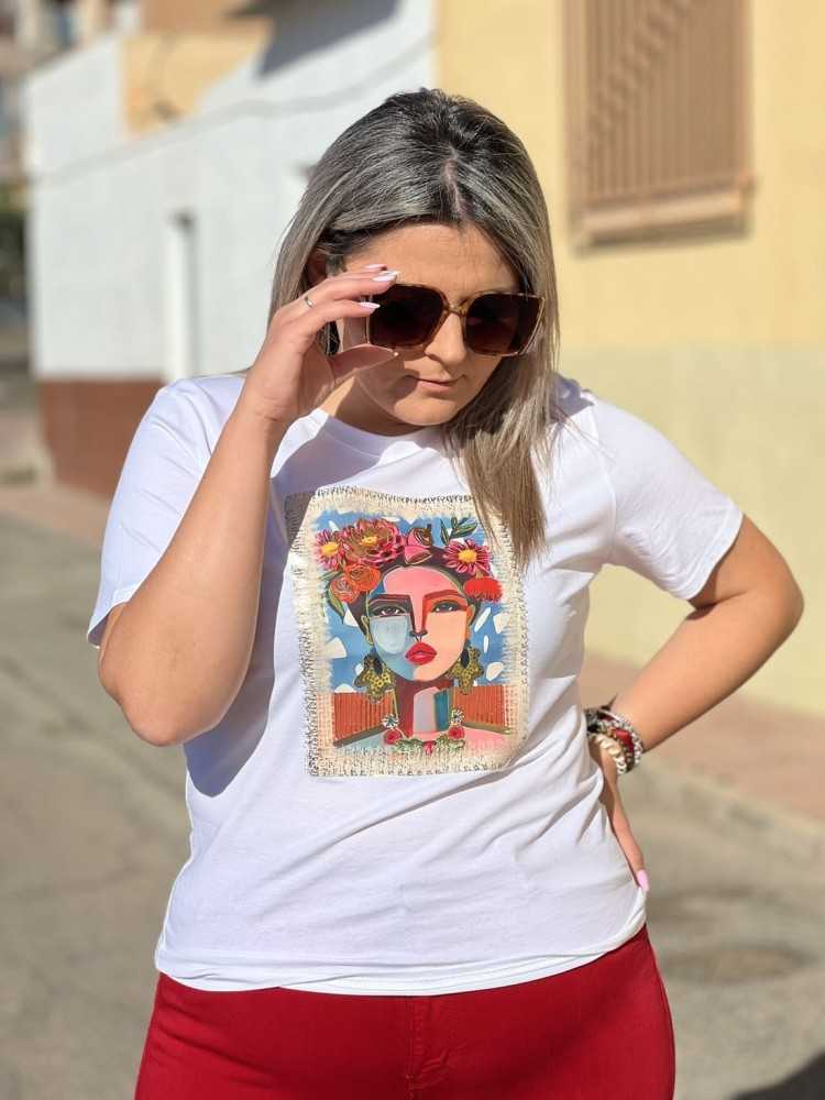 Es una camiseta muy bonita, tiene dibujo en forma cuadrada de Frida en muchos colores llamativos con dorado.