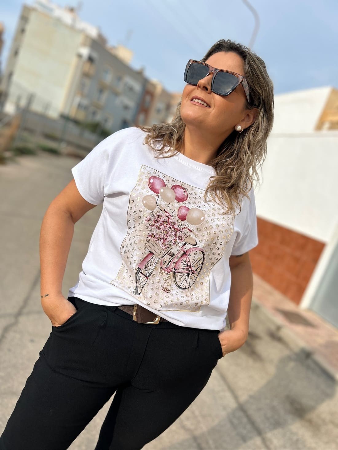 Tiene un dibujo en forma cuadrada con una bicicleta en tonos beige, rosa y granate con el fondo con formas de flor y rombos en color dorado.