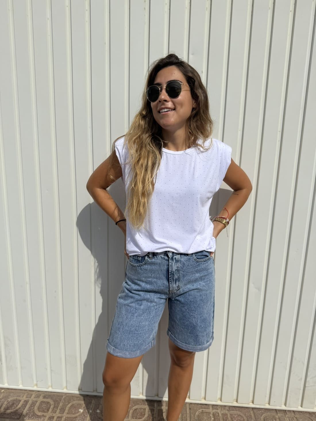 Camiseta de hombreras de manga sisa y cuello redondo de color liso.