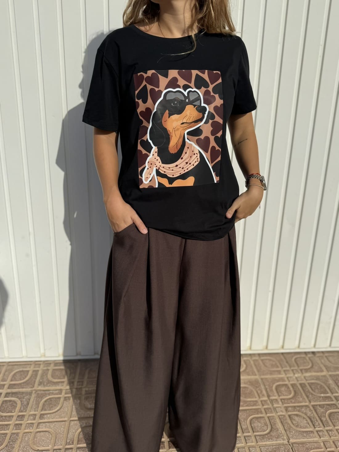 El dibujo es en forma cuadrada de un perrito con el fondo de muchos corazones. La tenemos disponible en dos colores.