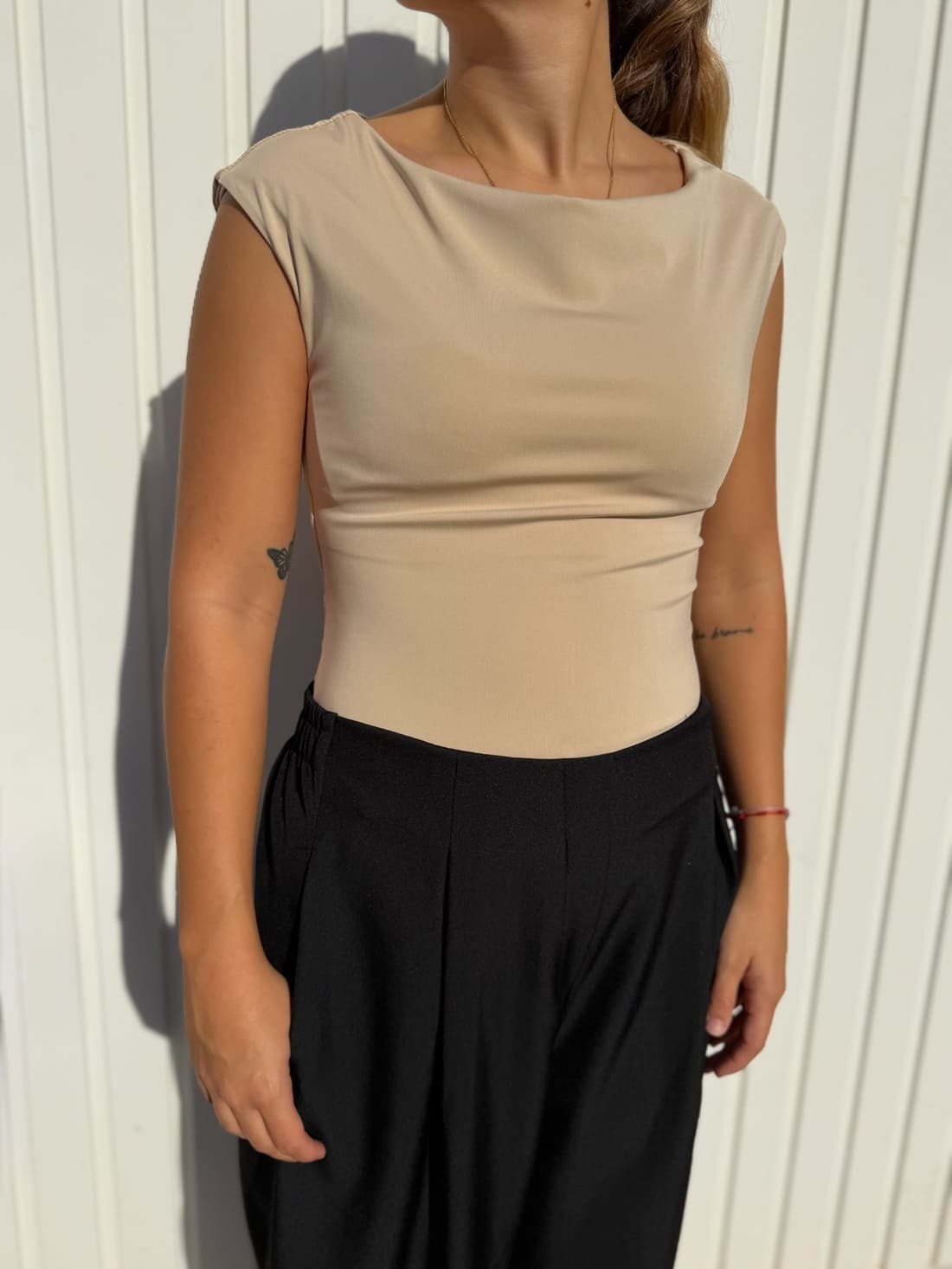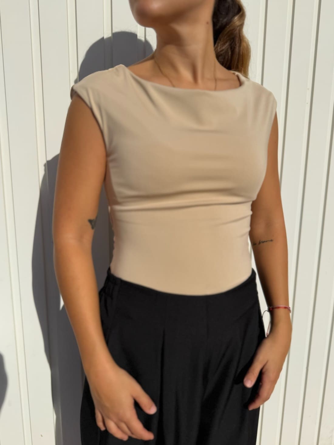 Body de manga sisa y cuello como de barco. Es de color liso, lleva doble tela en la parte del pecho para que no transparente.