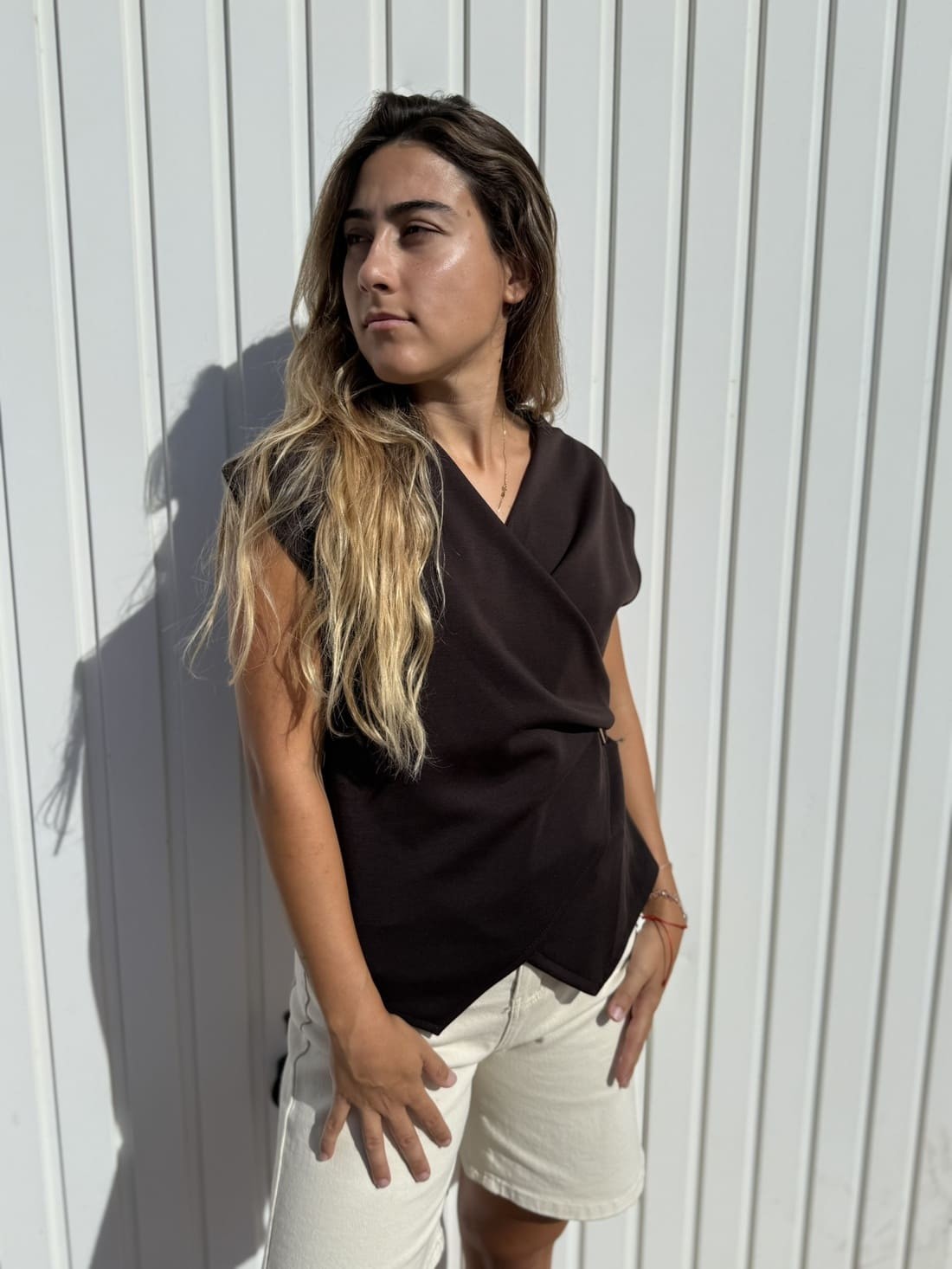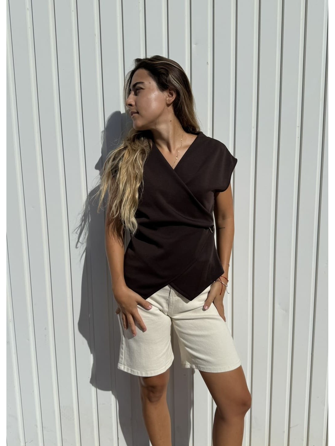 Chaleco de manga sisa con escote cruzado ya que este chaleco va cogido en un lado con un broche dorado.