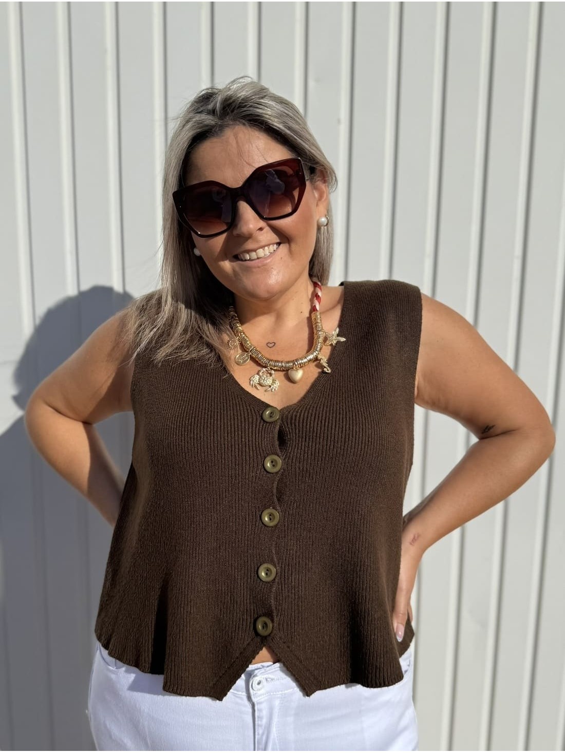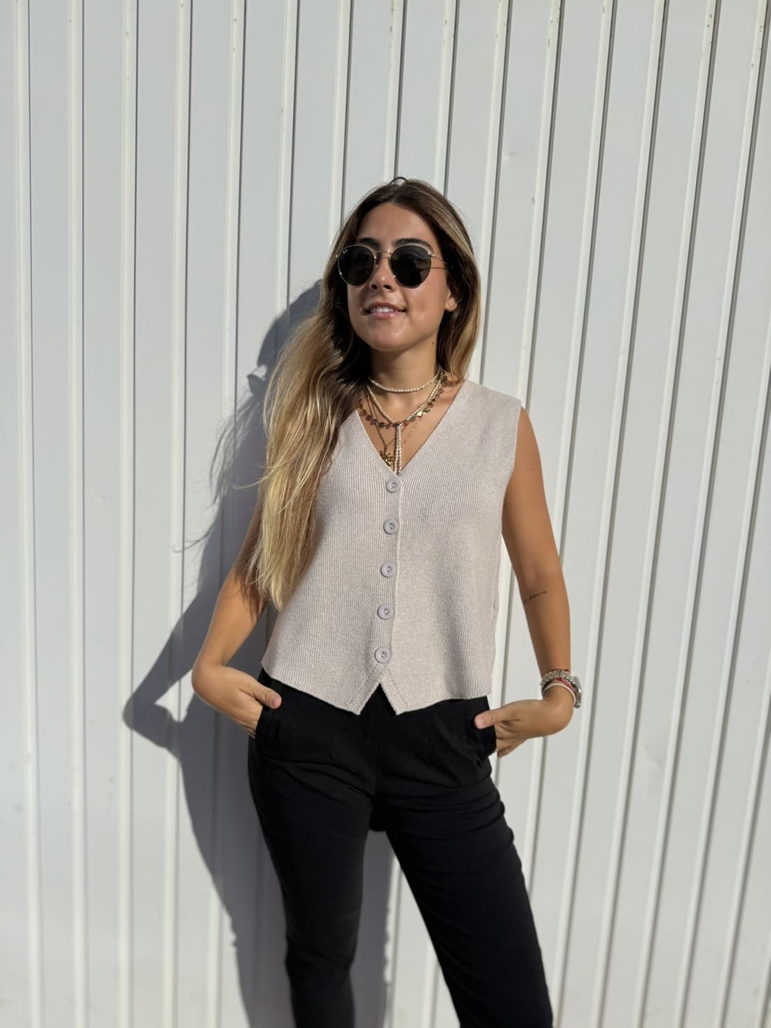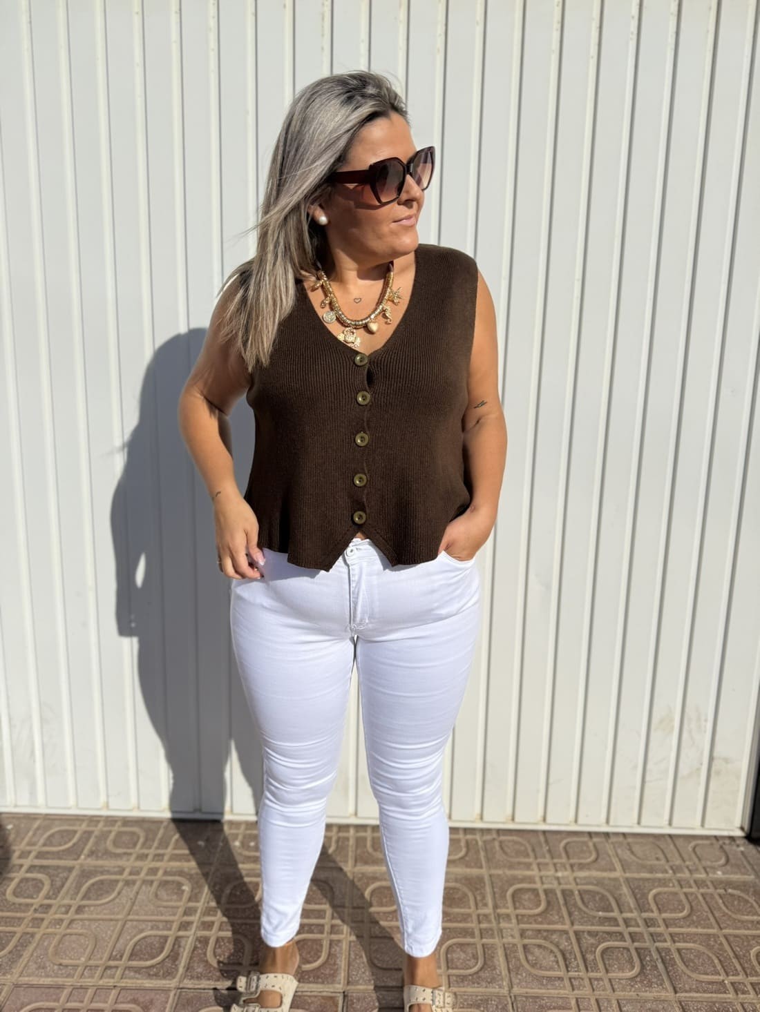 Chaleco de punto básico con escote en pico y cierre delantero de botones desde el escote hasta el final de este.