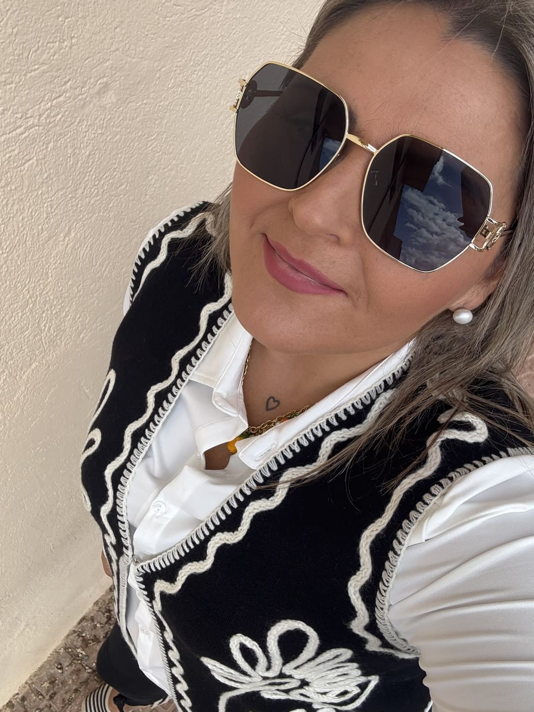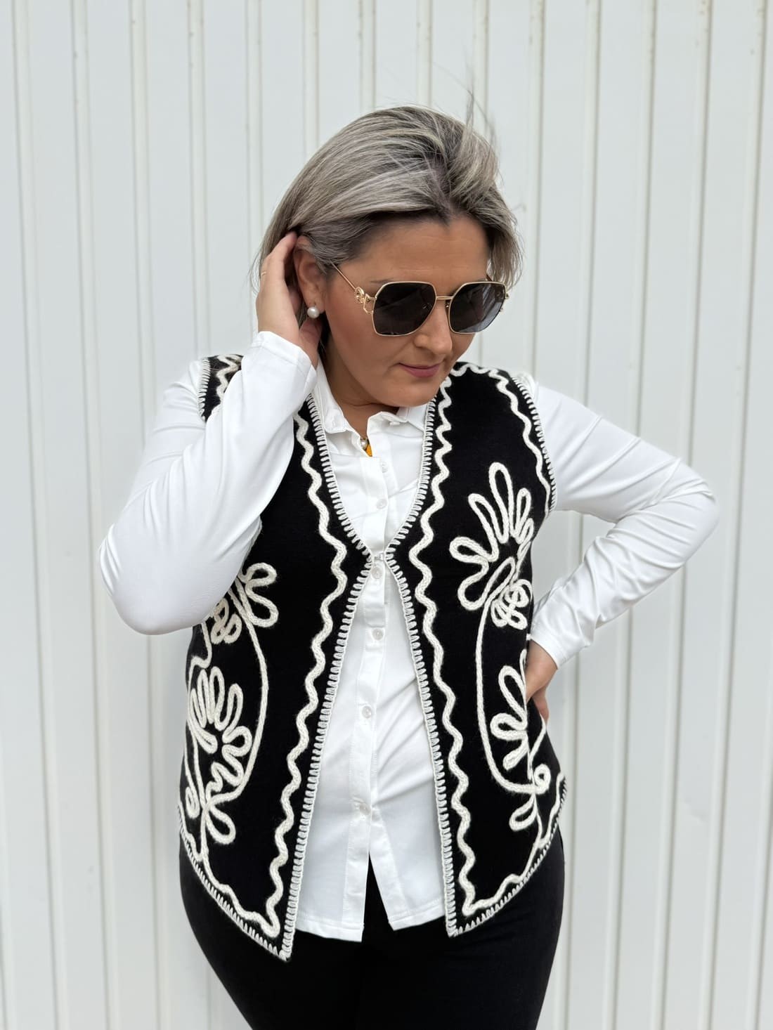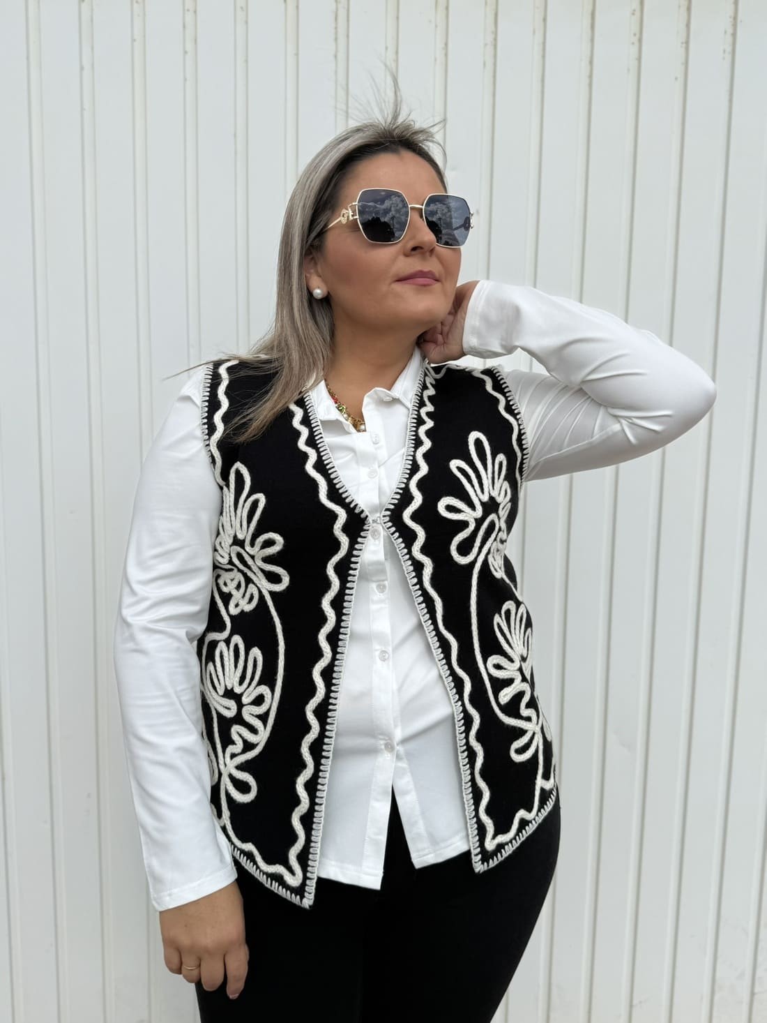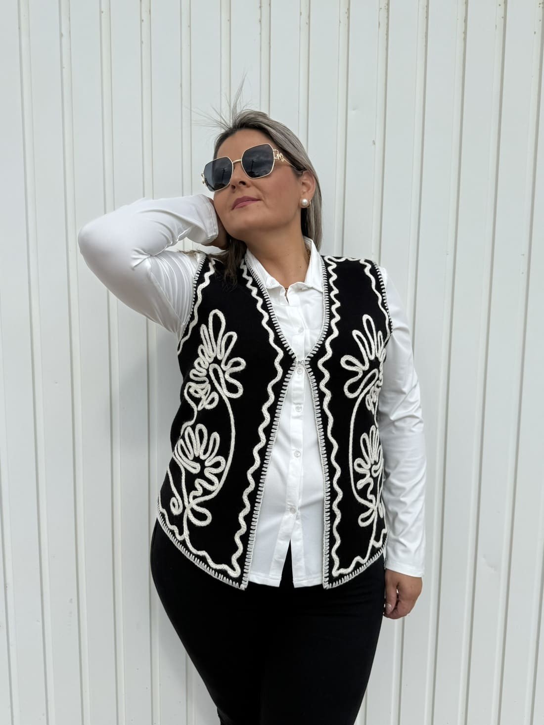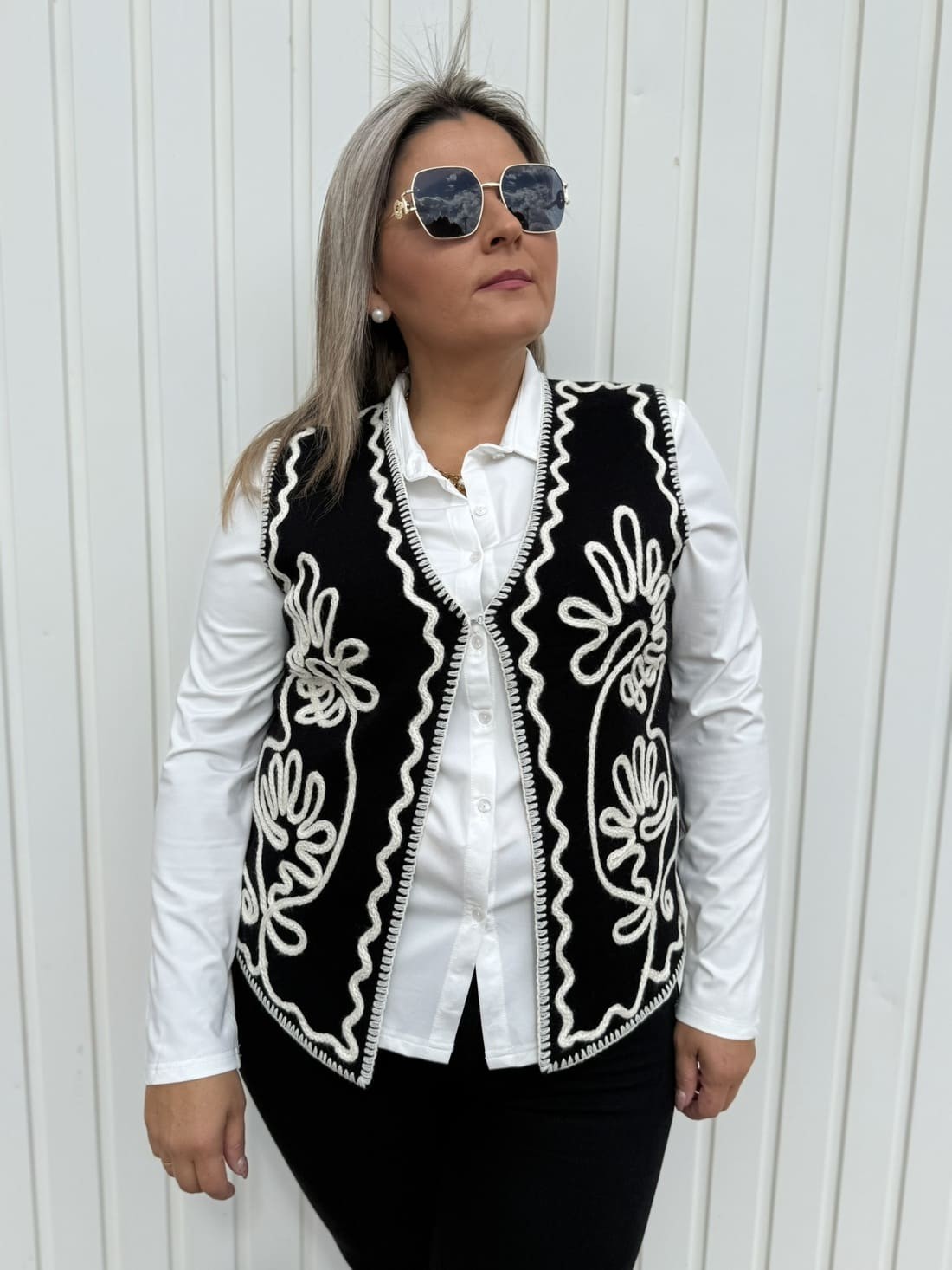 Tiene bordados en la parte delantera y en los filos de este de color liso y diferente al del fondo liso del chaleco.