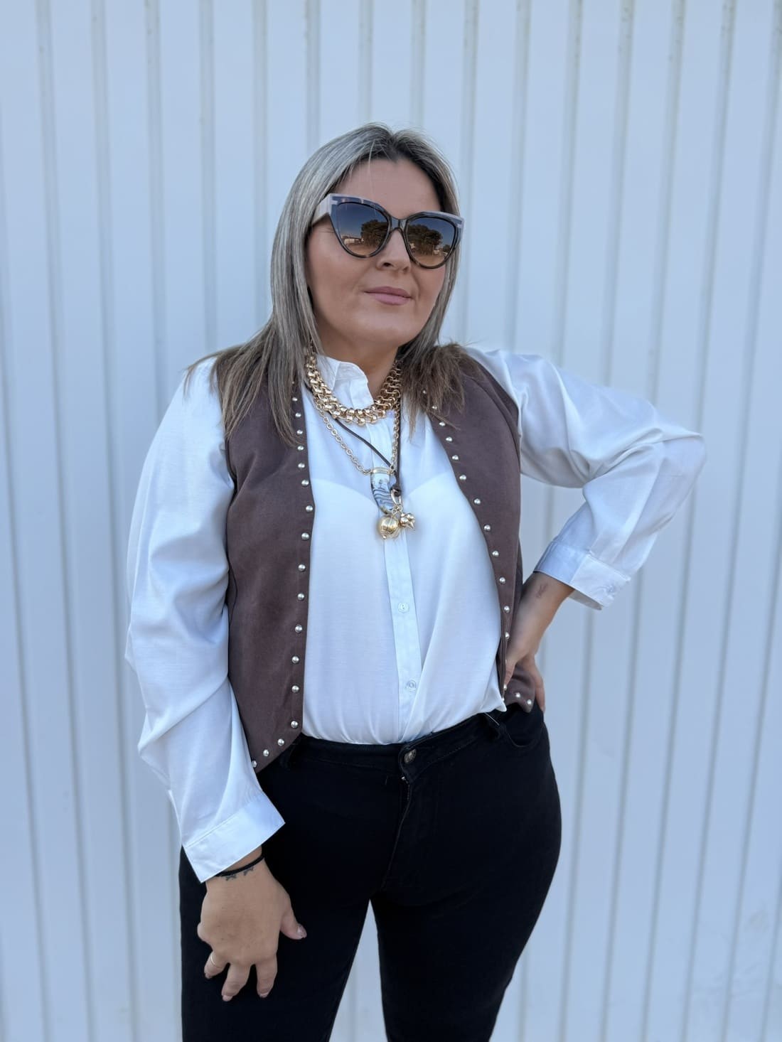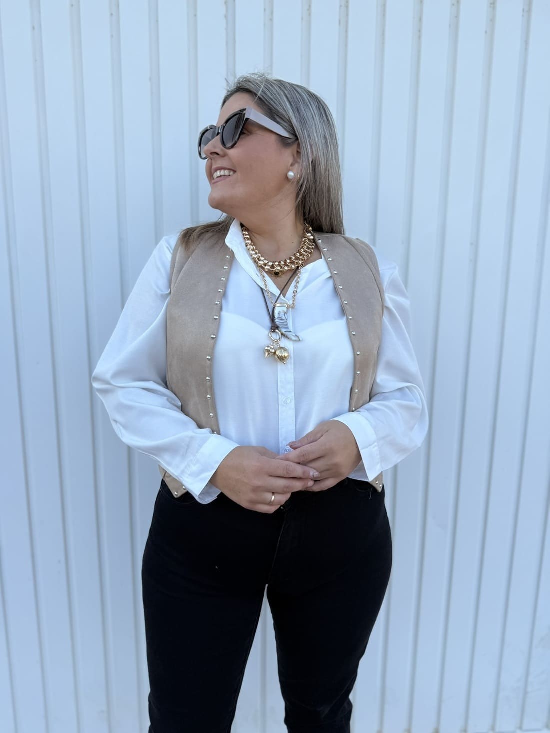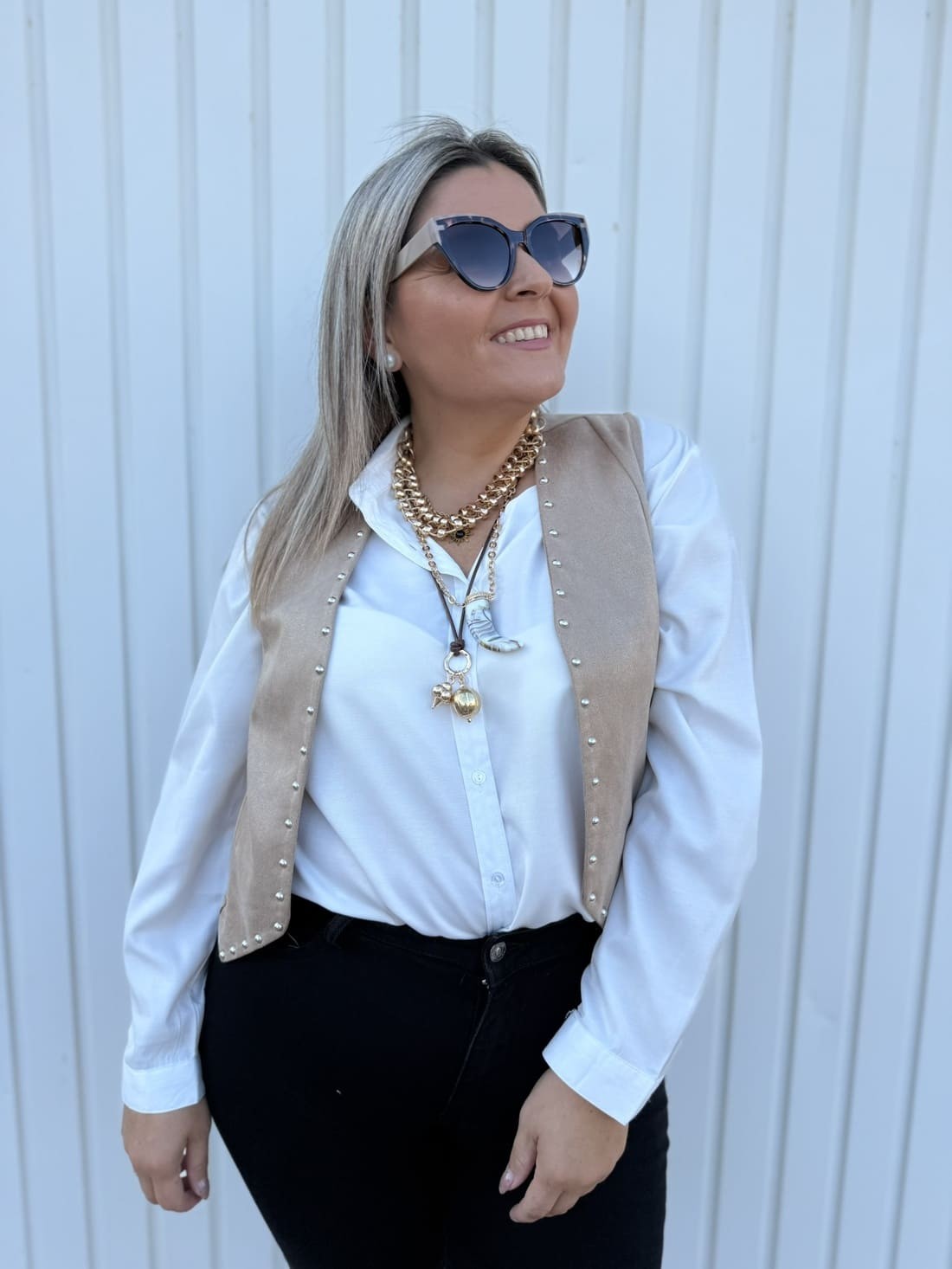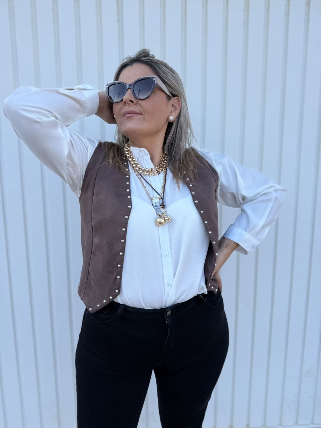 Chaleco de antelina muy agradable y moderno con detalle de tachuelas en color plata por el filo delantero de toda la prenda.