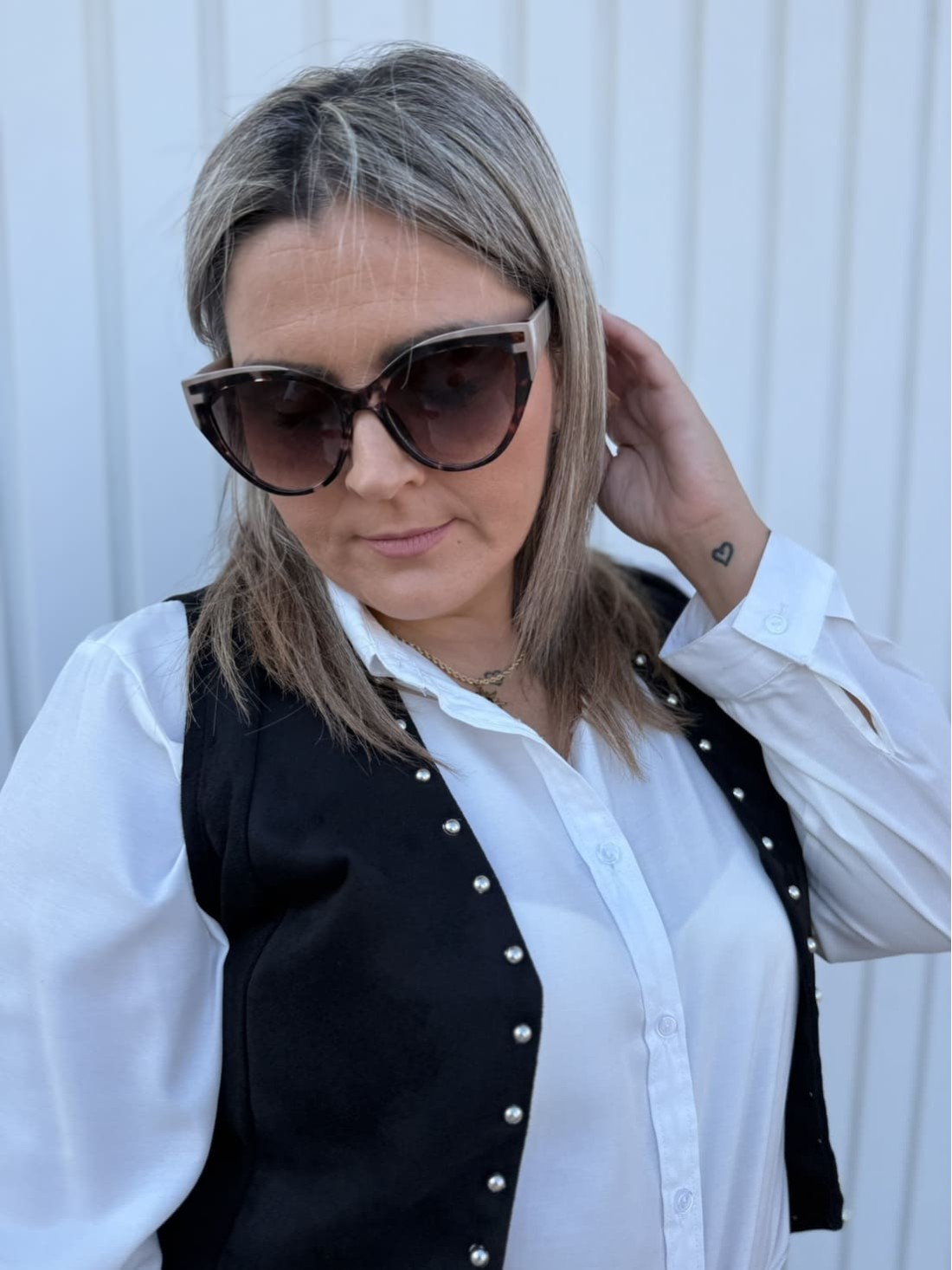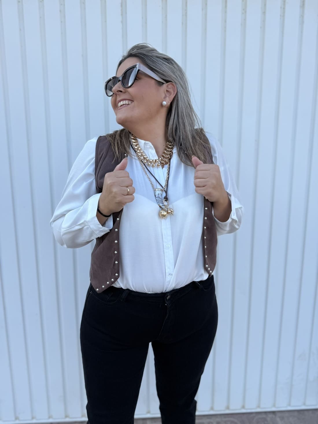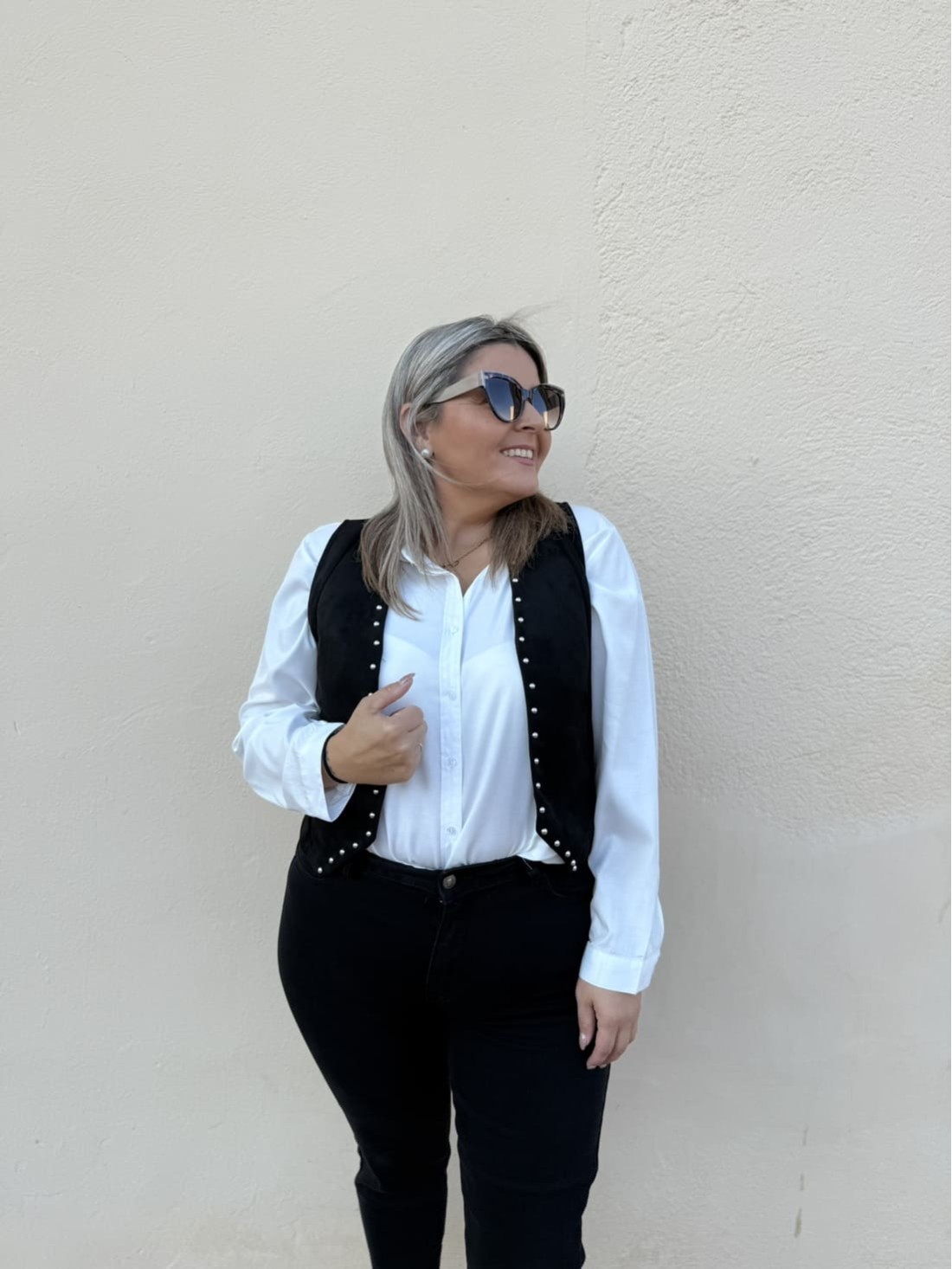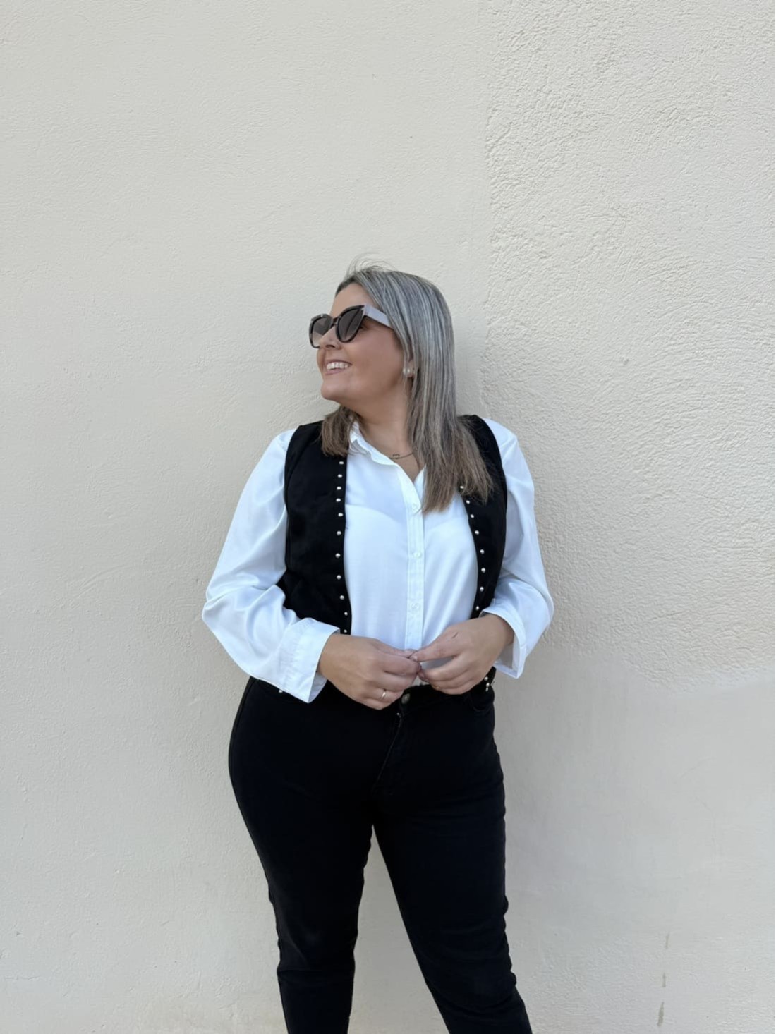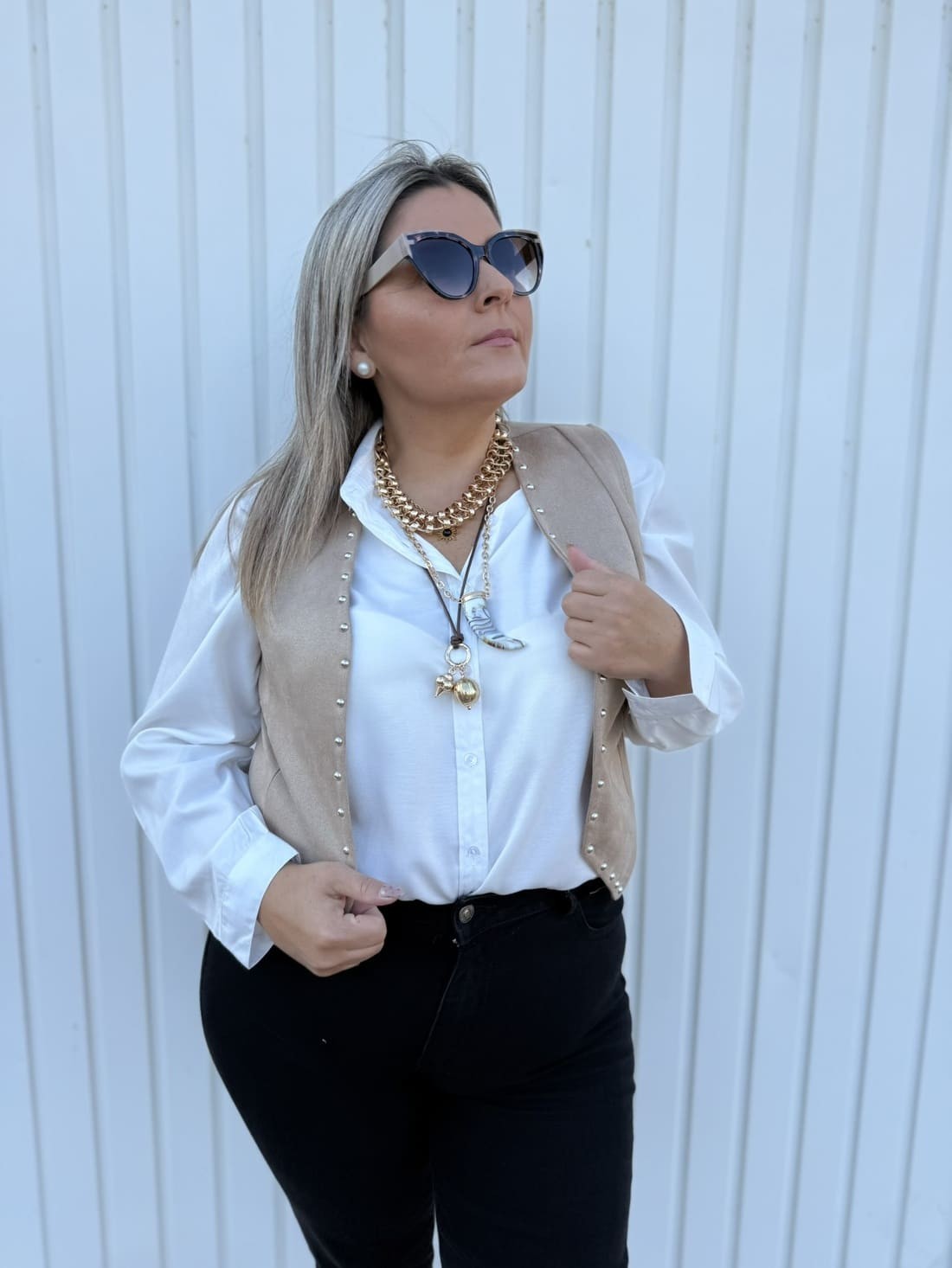 Chaleco de antelina muy agradable y moderno con detalle de tachuelas en color plata por el filo delantero de toda la prenda.