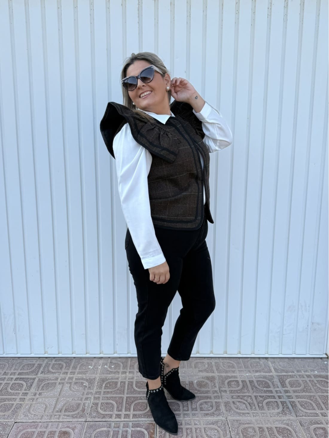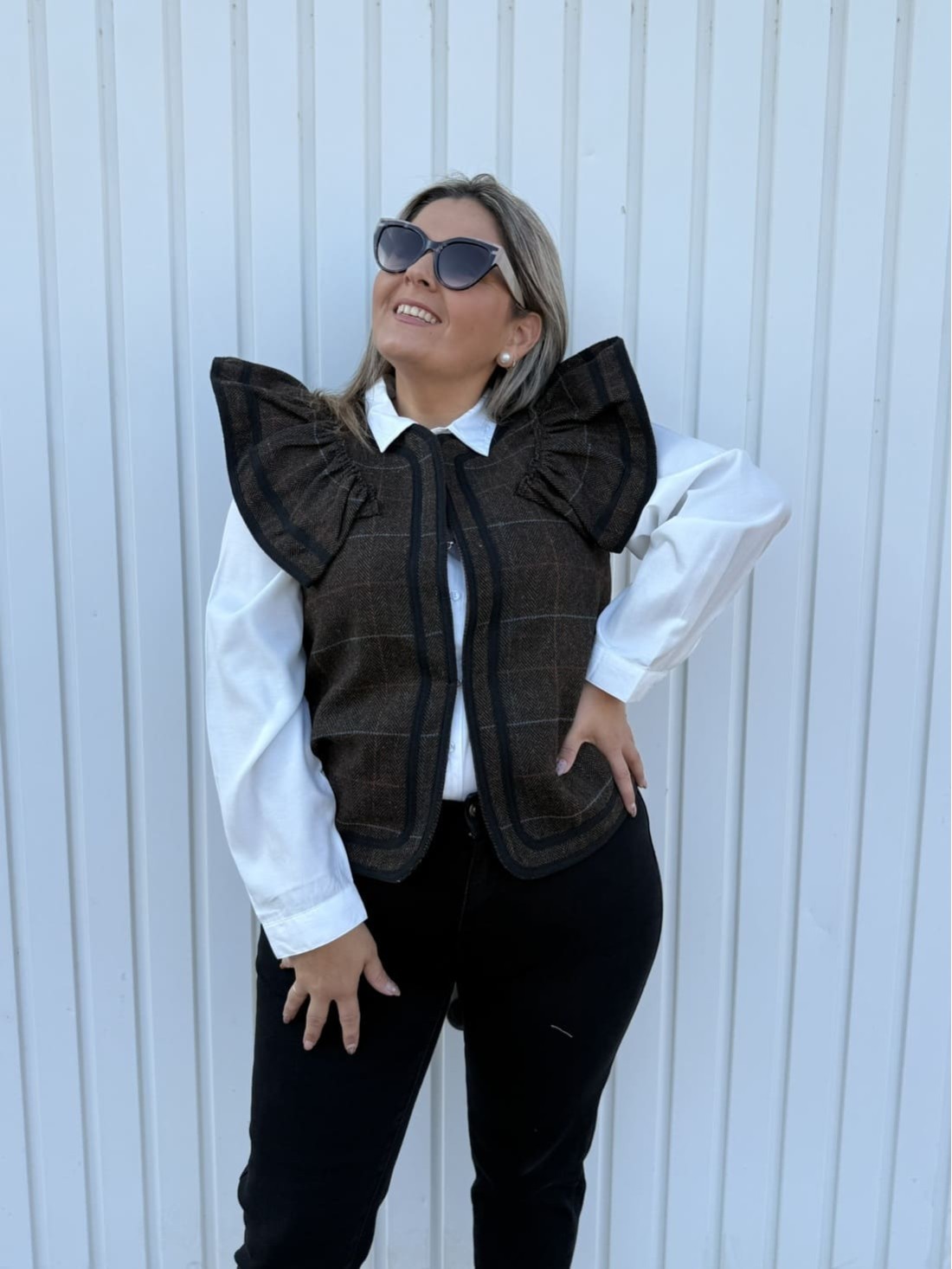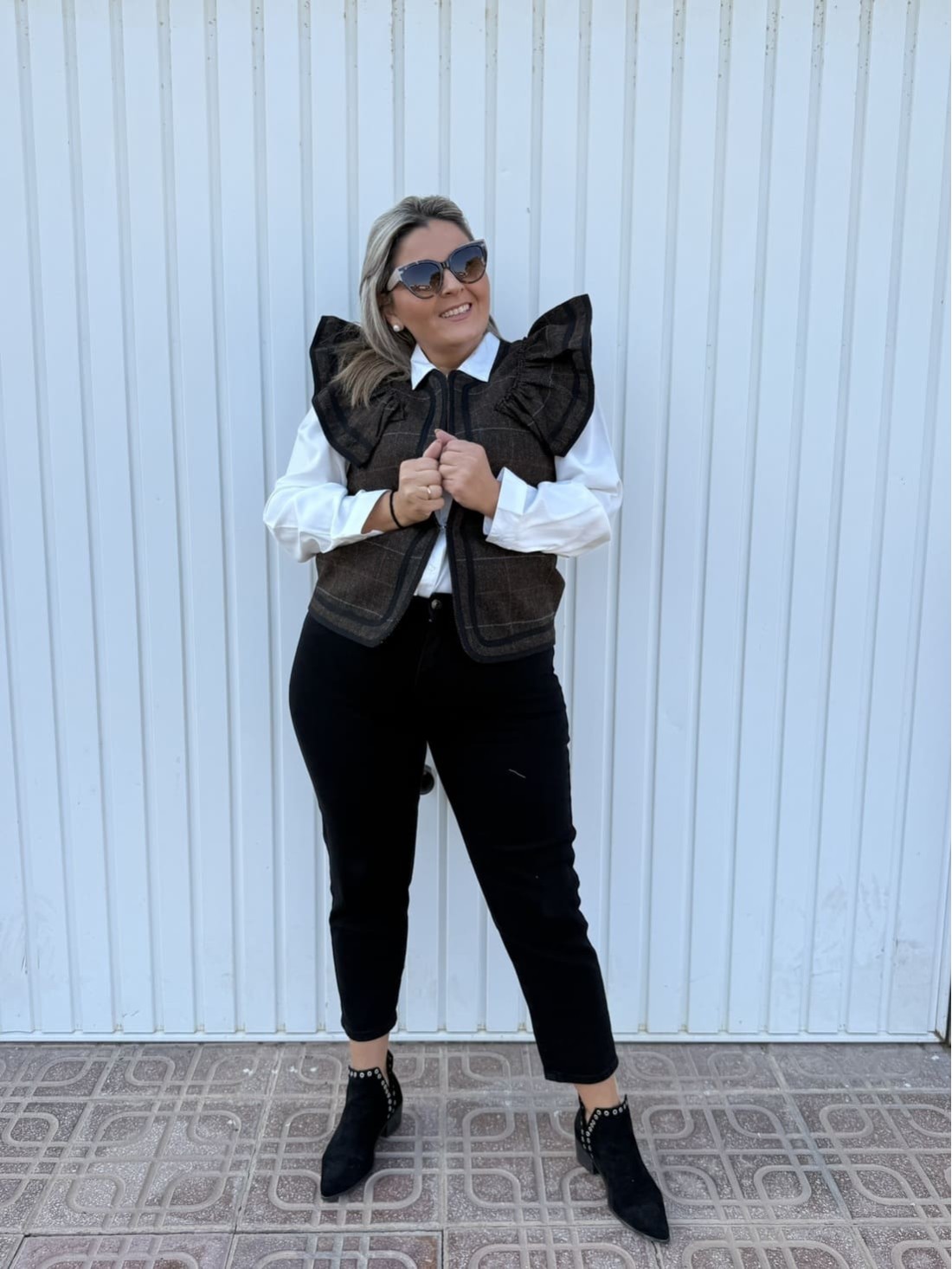 Chaleco de cuadros con unos detalles que enamoran. Va cerrado con corchetes en la parte delantera, aunque se puede llevar abierto.
