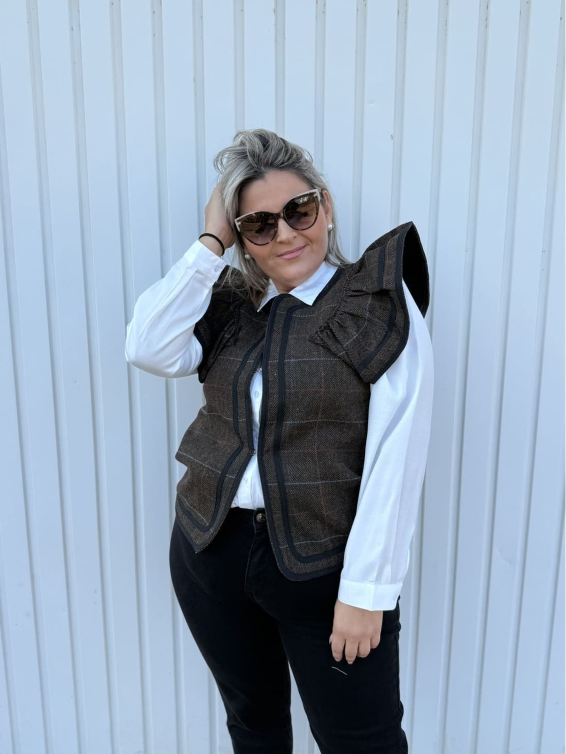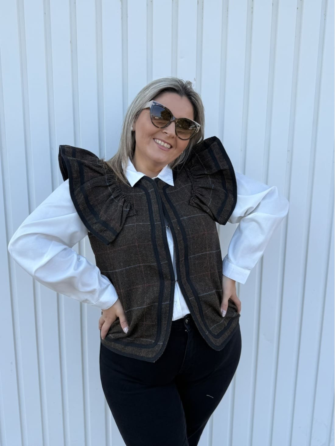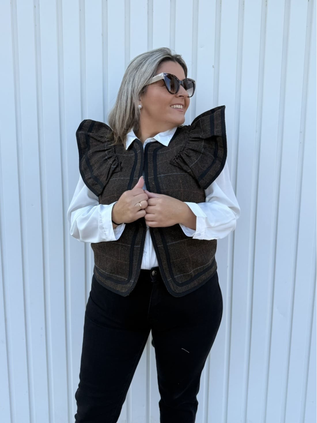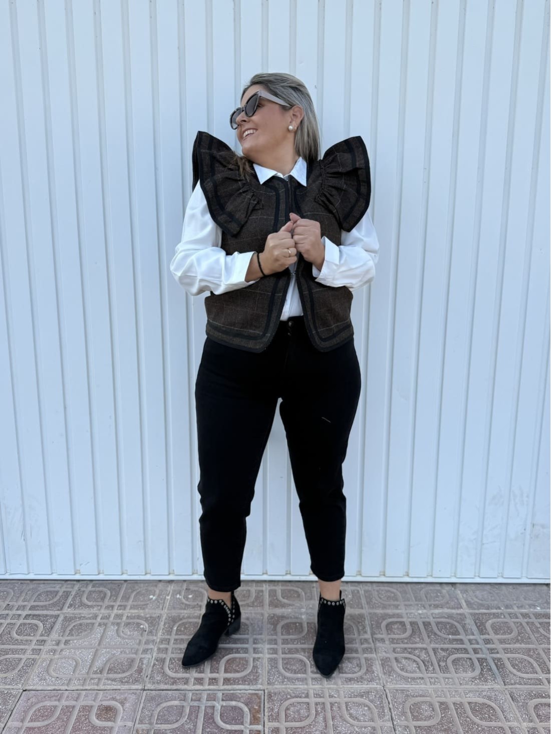 Chaleco de cuadros con unos detalles que enamoran. Va cerrado con corchetes en la parte delantera, aunque se puede llevar abierto.