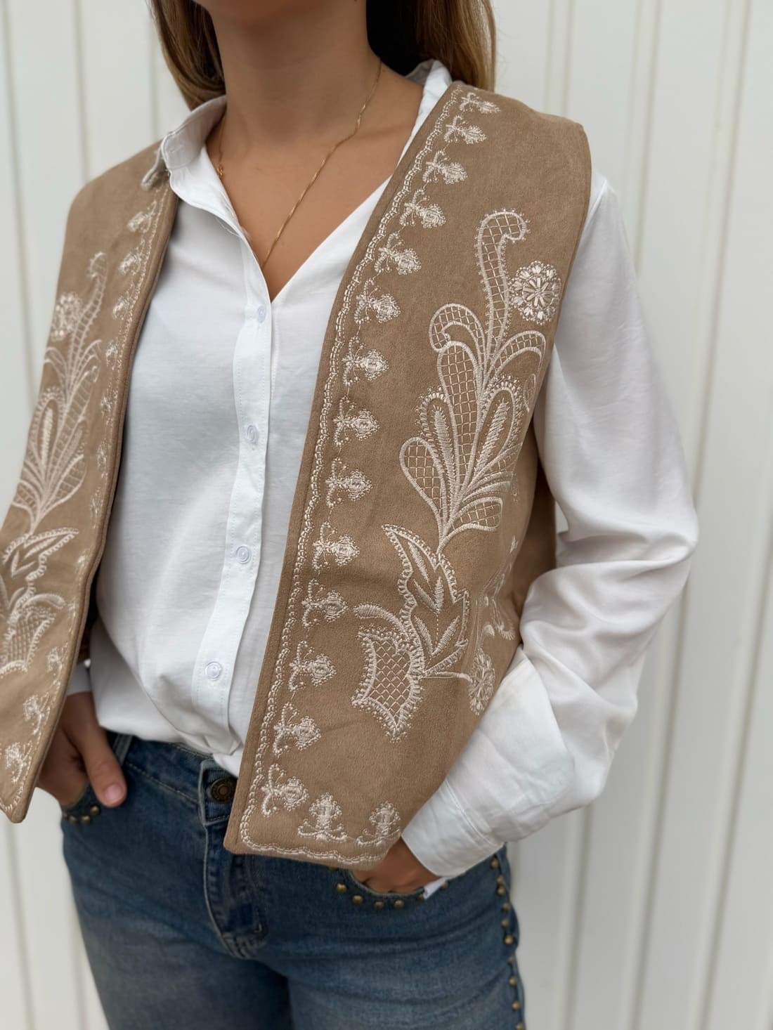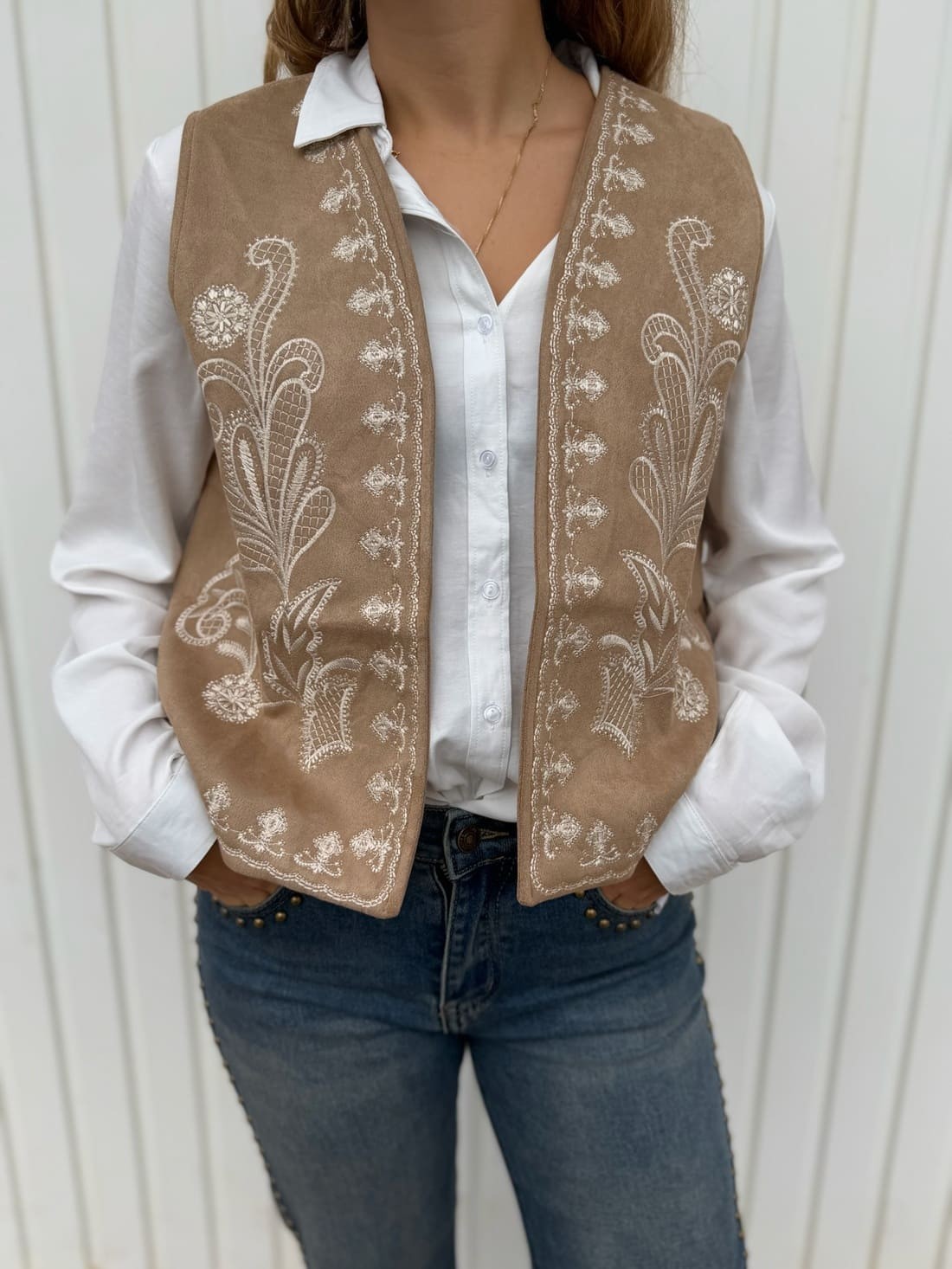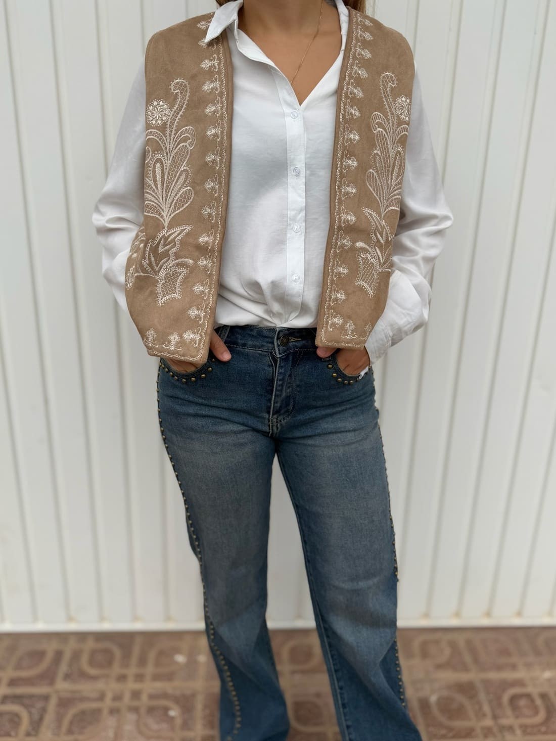 Chaleco de antelina sin cierres y de cuello en forma de pico. Es entero de antelina, un género muy agradable y suave.
