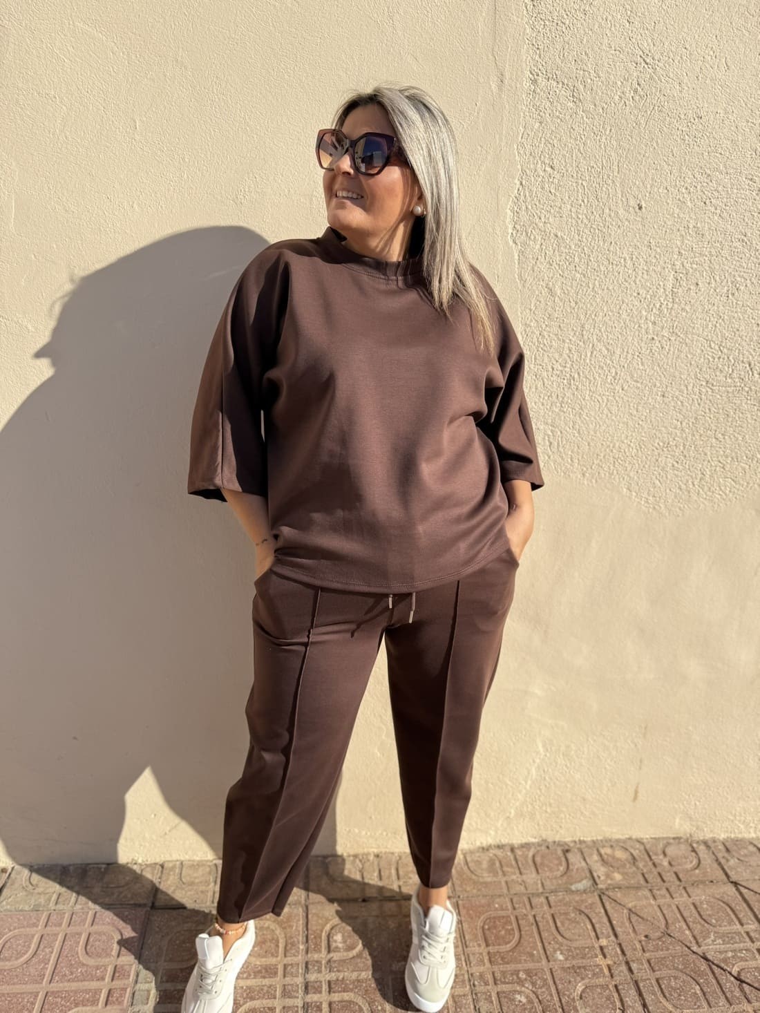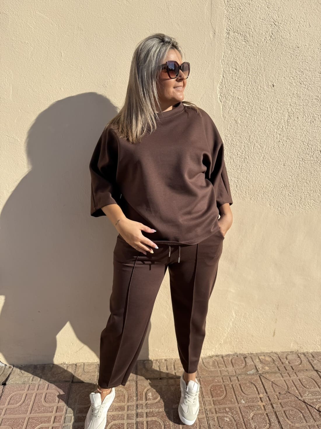 La sudadera es de manga al codo, en estilo murciélago que queda más moderna. Ambas prendas son del mismo género y color.