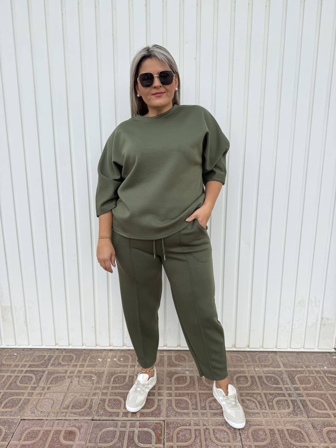 La sudadera es de manga al codo, en estilo murciélago que queda más moderna. Ambas prendas son del mismo género y color.