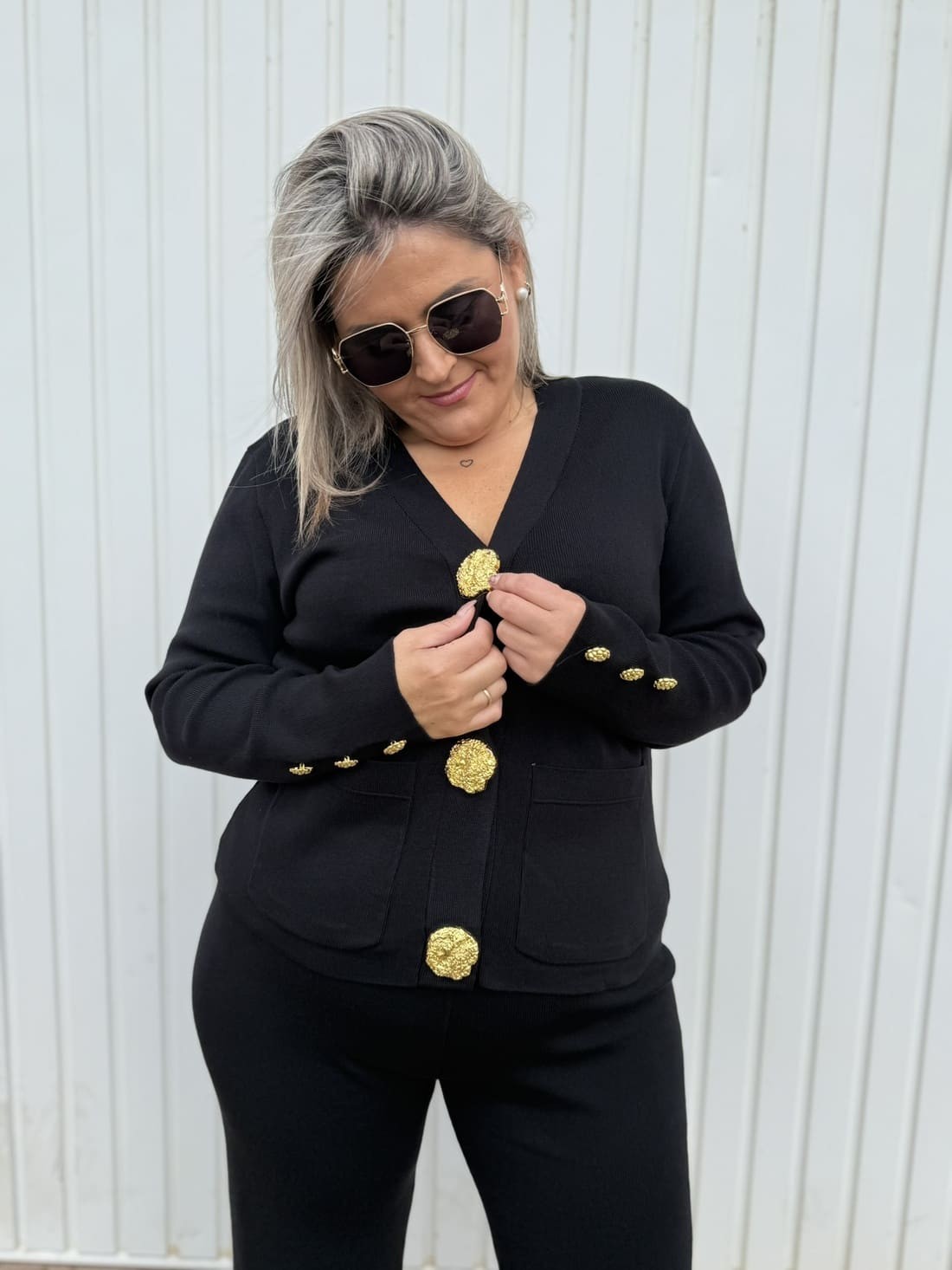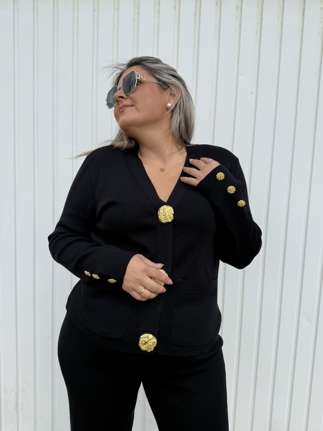 El chaleco tiene escote en pico con botones grandes dorados desde el escote hasta el final de este. Tiene dos bolsillos sin cierres en la parte delantera.