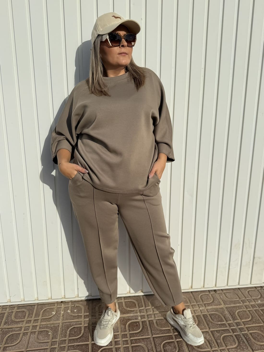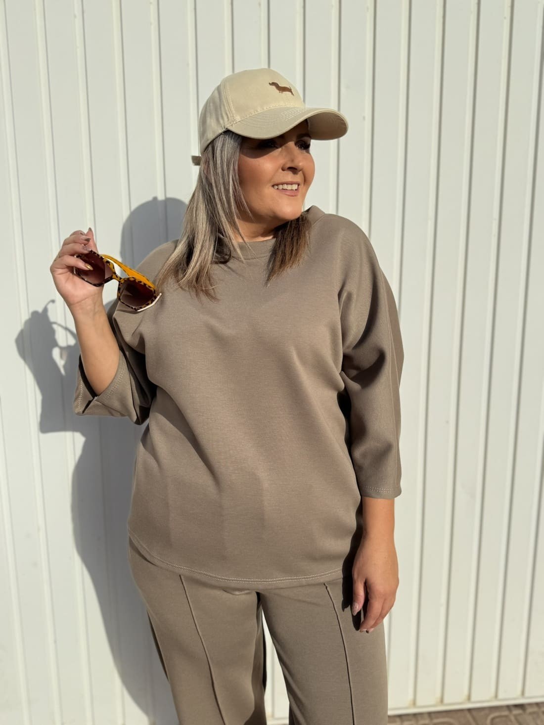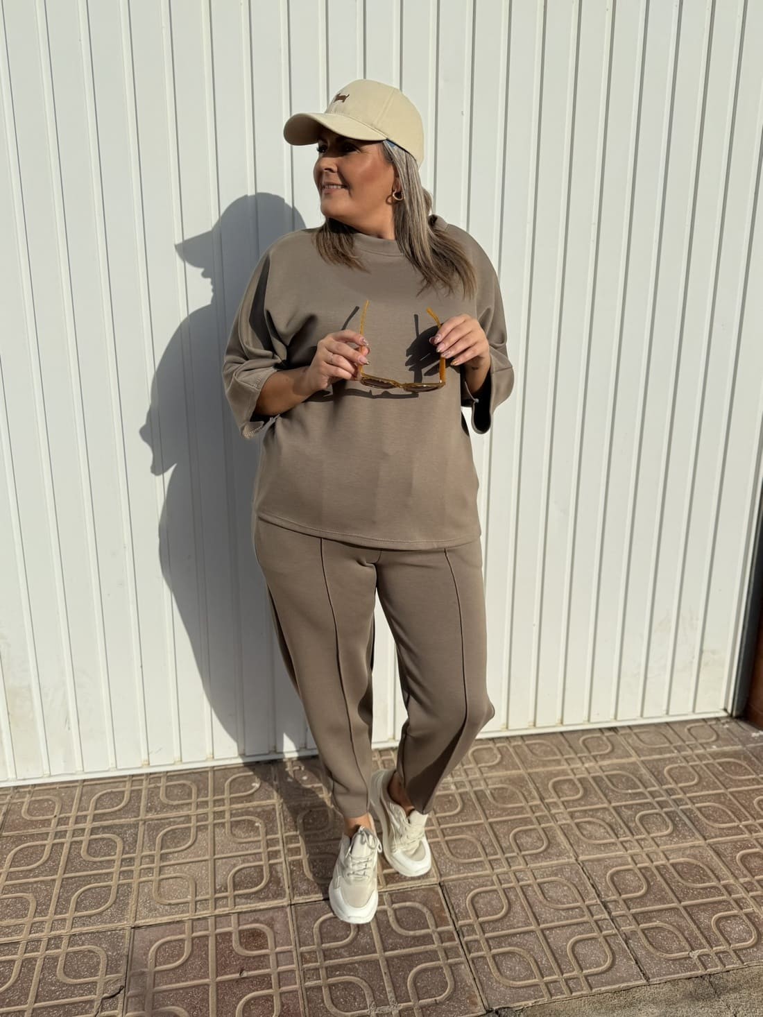 La sudadera es de manga al codo, en estilo murciélago que queda más moderna. Ambas prendas son del mismo género y color.