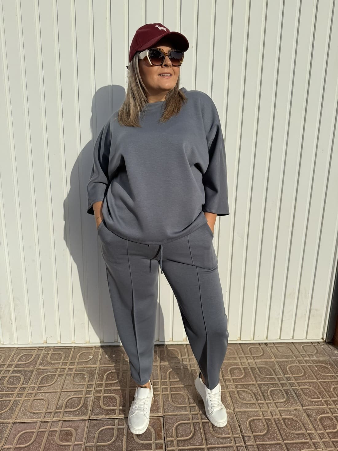 La sudadera es de manga al codo, en estilo murciélago que queda más moderna. Ambas prendas son del mismo género y color.