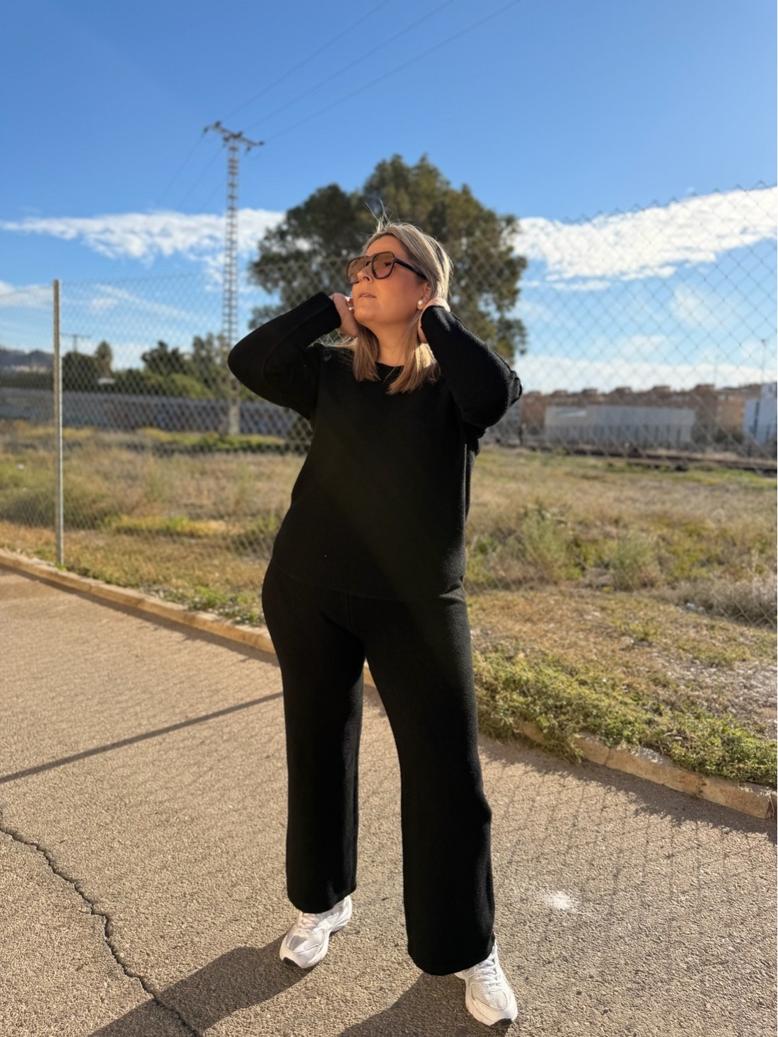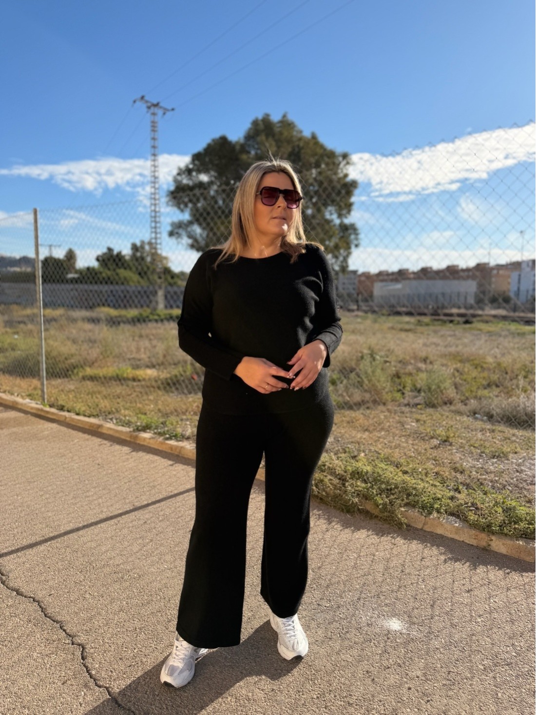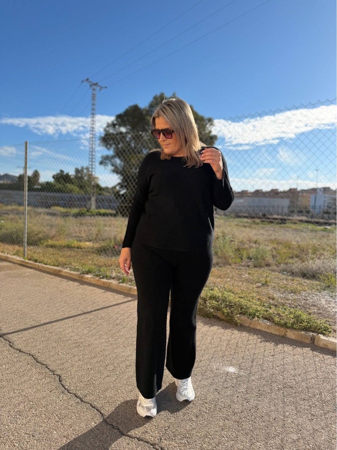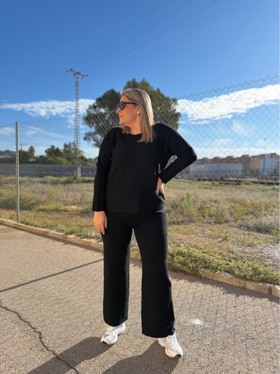 Conjunto de punto compuesto por pantalón y jersey de color liso.