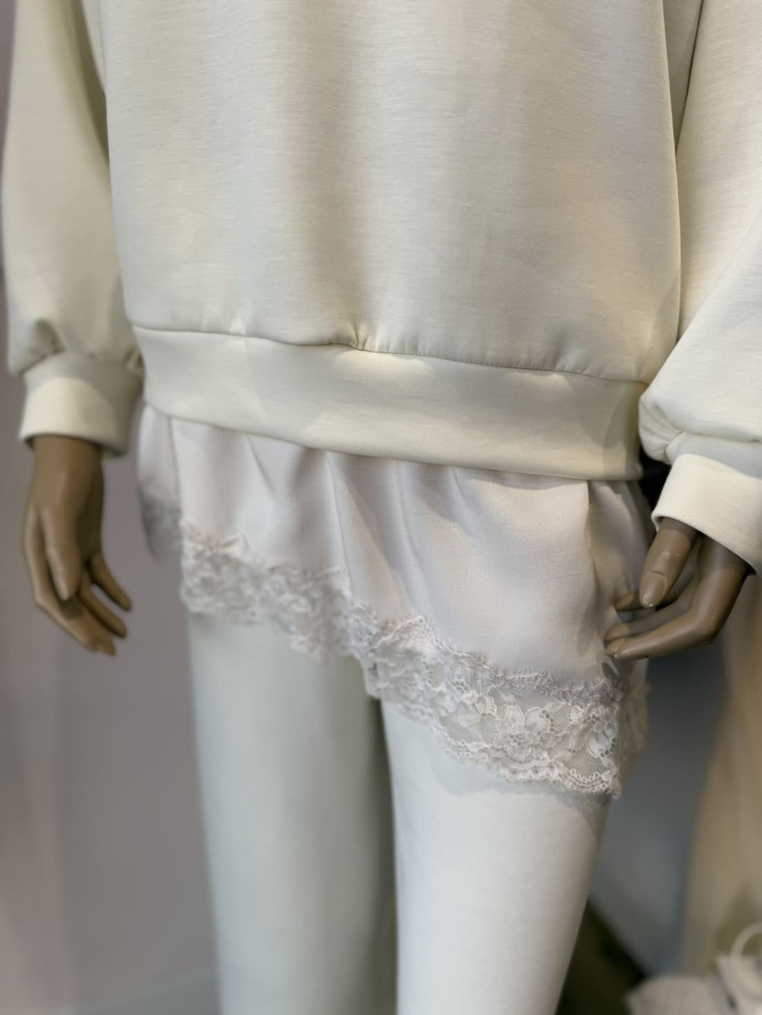 La sudadera es de manga larga y cuello redondo con detalle en el bajo de puntilla del mismo color que la prenda.