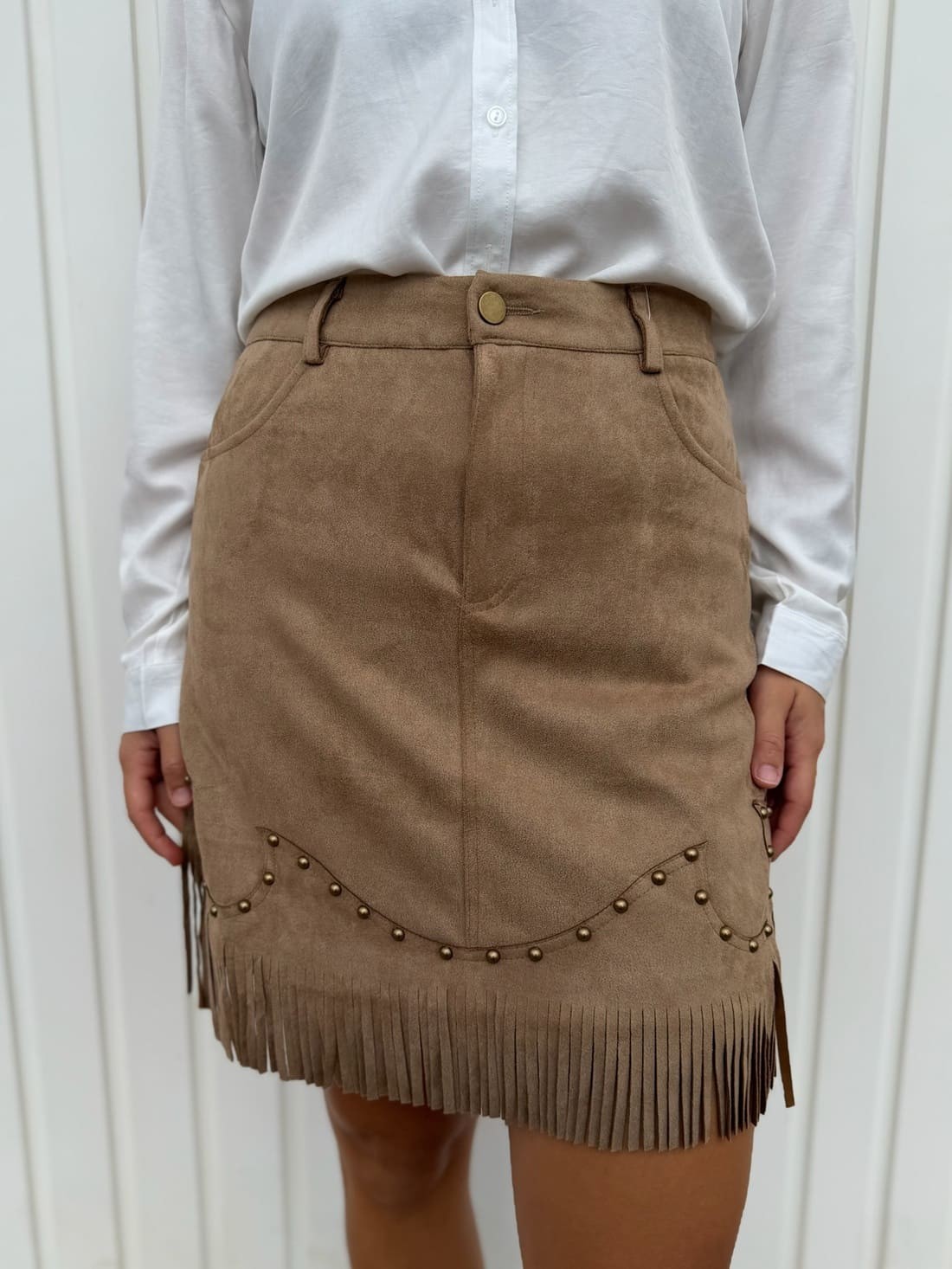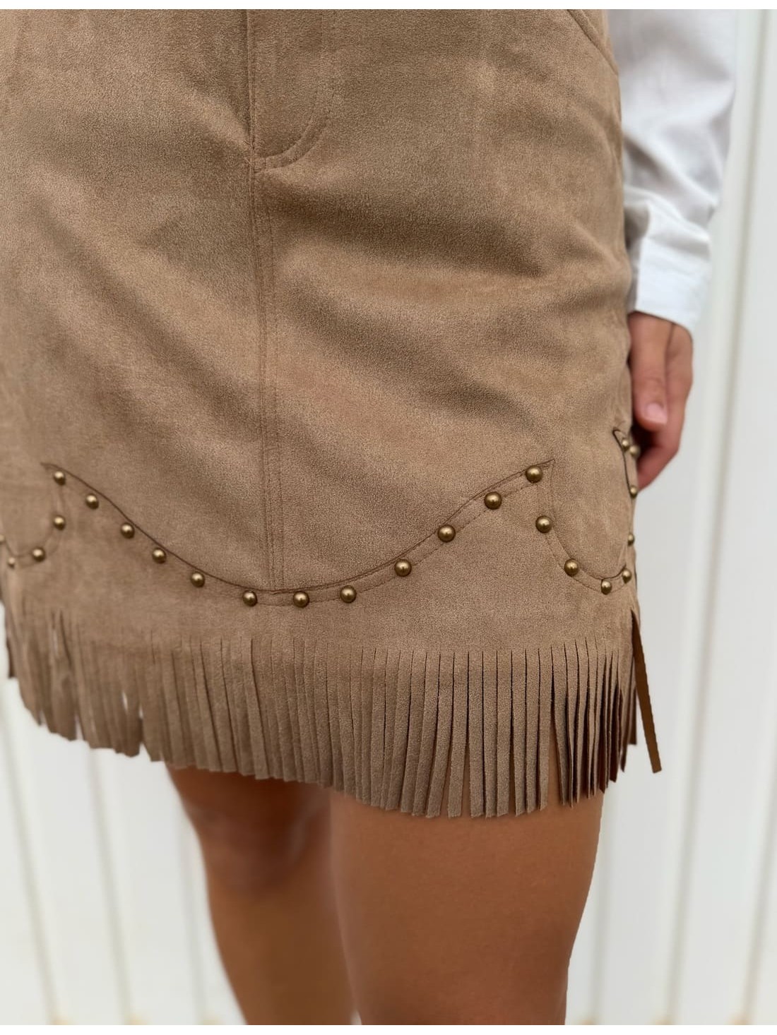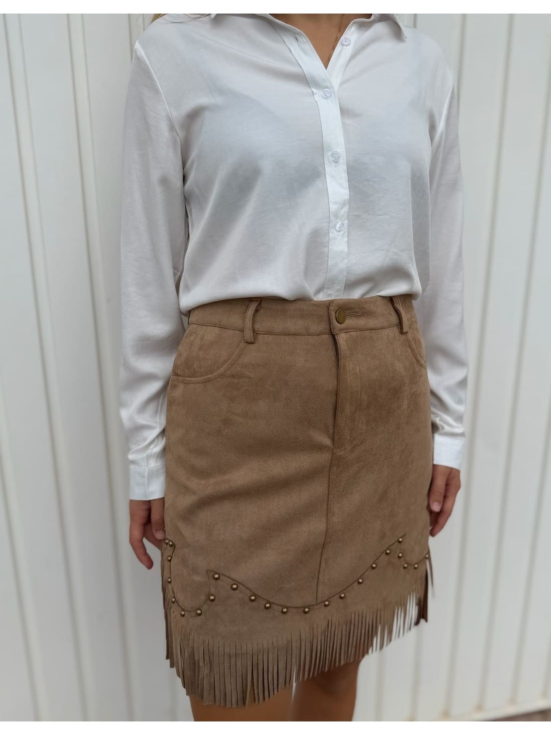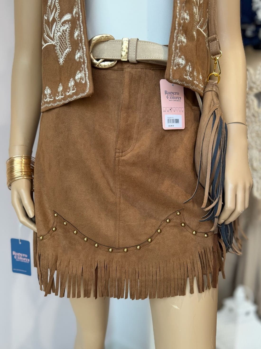 Falda corta de antelina muy bonita y original. Tiene dos bolsillos en la parte delantera.