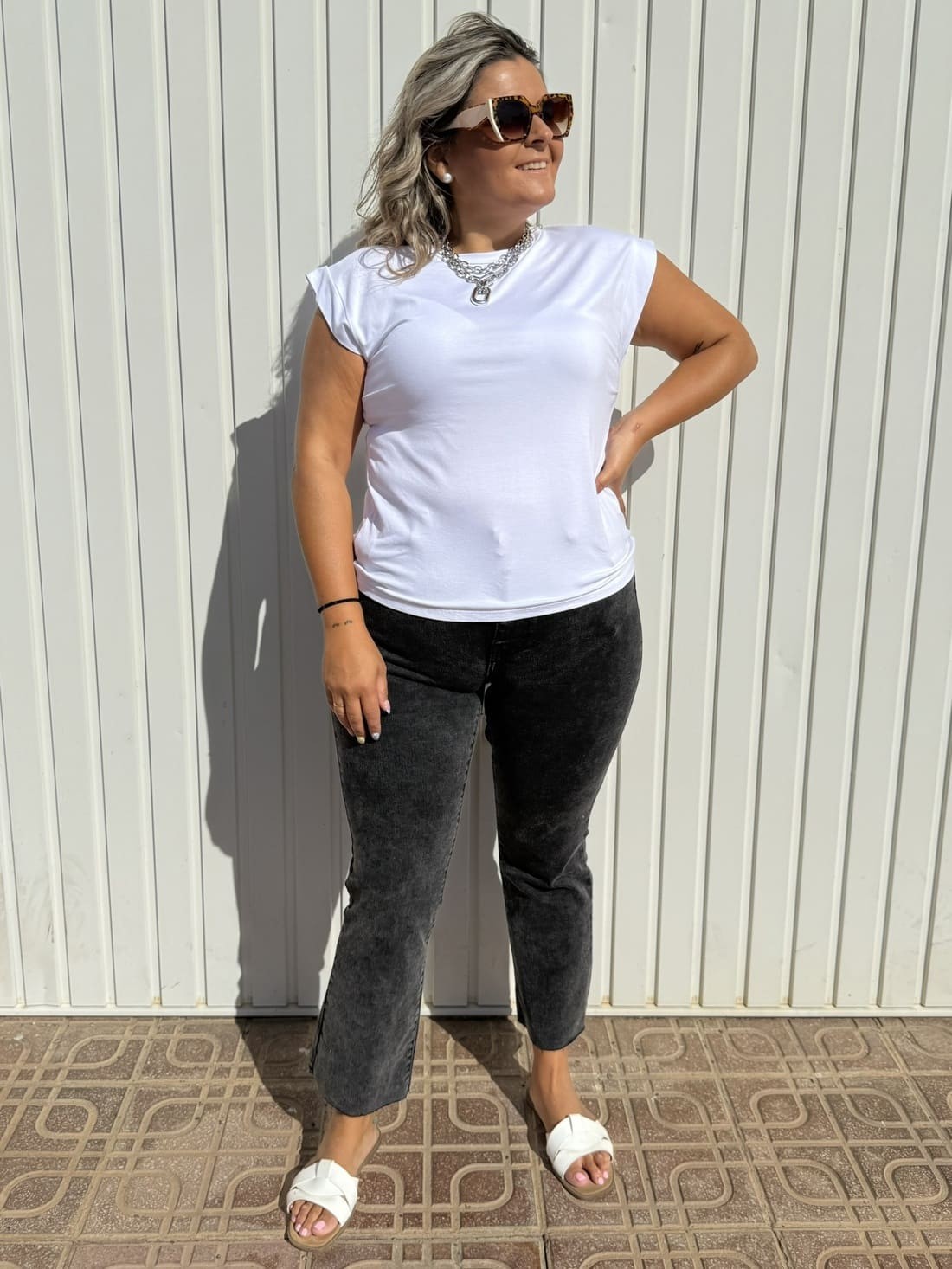 Pantalón estilo flared de tiro medio alto que sienta muy bien. Es desgastado, este color nunca deja de llevarse.