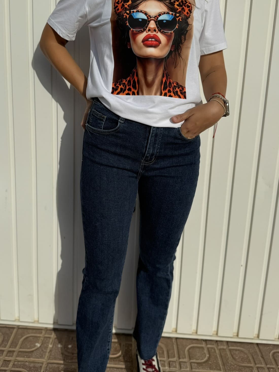 Pantalón vaquero de tiro medio alto, es flared, queda más ajustado de la cintura y más ancho de la pata.