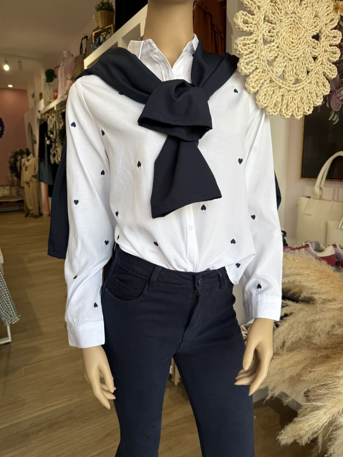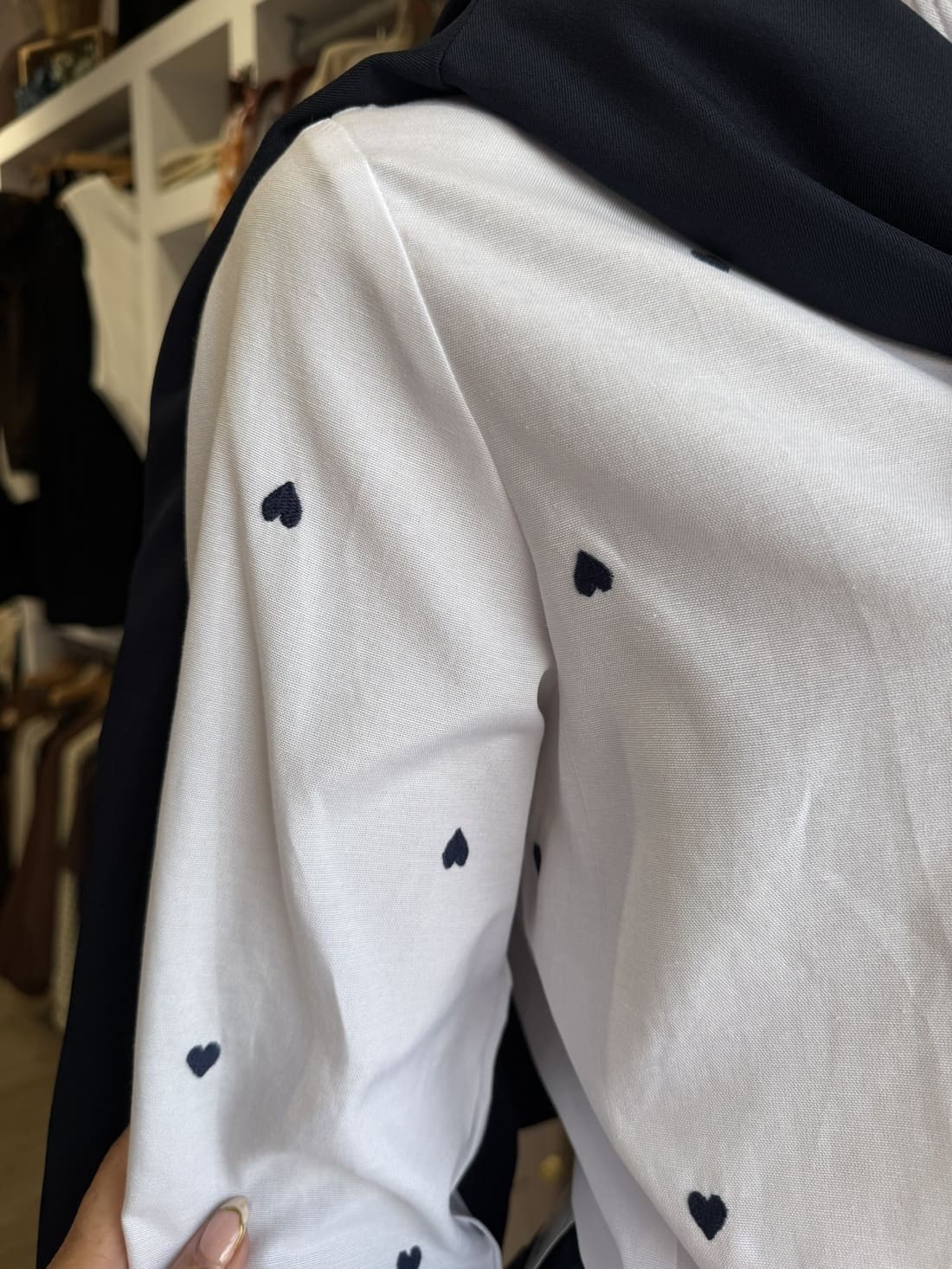 Es de color liso con detalle de corazones bordados en color azul marino sobre un fondo blanco.