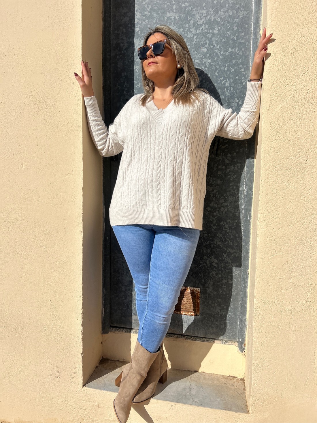 Jersey de manga larga y cuello en pico de color liso. Es de punto gordito muy calentito.