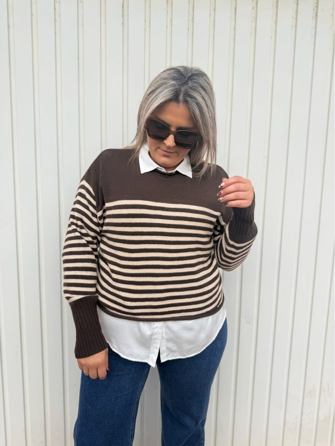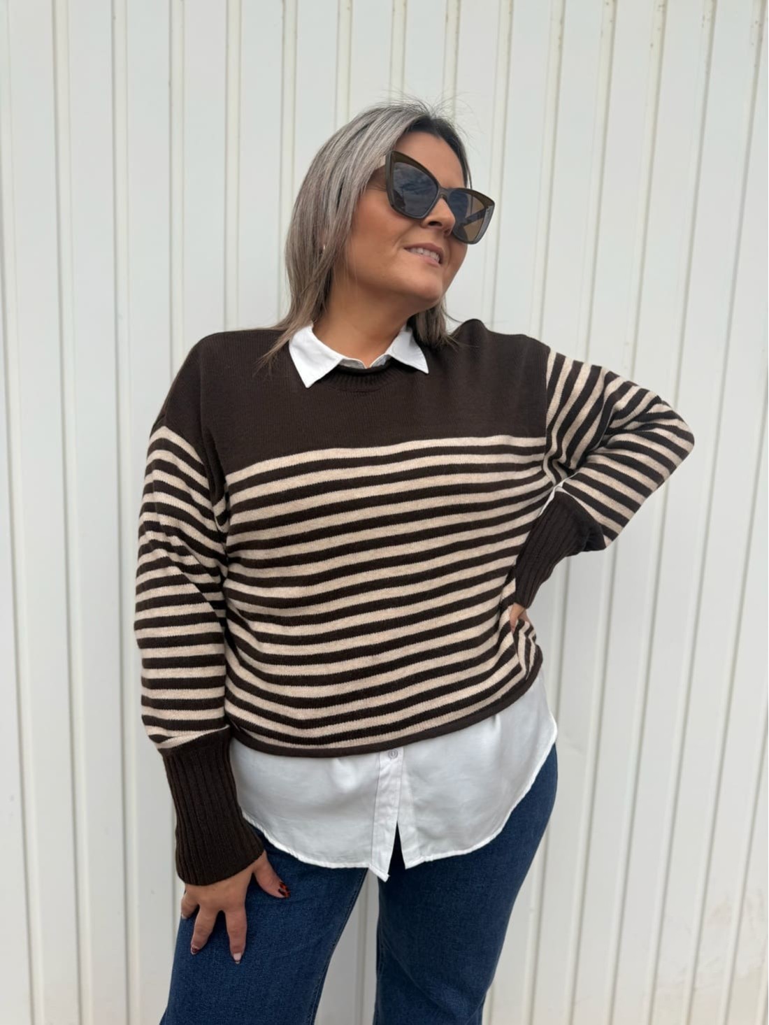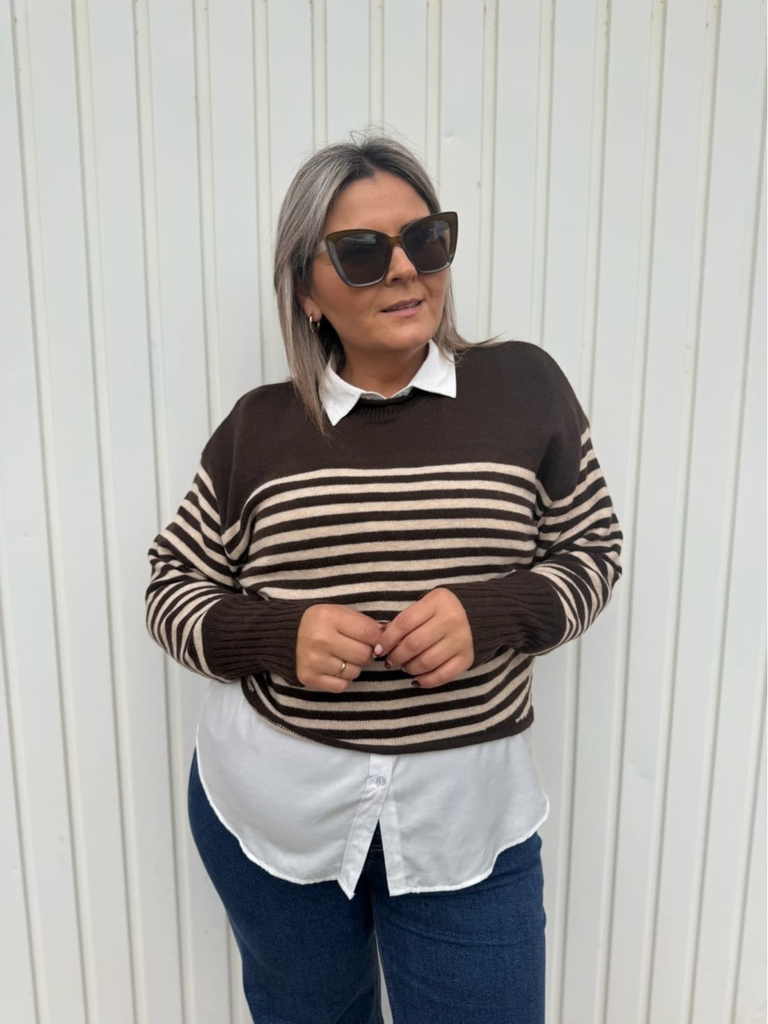 Jersey de manga larga y cuello redondo de rayas horizontal en la parte delantera en color beige sobre un fondo en color chocolate