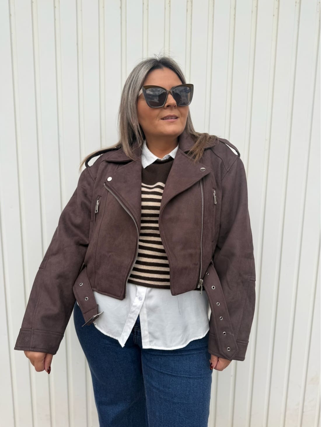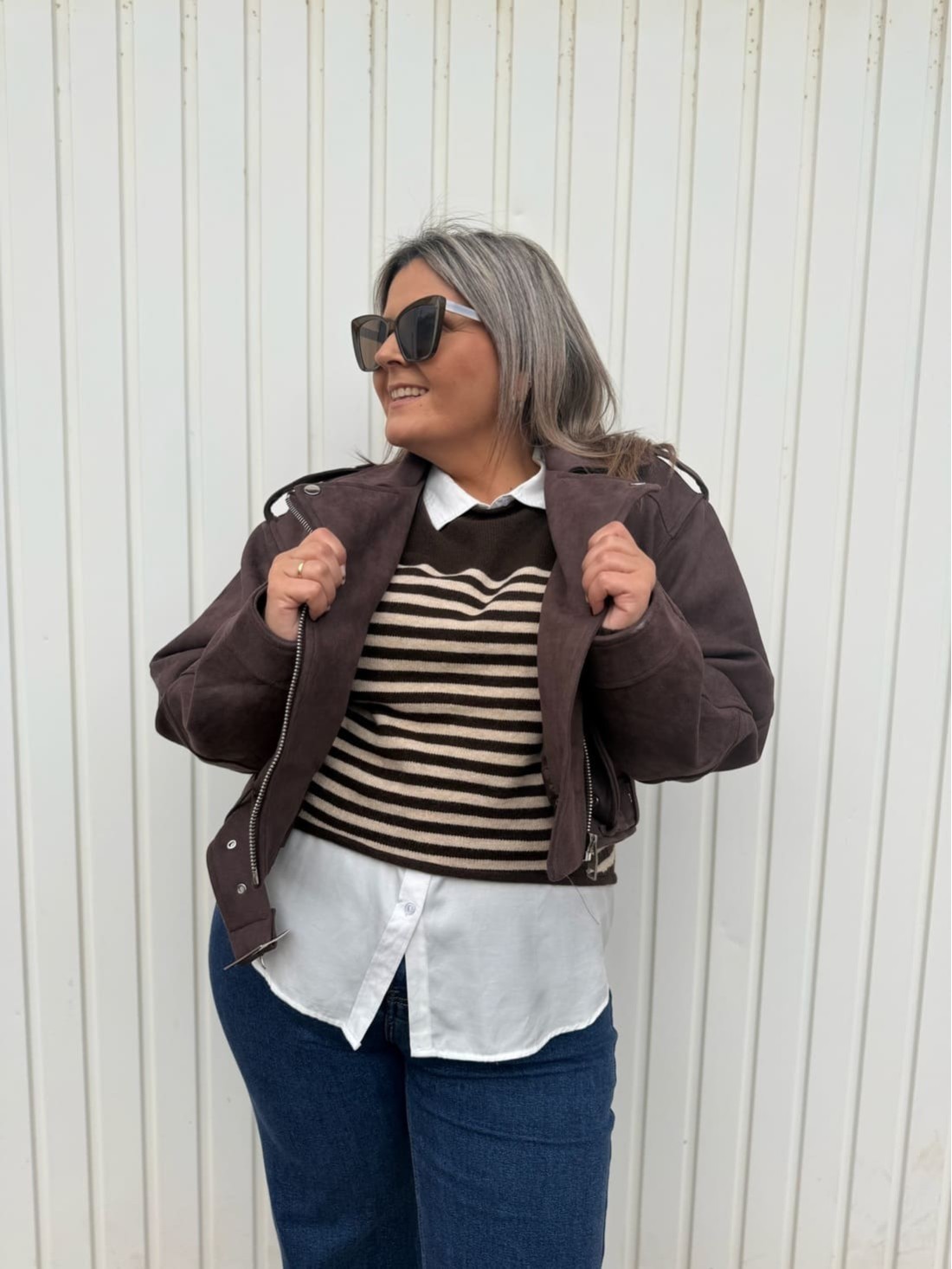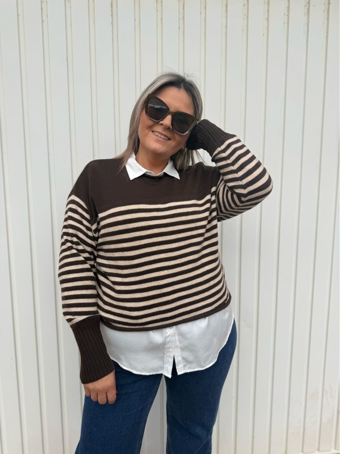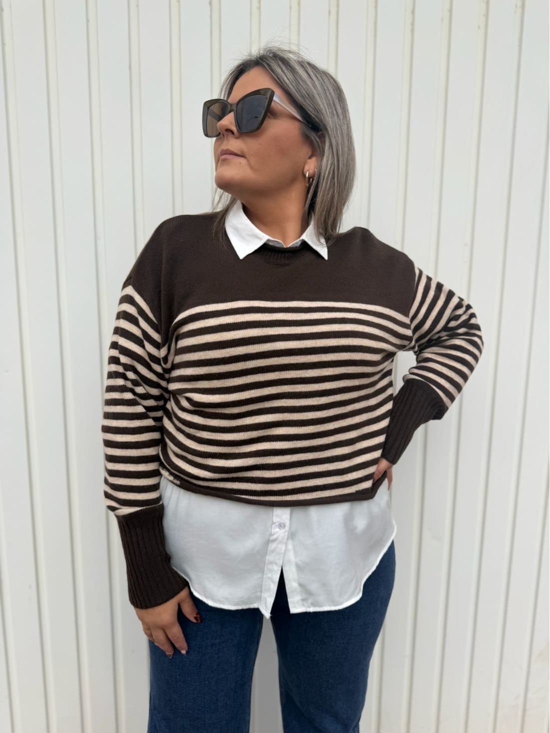 Jersey de manga larga y cuello redondo de rayas horizontal en la parte delantera en color beige sobre un fondo en color chocolate