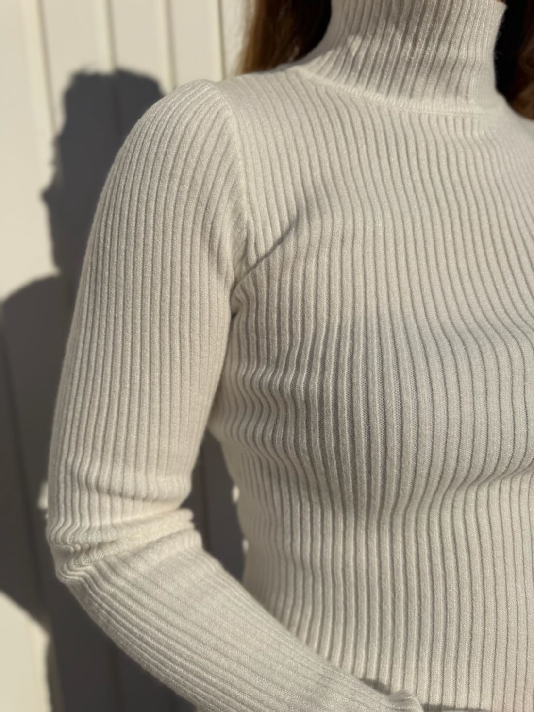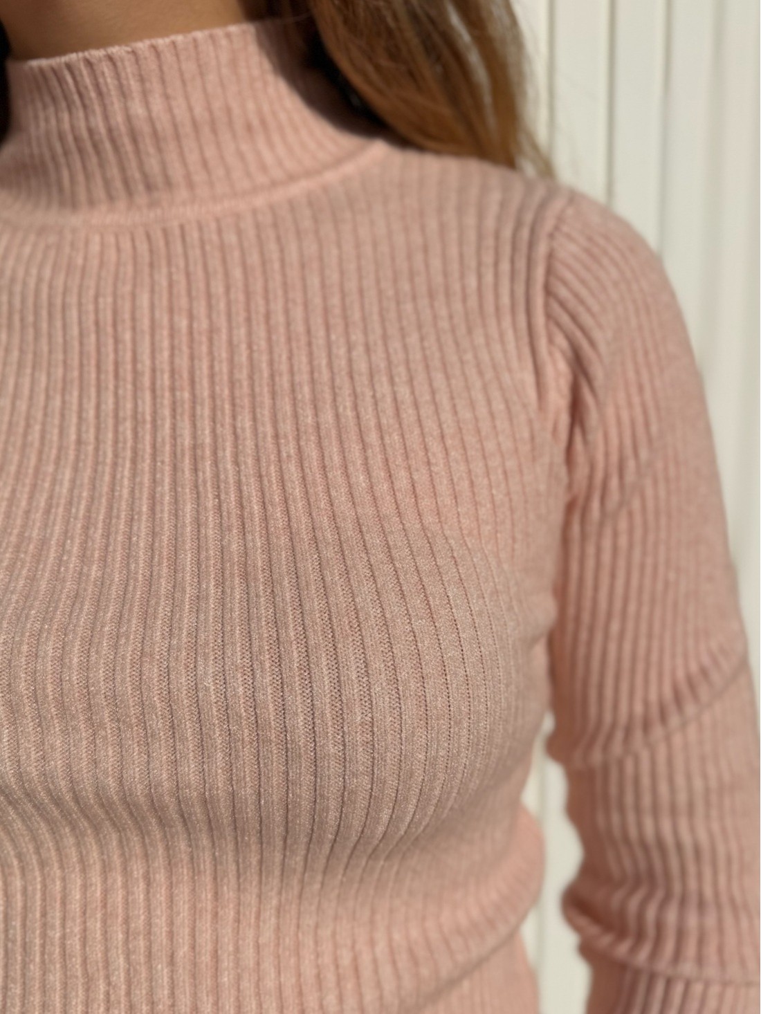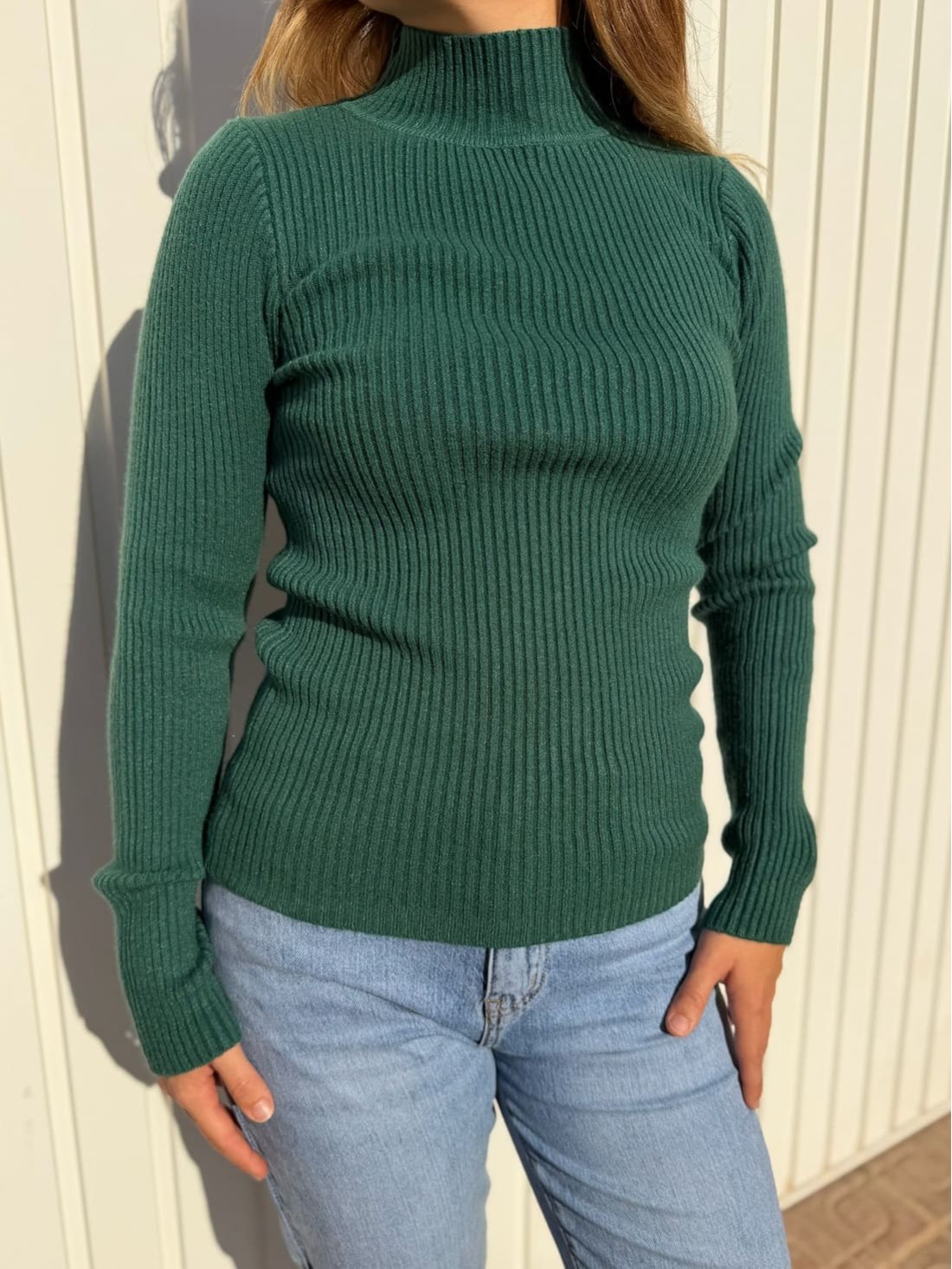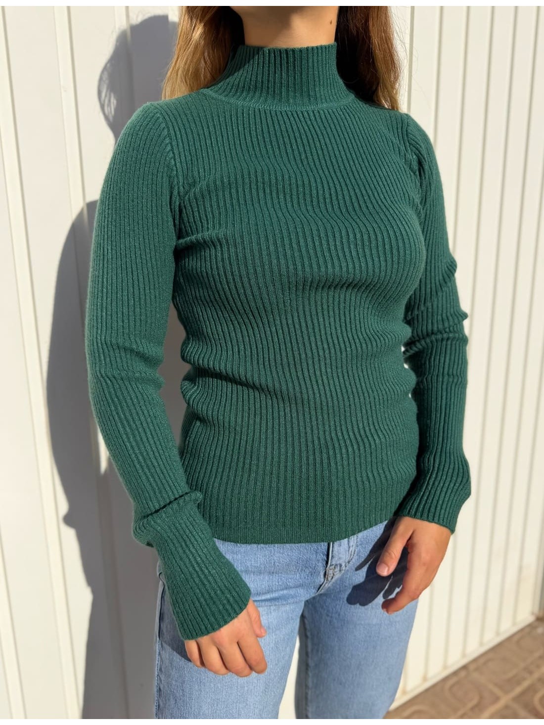 Es de color liso, con el cuello medio alto y de canalé.