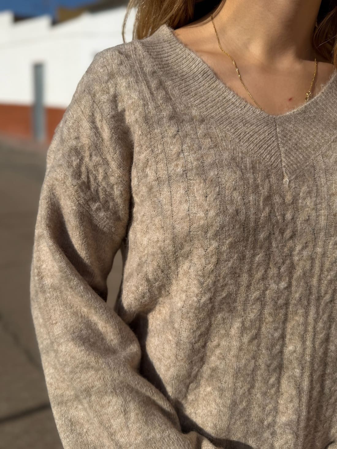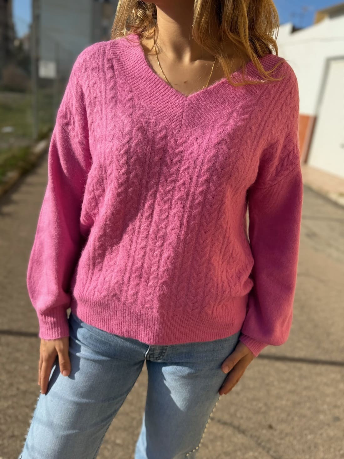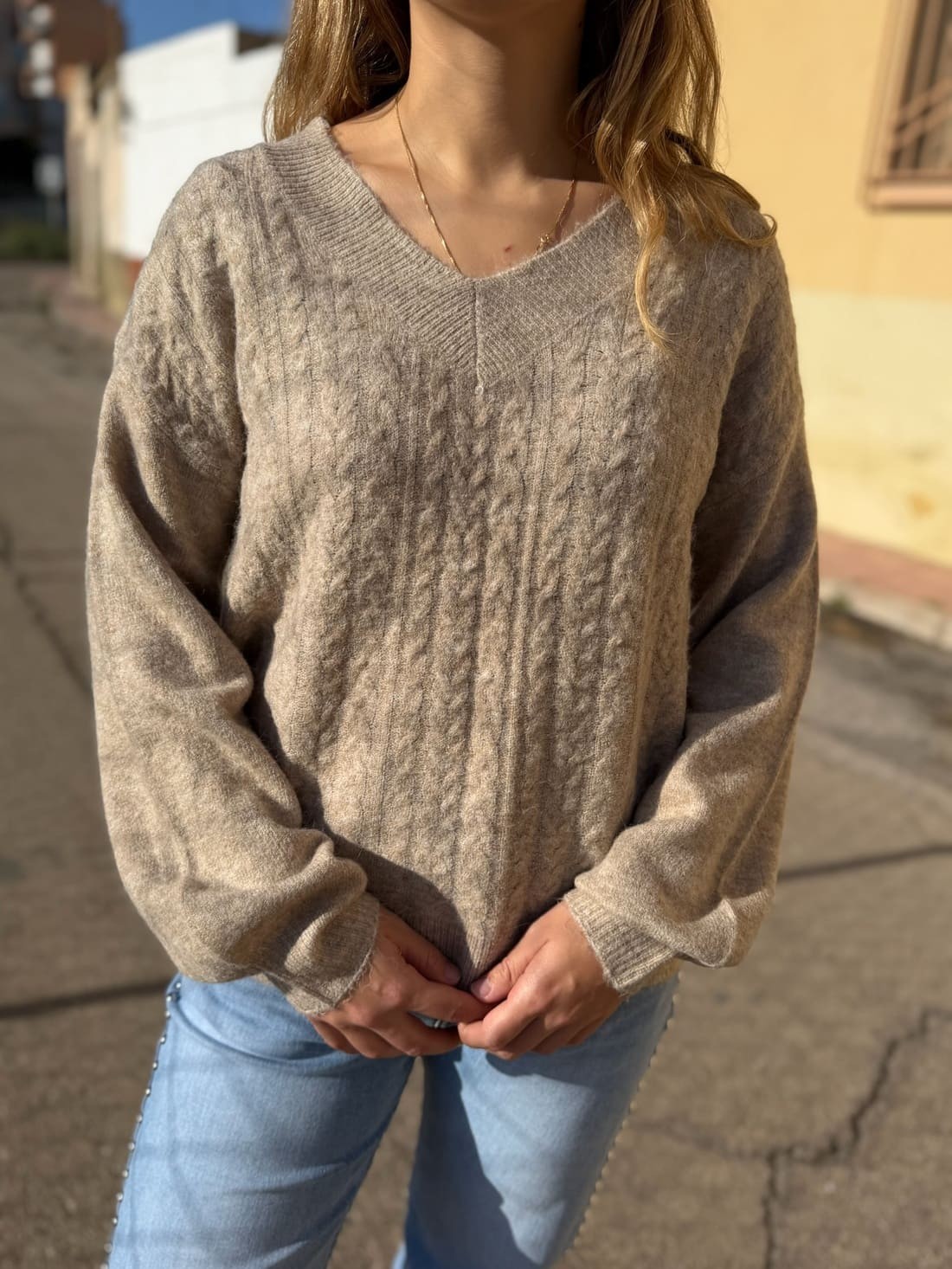 Jersey de manga larga y cuello en pico de un género de punto muy calentito y gustoso.