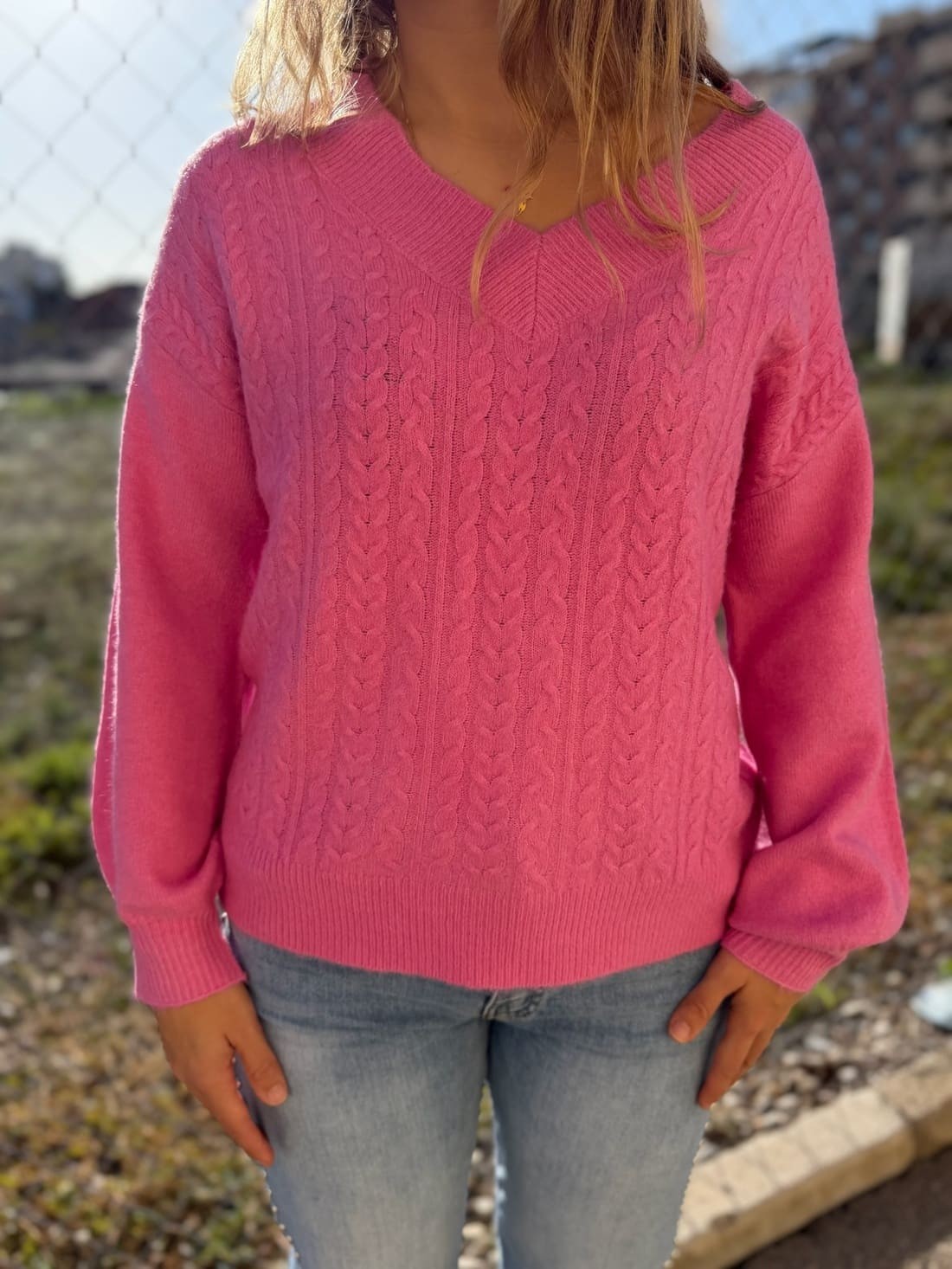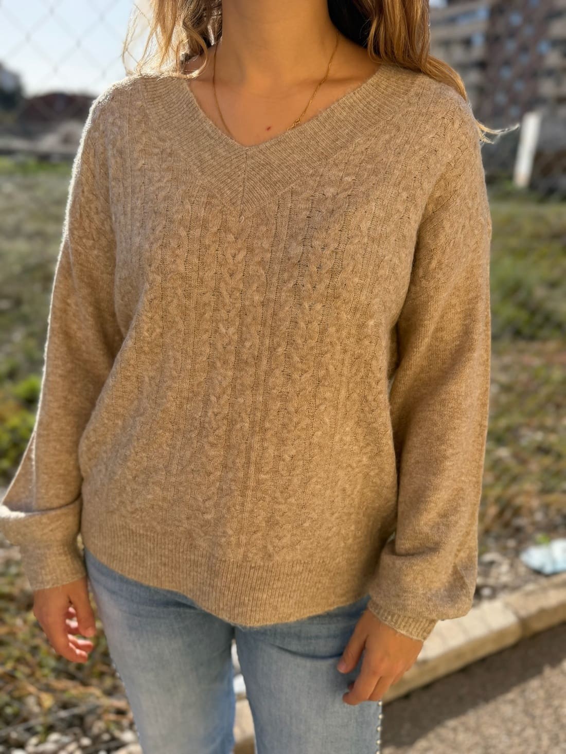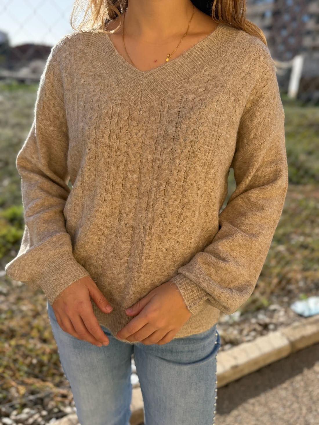 Jersey de manga larga y cuello en pico de un género de punto muy calentito y gustoso.