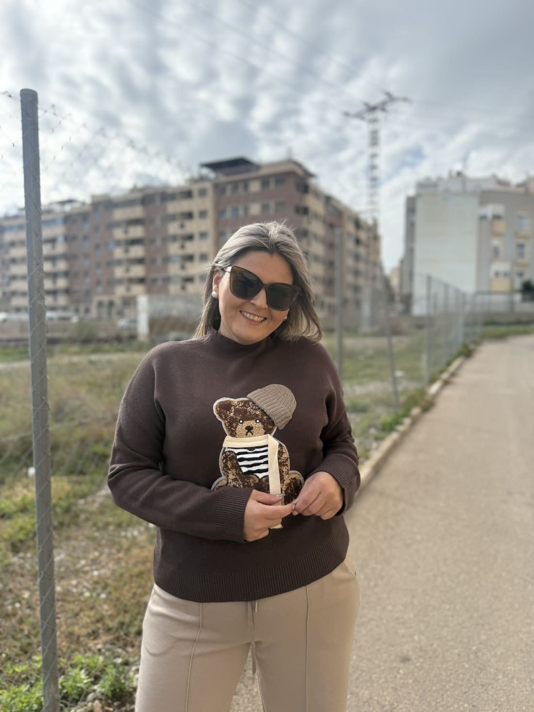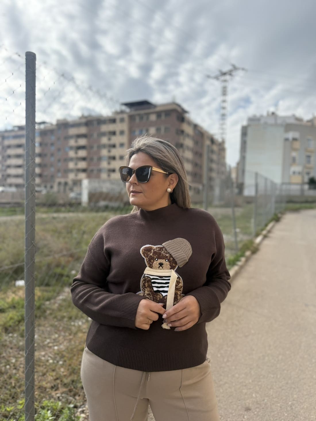 Tiene detalle de un oso en relieve y con distintos materiales en el pecho. El osito hace que el jersey sea una prenda más bonita.