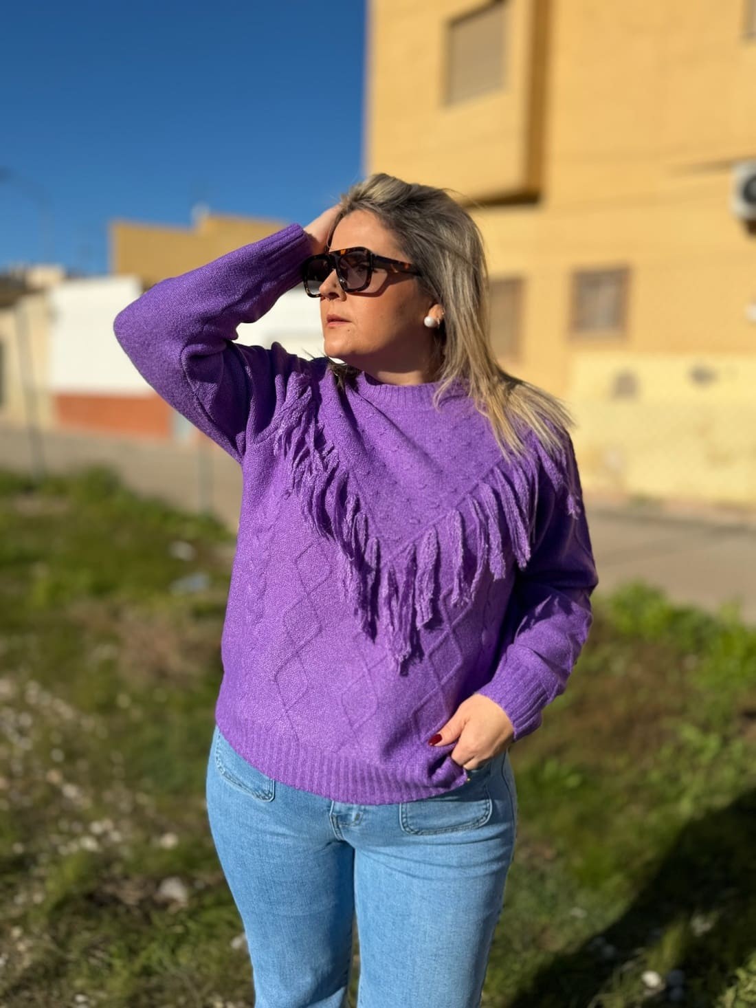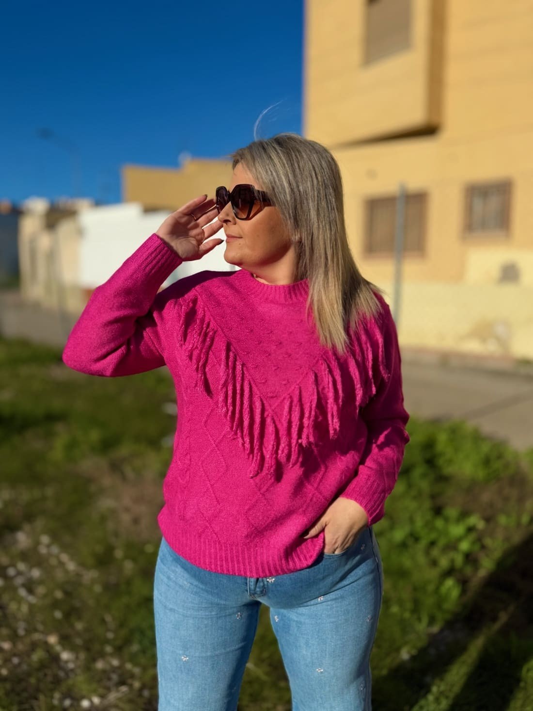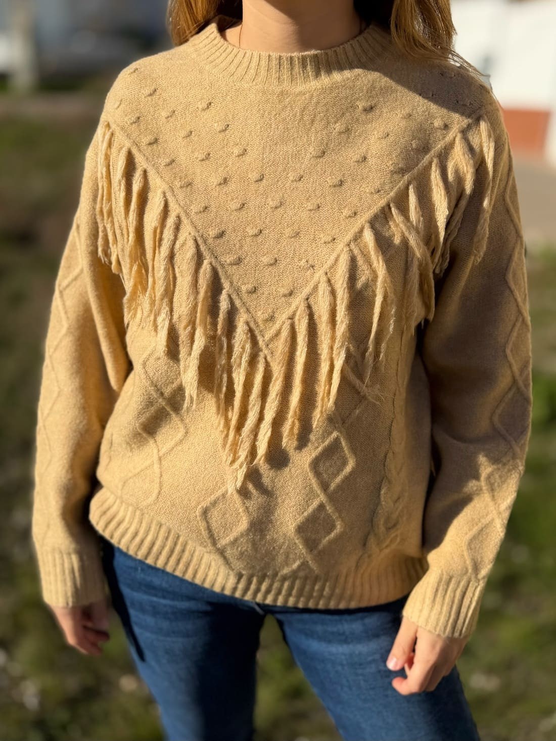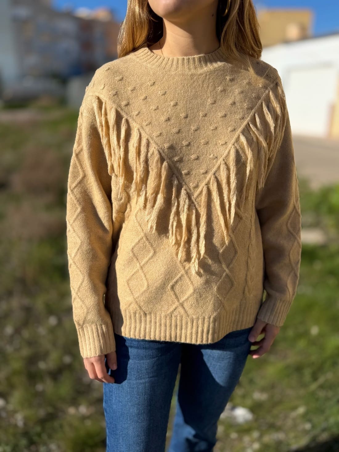 Tiene flecos en forma de pico justo debajo de las bolitas y la parte de abajo va haciendo trenzados y rombos. El resto es lisa.