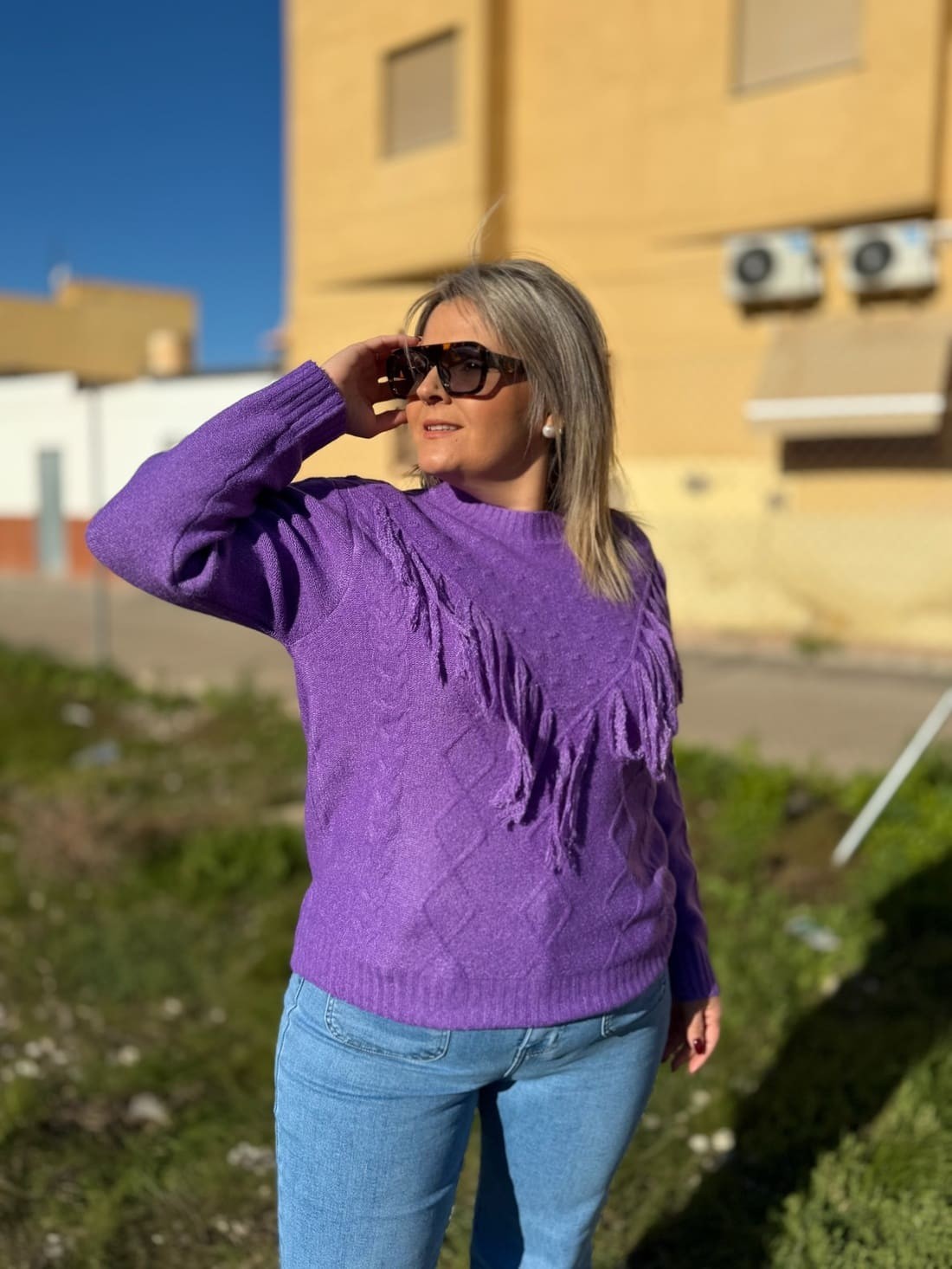 Jersey de manga larga y cuello redondo con detalle de medias bolitas en relieve en la parte delantera del pecho.