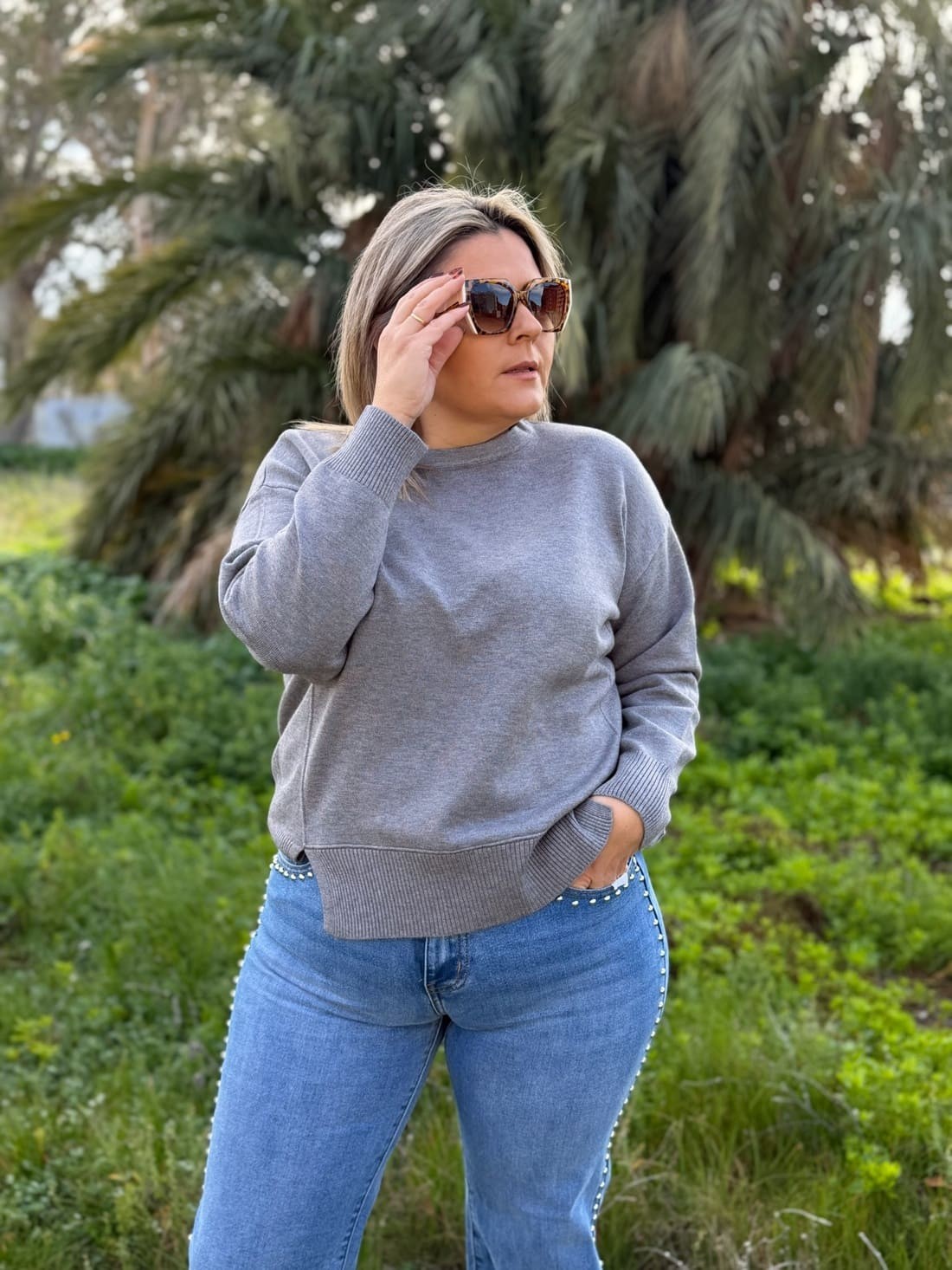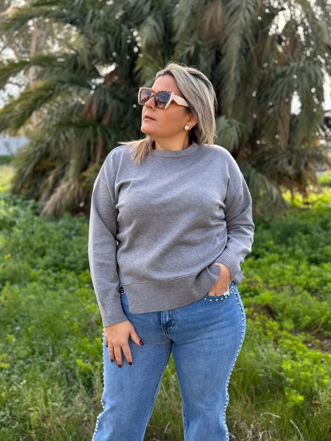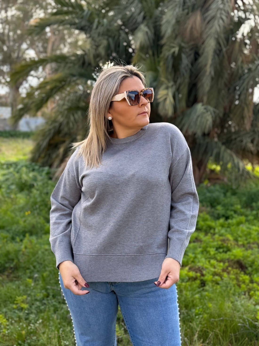 Es de cuello redondo y estilo oversize sin llegar a ser excesivo. El bajo es suelto con una abertura a cada lado.