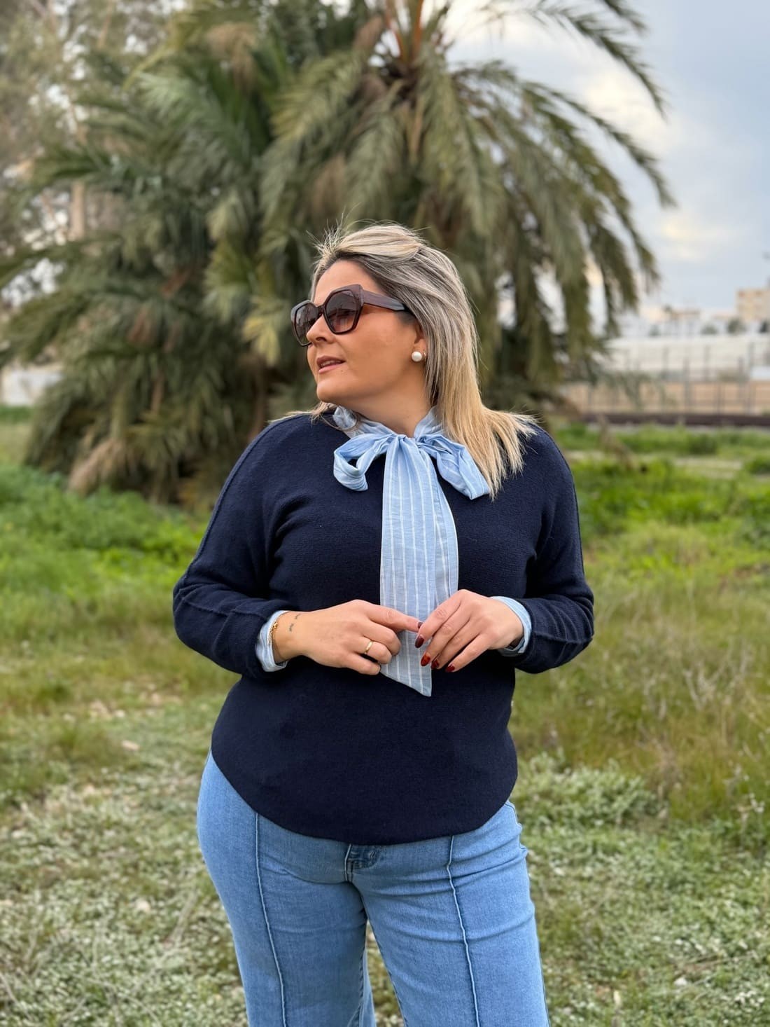 Jersey básico de cuello barco ideal para poner camisa debajo. Es de color liso.